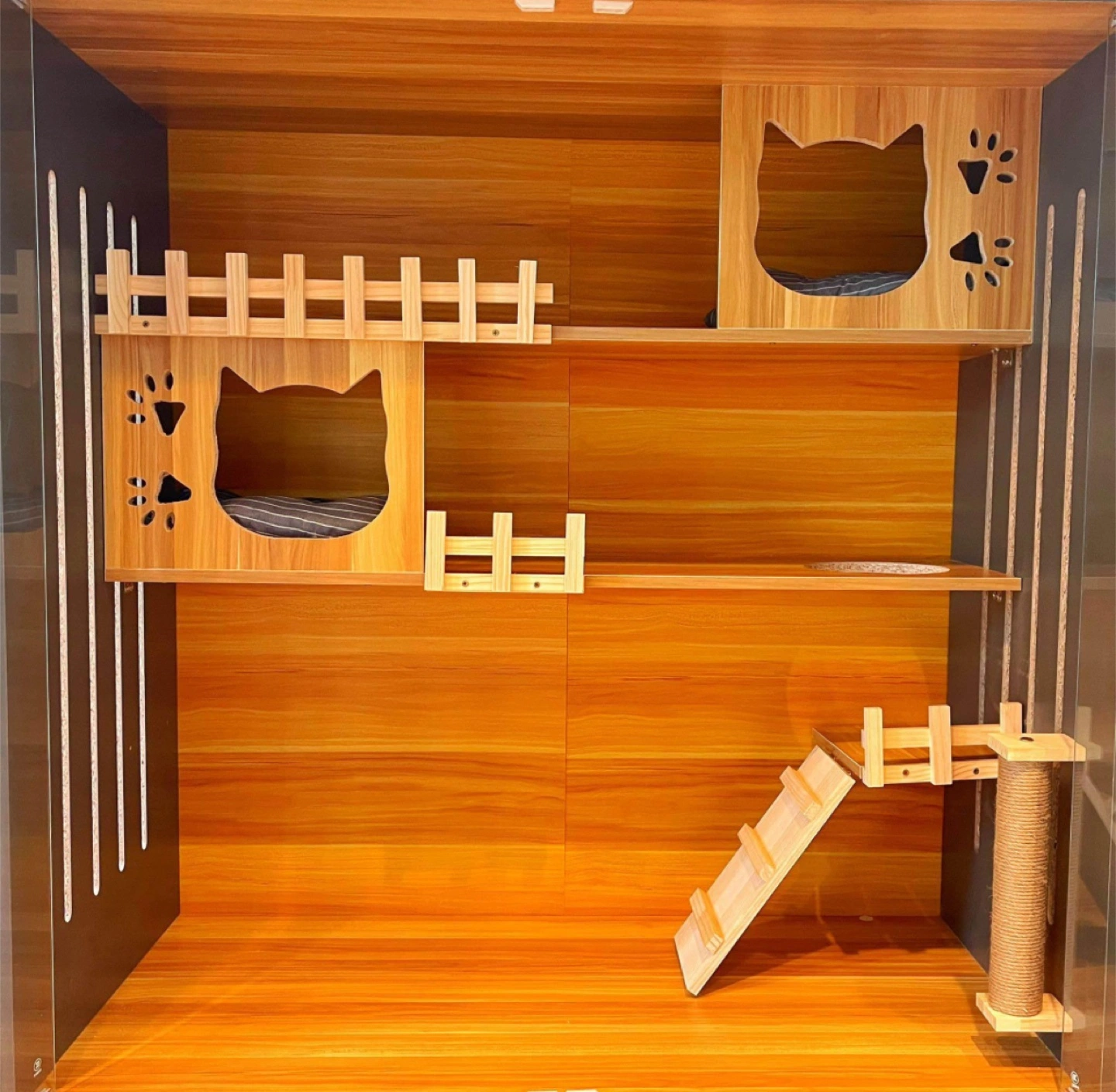 A gorgeous cat condo with different levels, perfect for any cat. Several cutouts in the shape of cats, with a scratching post and ramp. It will create a relaxed and cozy space for your furry friend. The unit is made of wood.
