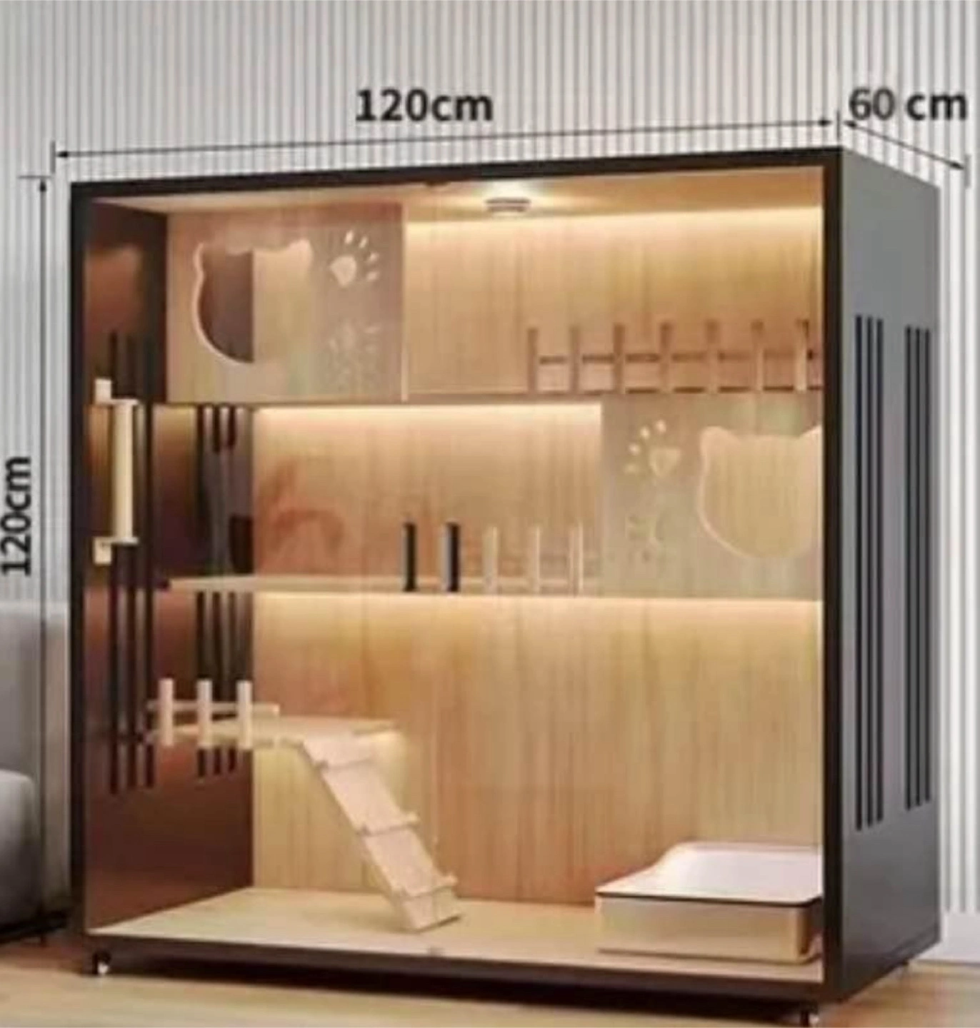 A gorgeous cat condo with different levels, perfect for any cat. Several cutouts in the shape of cats, with a scratching post and ramp. It will create a relaxed and cozy space for your furry friend. The unit is made of wood.