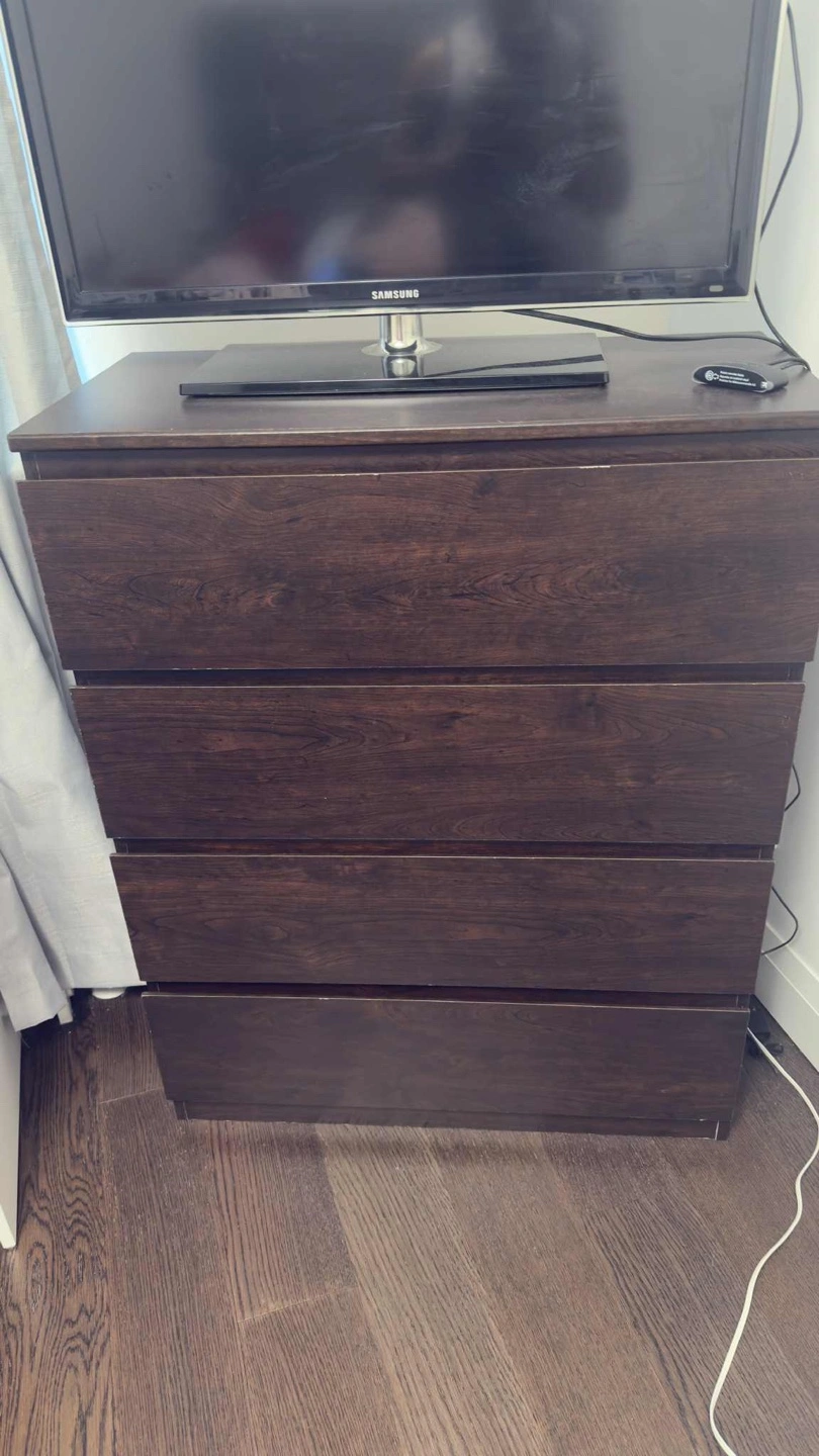 Selling a dark brown dresser with four drawers. It's in good condition and a great addition to any bedroom or living space! The dresser provides ample storage and a sleek, modern look for your home