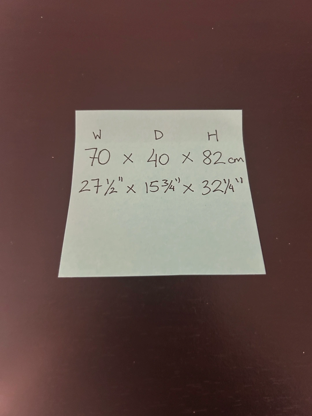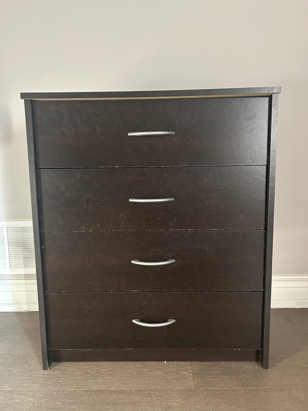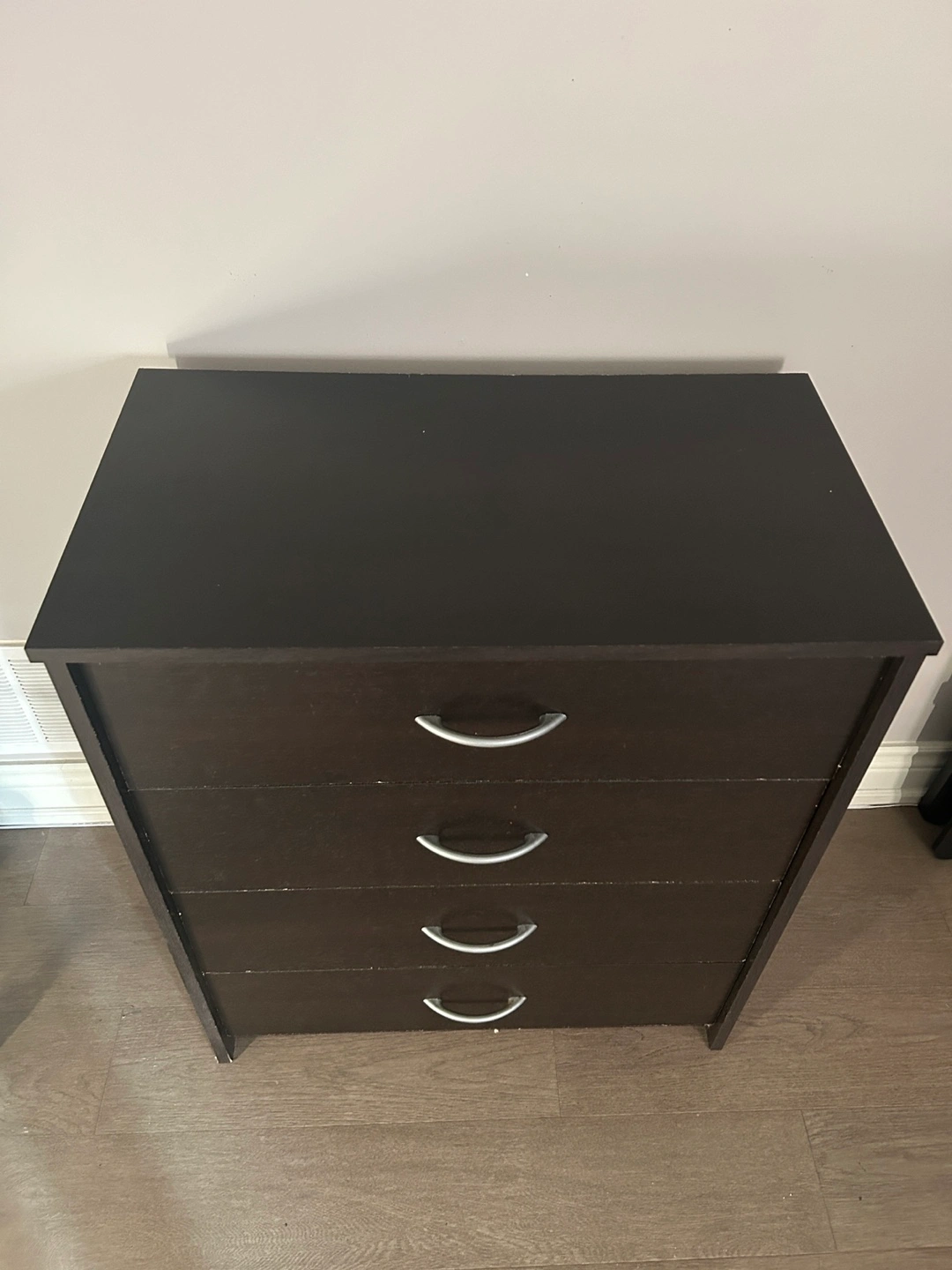 200Selling a dark brown dresser with four drawers. It's in great shape and ready for a new home! There’s minor scuffs on the surface, but no big damages. The dimensions are: - Width: 27 1/2 inches (70 cm) - Depth: 15 3/4 inches (40 cm) - Height: 32 1/4 inches (82 cm)