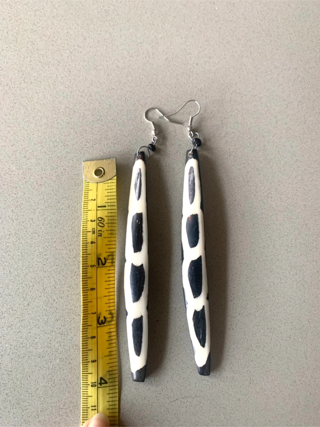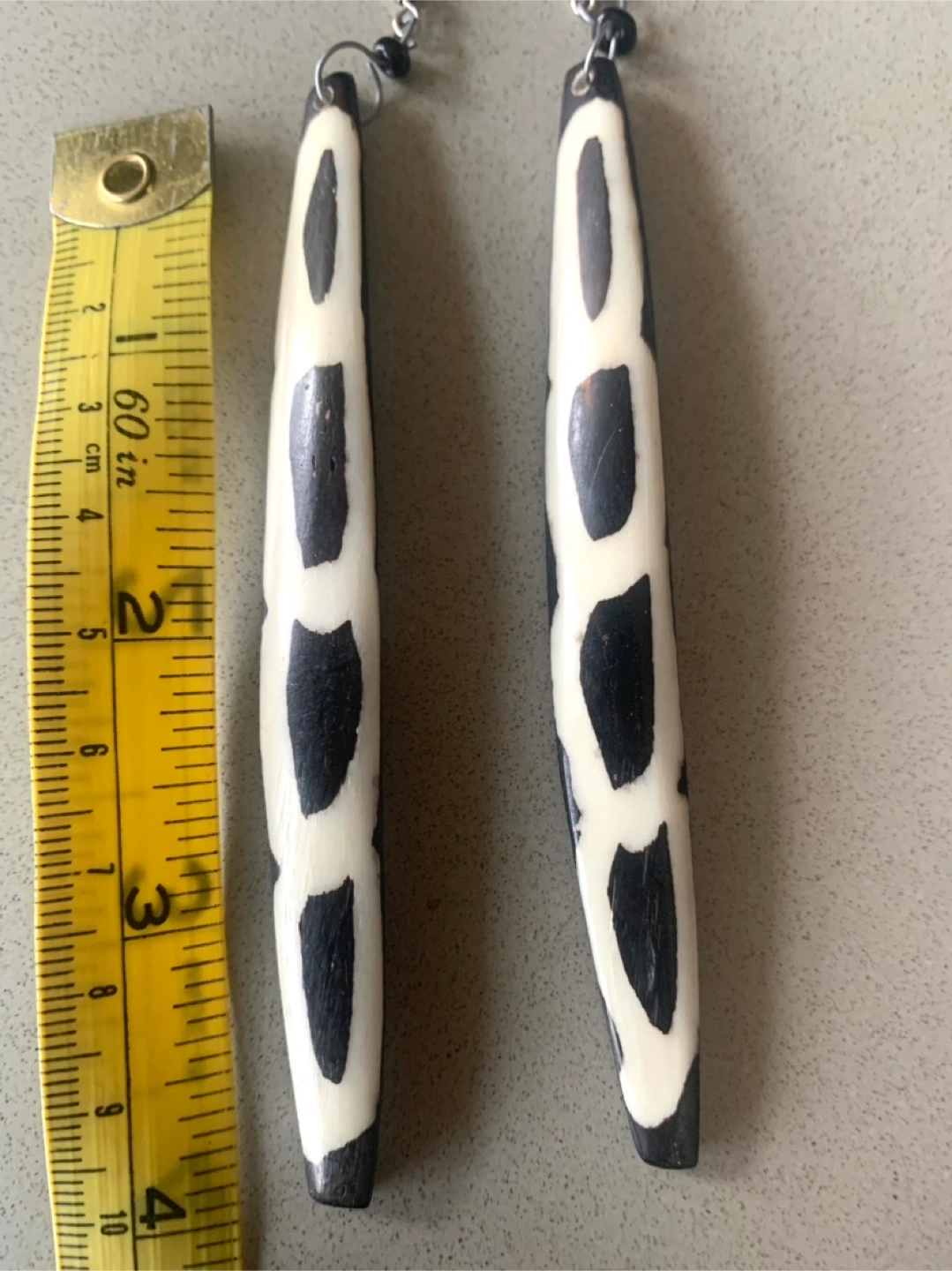 Unique pair of long dangle earrings from Kenya, Africa. Looks Black and white in the photos but they are actually dark brown. Approximately 6cm long. Material unknown.