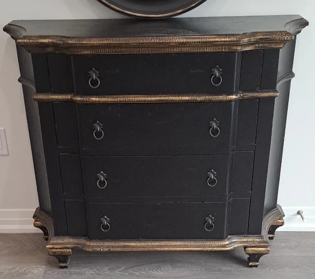98Selling a lovely dark brown dresser and round mirror with antique gold trim. It features four drawers with unique ring pulls. This dresser would be a beautiful addition to any bedroom or living space!