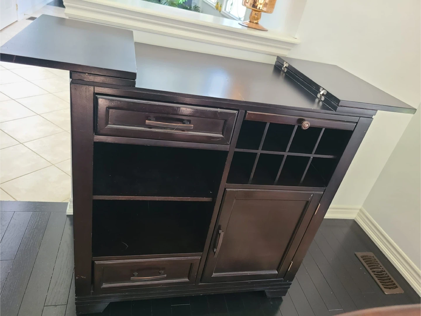 71Selling a dark brown bar cabinet that's perfect for storing your favourite drinks and glassware! It features a convenient wine rack and storage space for bottles and accessories. The cabinet also has a drawer and a door for concealed storage. It's in good condition and ready to add some style to your home!