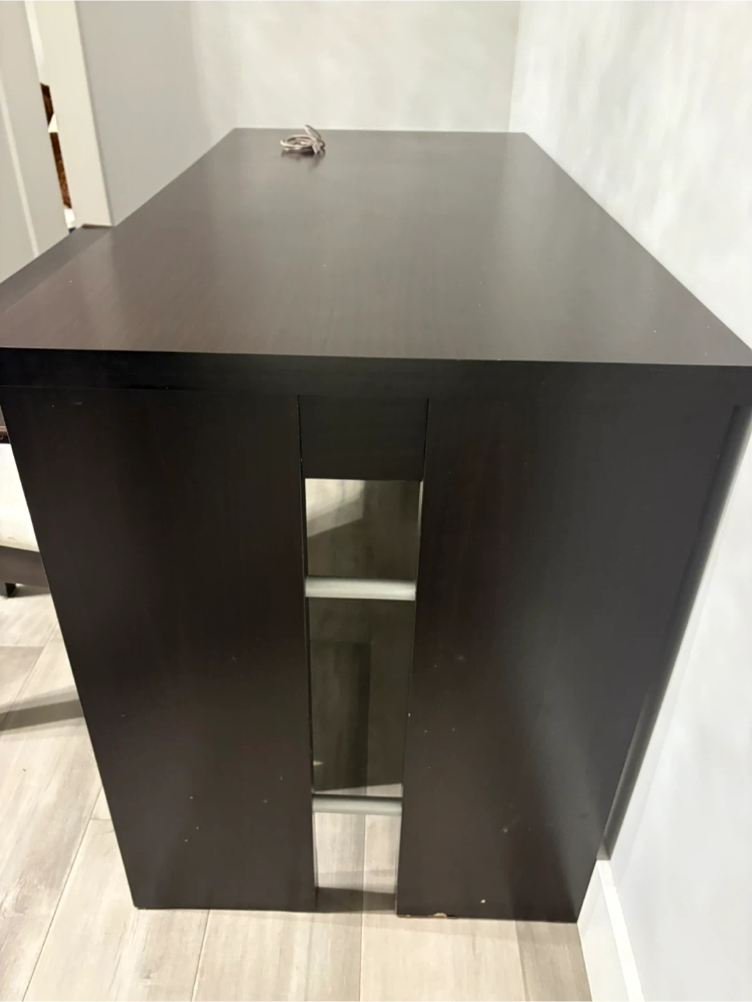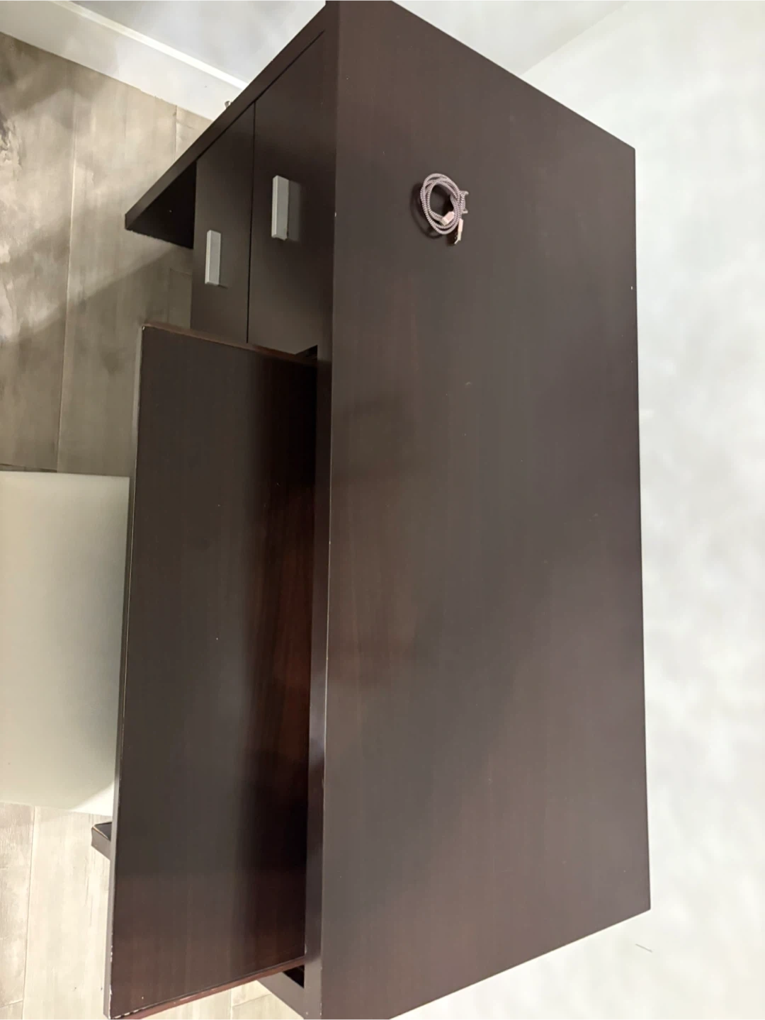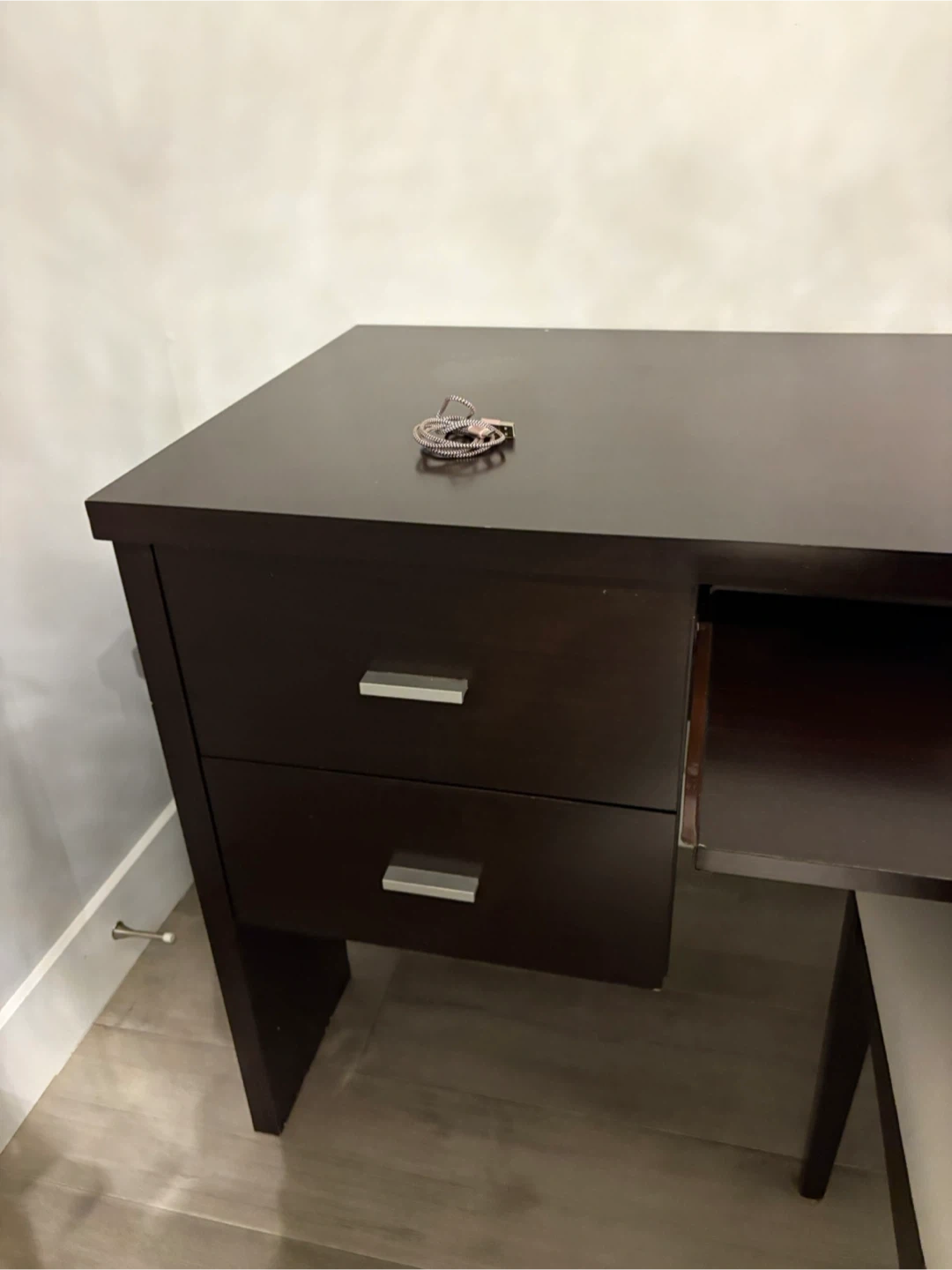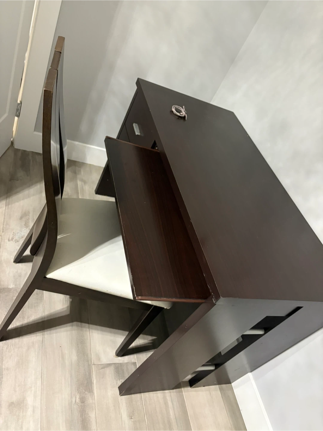 95Selling a dark brown desk with a matching chair. The desk has drawers for storage and a pull-out writing surface. The chair has a white seat with spots on it. Perfect for a home office or study space! Must be able to pick up Friday Nov 7 in the morning in Kitchner.