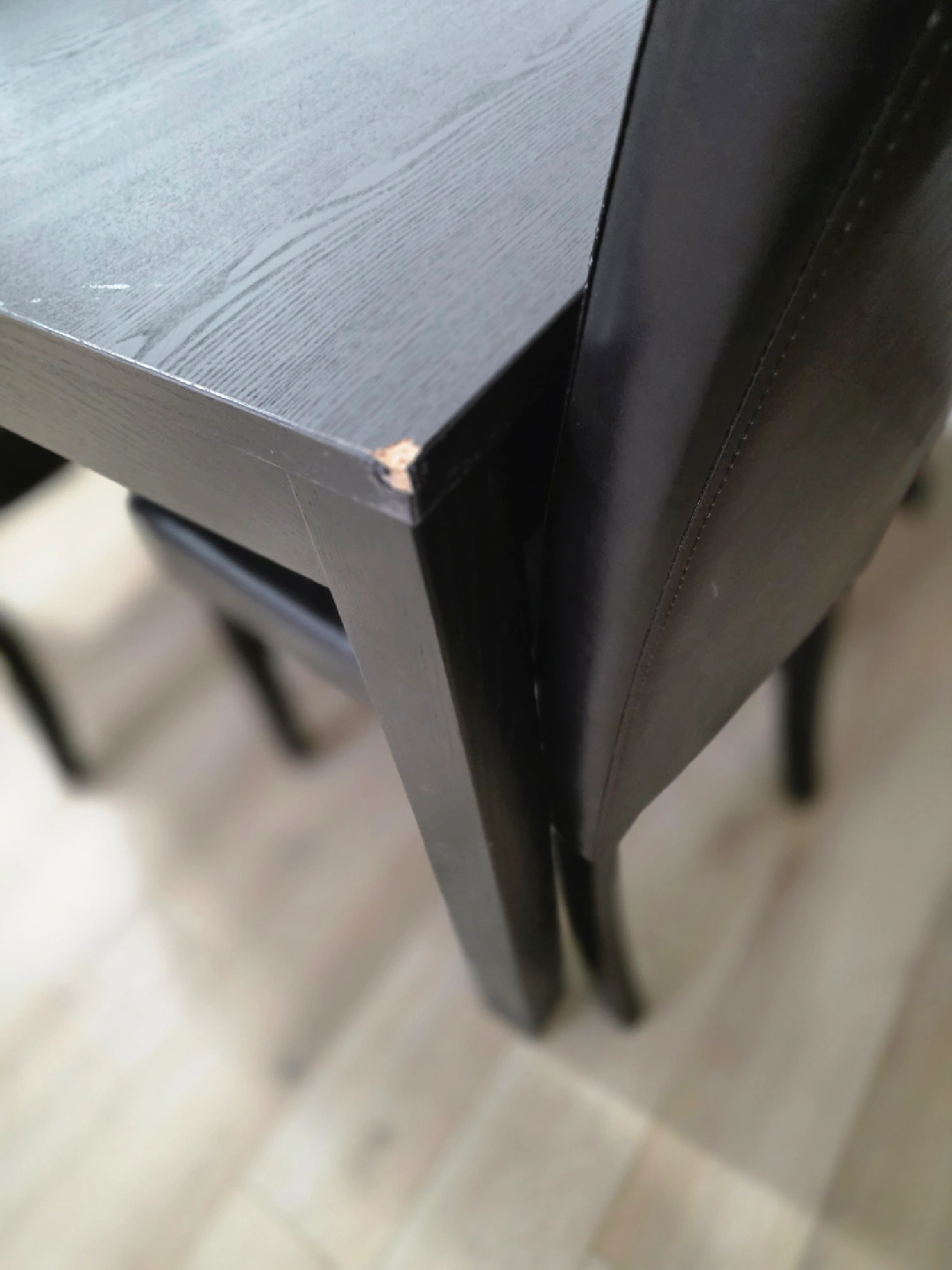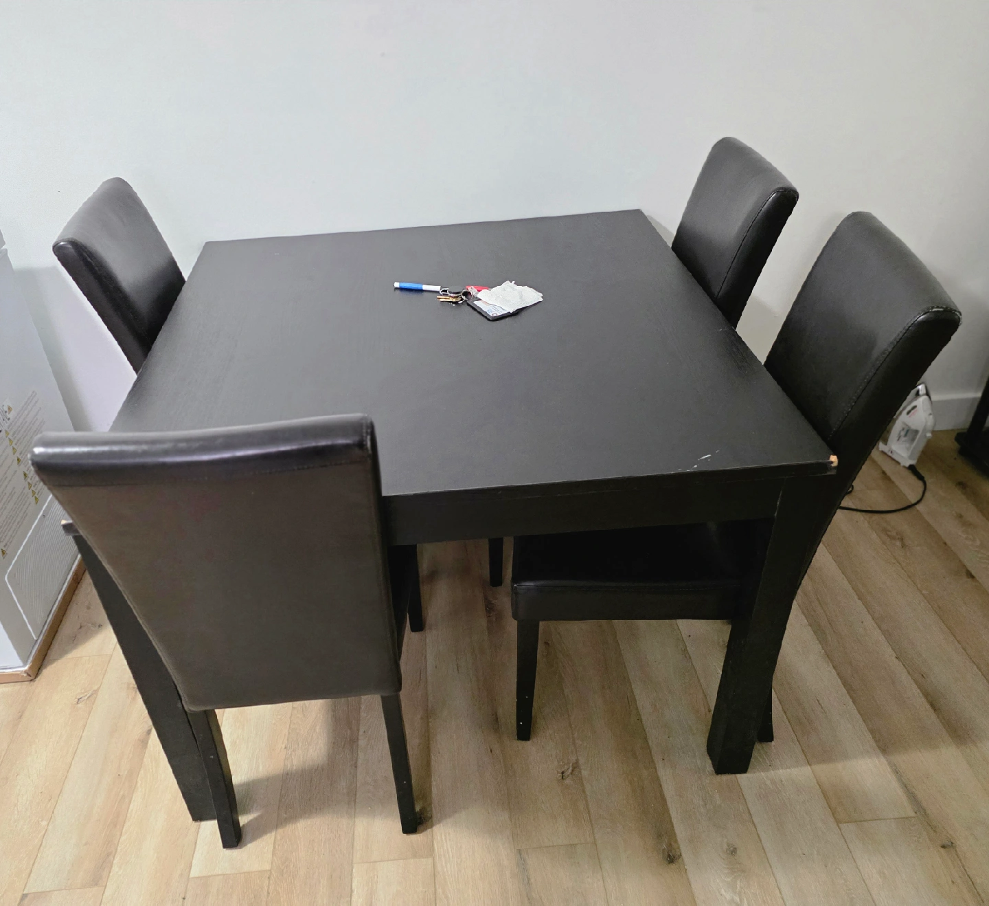 70Selling a dark brown dining table that comes with four matching chairs. The set has a wear and tear, as you can see in the pictures, but it's still sturdy and has lots of life left! Perfect for a small dining area or kitchen.