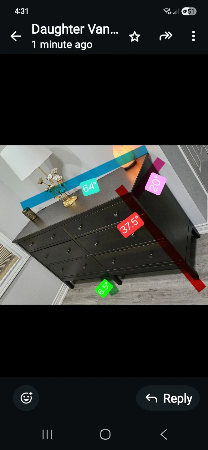 98Selling a dark brown solid wood, almost new, dresser! It's in great condition and has lots of storage space with its six drawers. Approximate dimensions: - Length: 64 inches - Height: 37.5 inches - Depth: 20 inches - Leg Height: 6.5 inches
