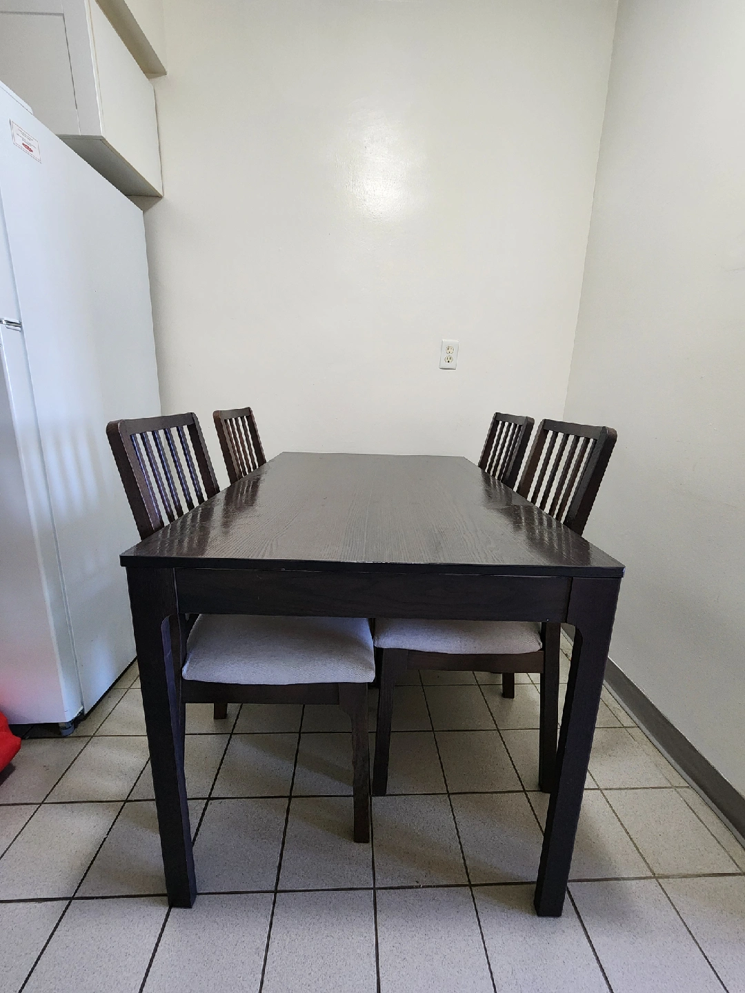 Selling a dark brown extendable dining table with four matching chairs. (Extendable up to 8 ppl) The set is in good condition and perfect for a small dining area. The chairs have a light-coloured fabric seat. One of the seat covers has an oil stain.