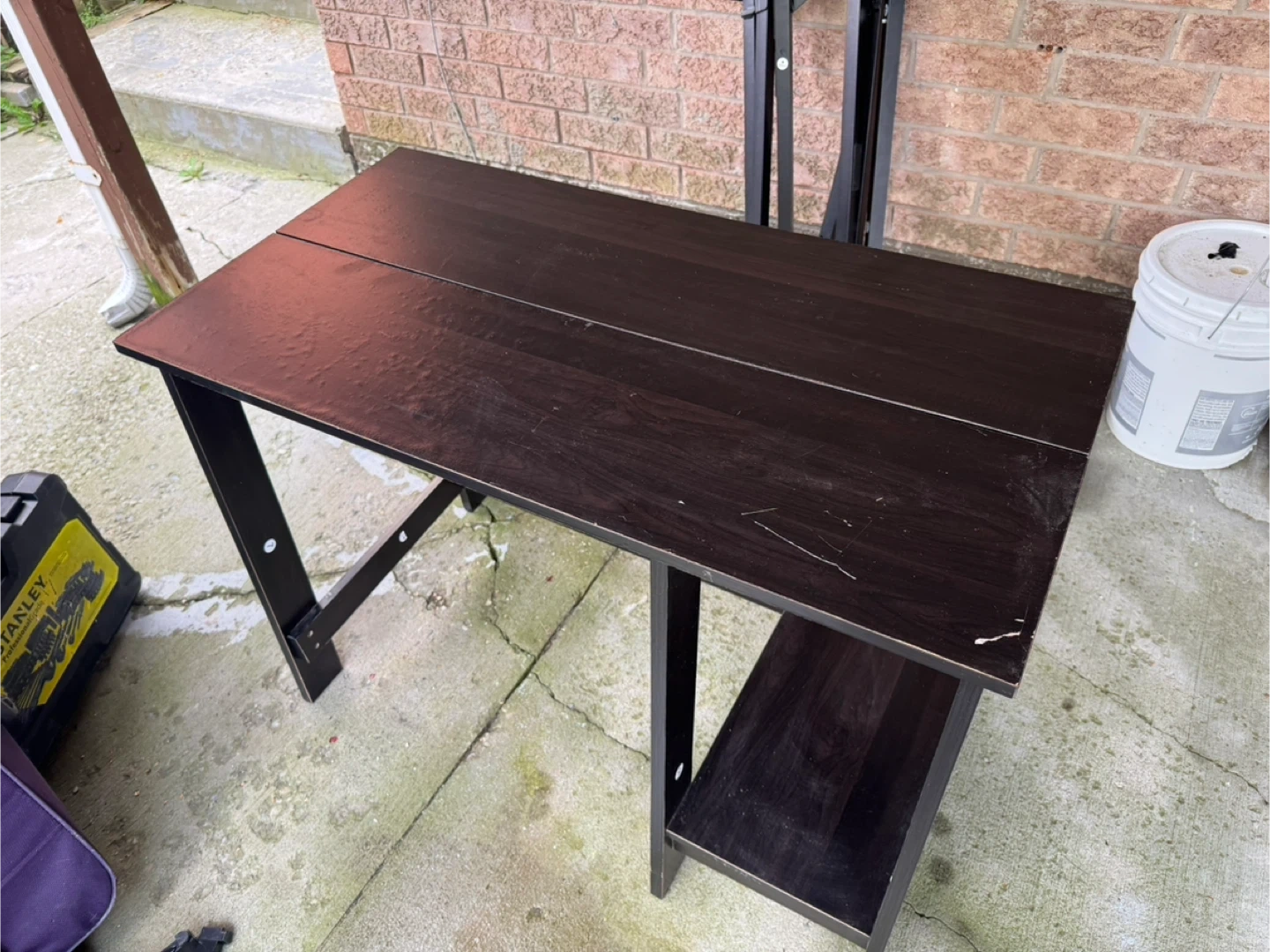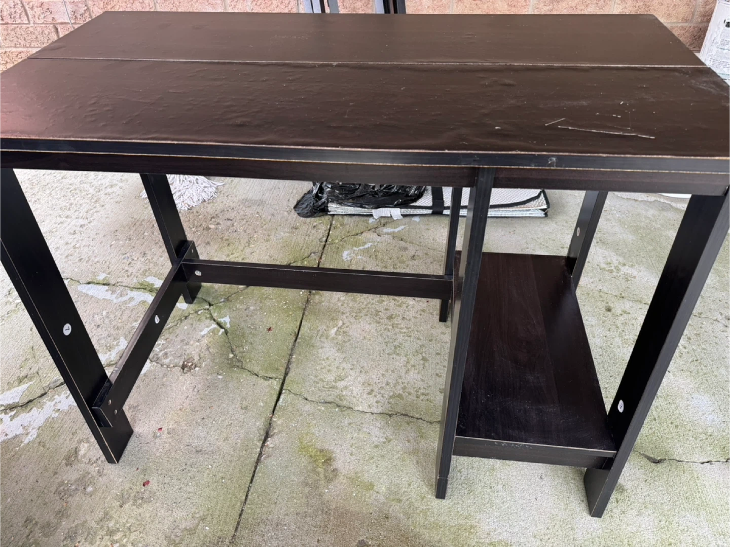 Selling a dark brown folding desk. It's in good condition and perfect for small spaces. Folds up easily for storage when not in use. Great for a home office or study area!