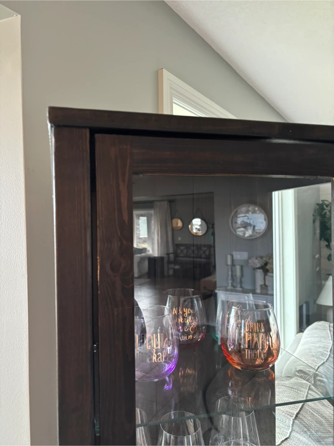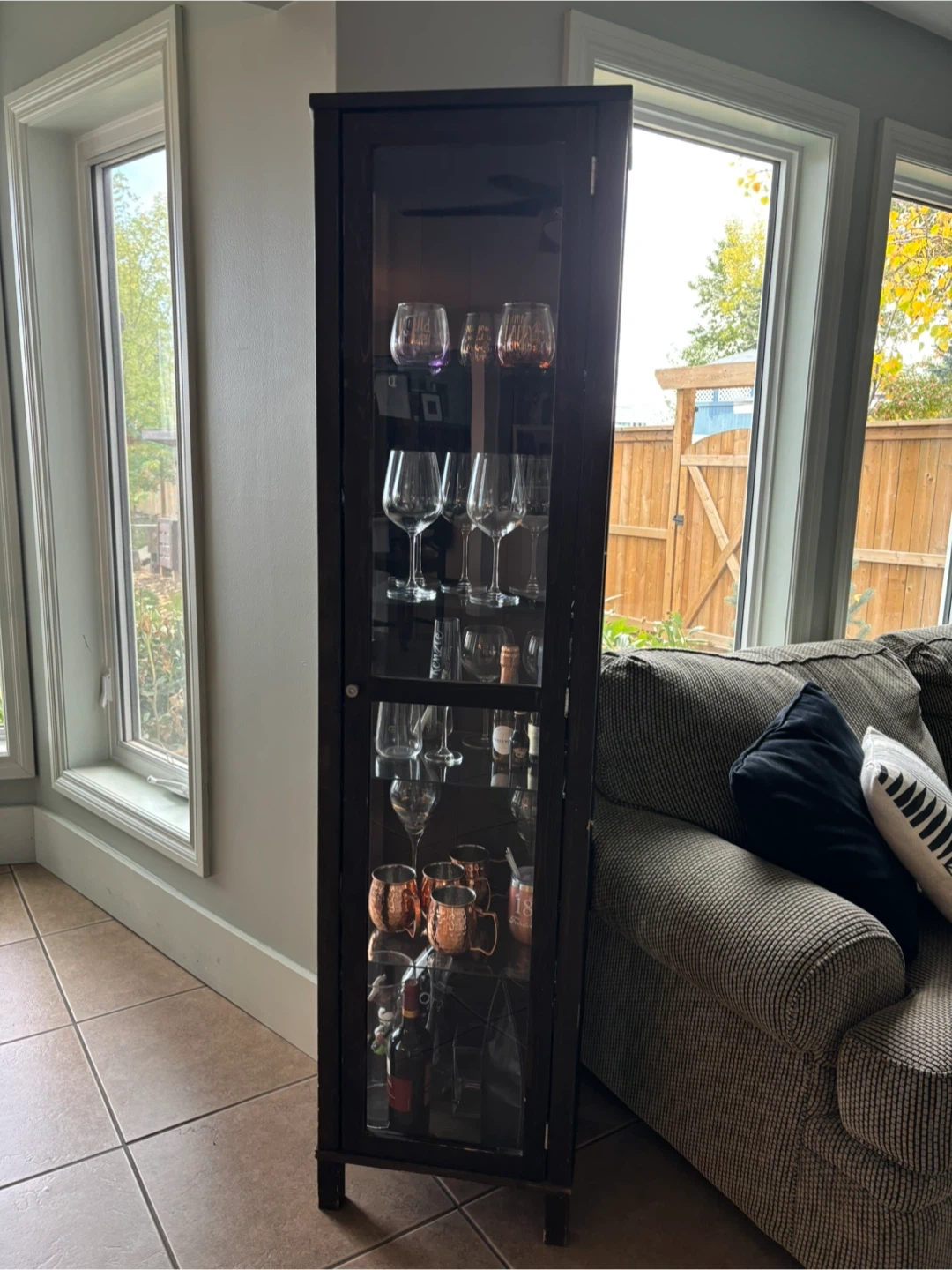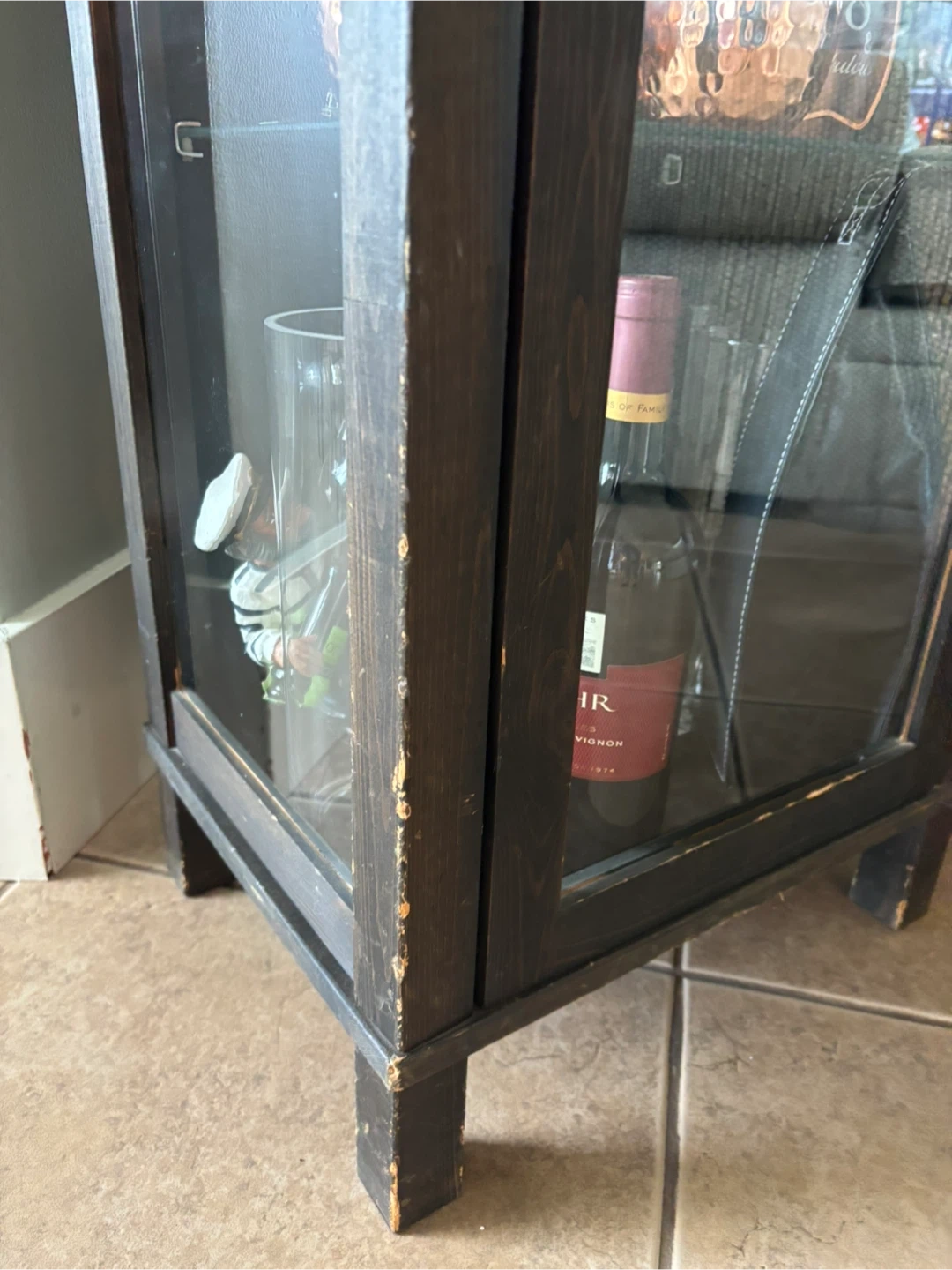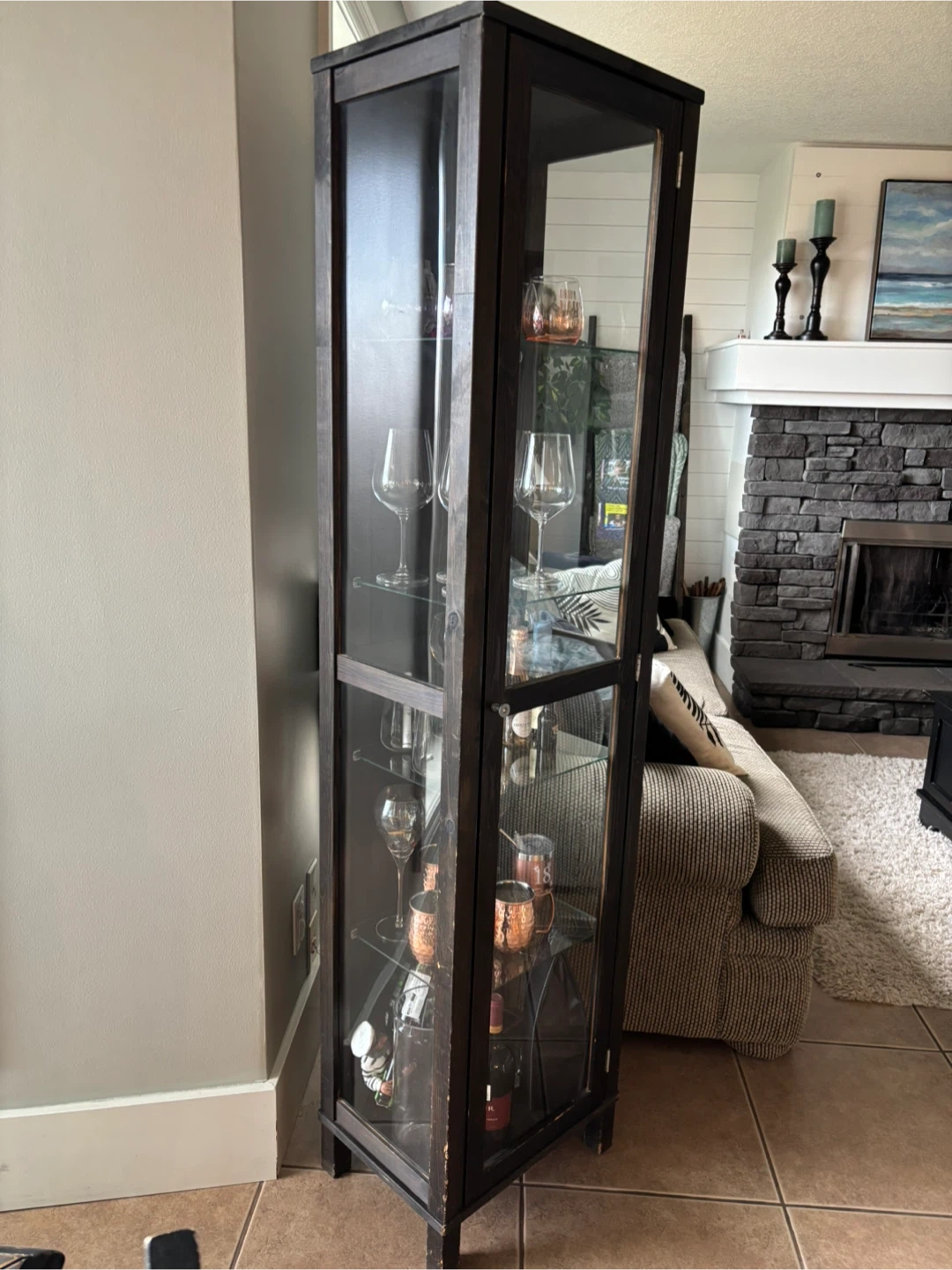 Selling a dark brown glass display cabinet. It's great for displaying glassware, collectibles, or anything you'd like to showcase. There are some signs of wear and tear, as seen in the photos, but it's still a functional and stylish piece of furniture for your home
