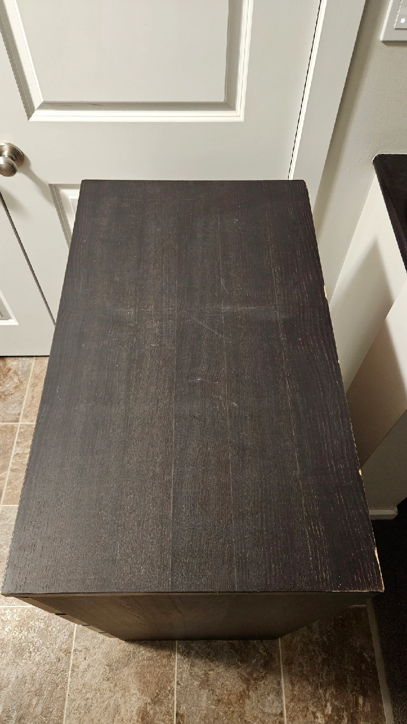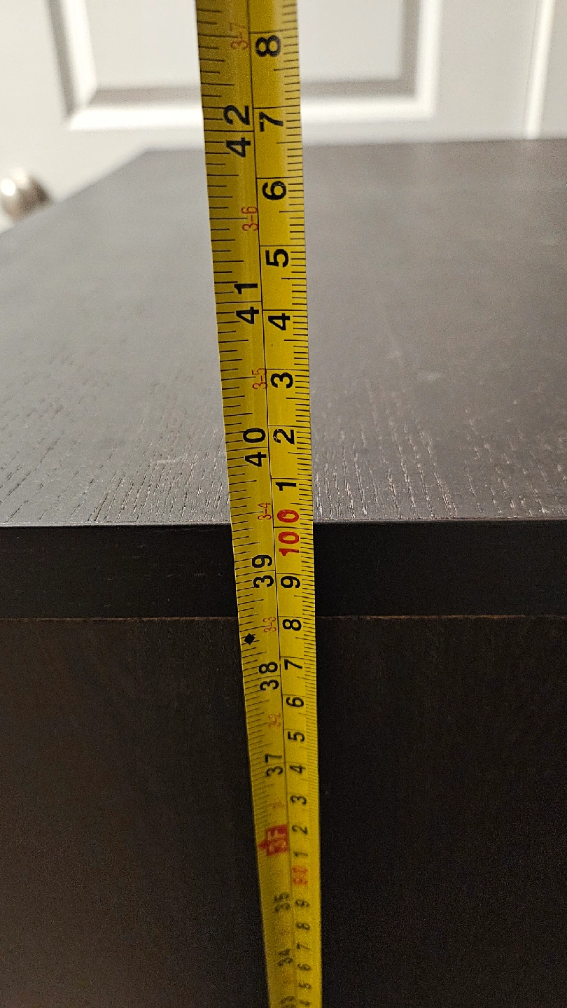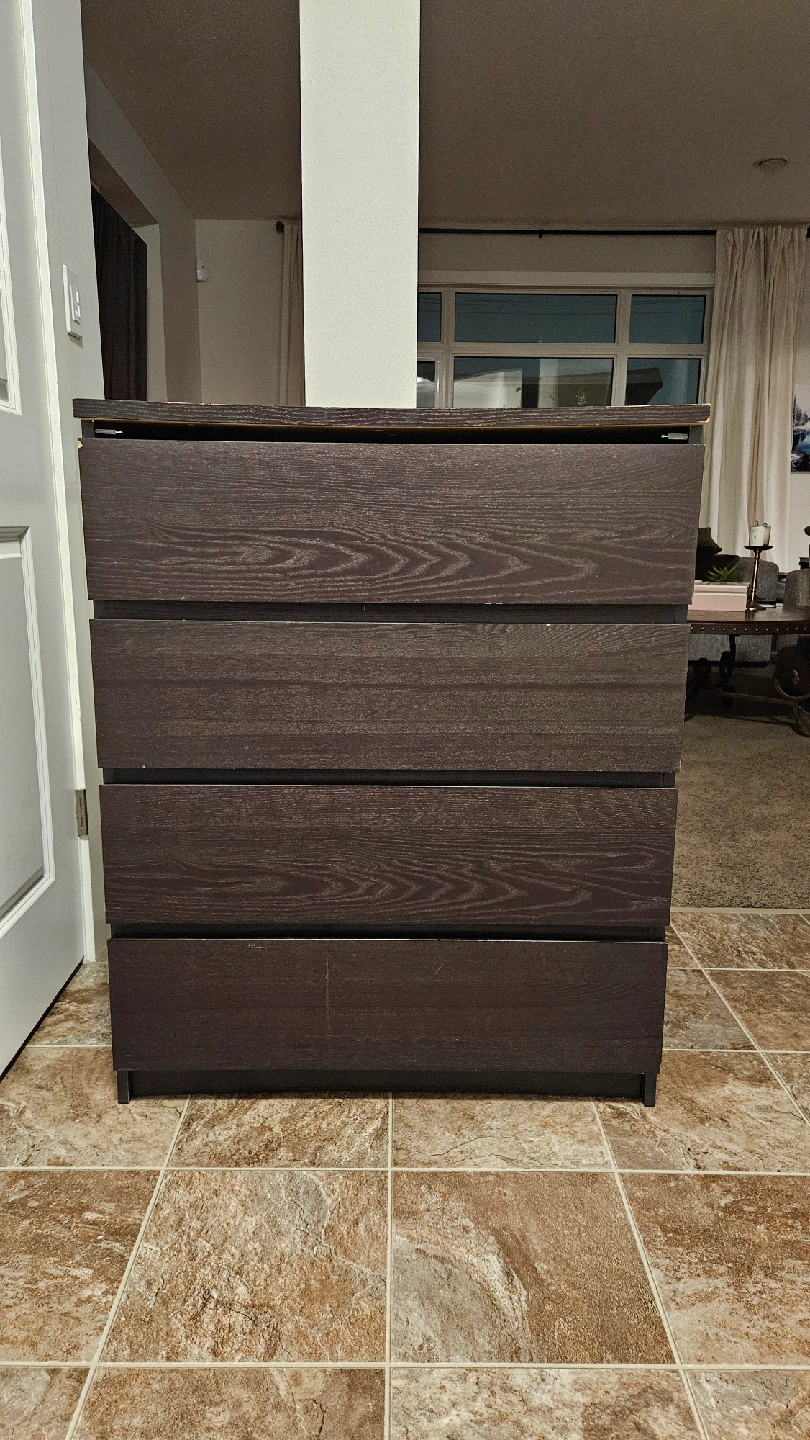 10Selling a dark brown Ikea dresser. It has four drawers and is in good condition. The dimensions are approximately 32 inches wide, 20 inches deep, and 40 inches tall. Clean and bug free home.
