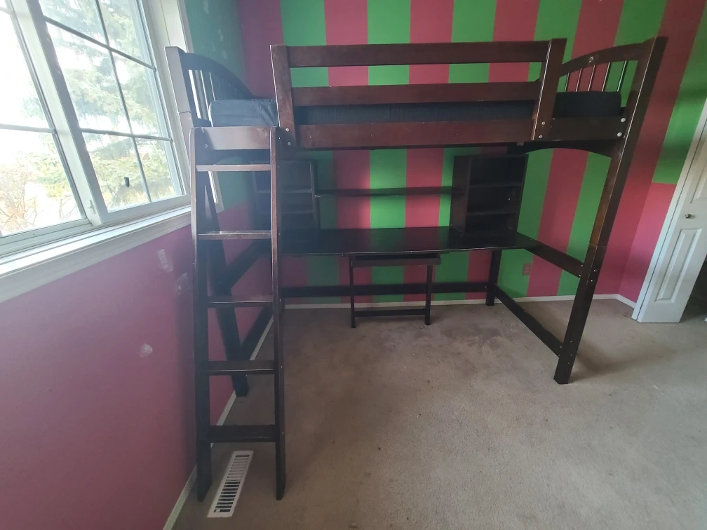 15Selling a dark brown loft bed with a built-in desk. It features a ladder for easy access to the bed and shelving on the desk for storage. Great for saving space! Selling it because I'm moving. mattress is optional, you can take it or not, no extra charge.