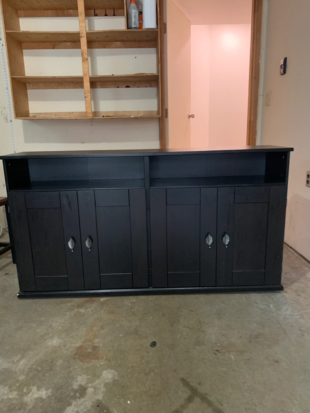 65Selling a dark brown media cabinet in good condition. It has plenty of storage space for your TV and other electronics. The cabinet features doors with decorative leaf-shaped handles.