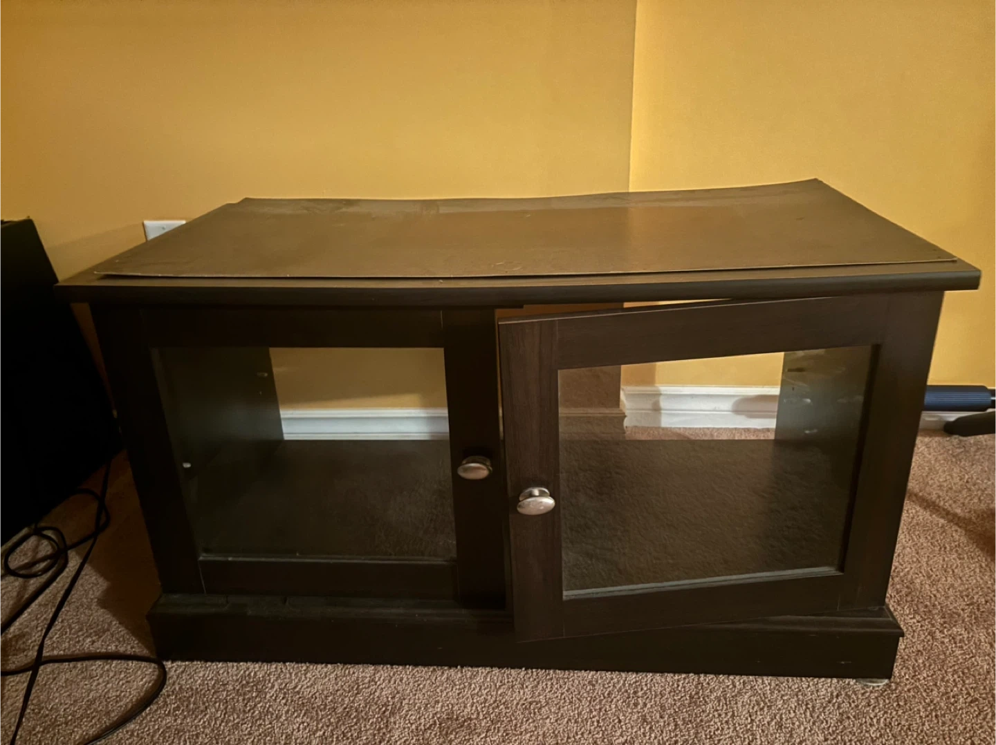 Selling a dark brown TV stand cabinet. It has glass doors and a shelf inside for storage. It's in good condition and ready for a new home