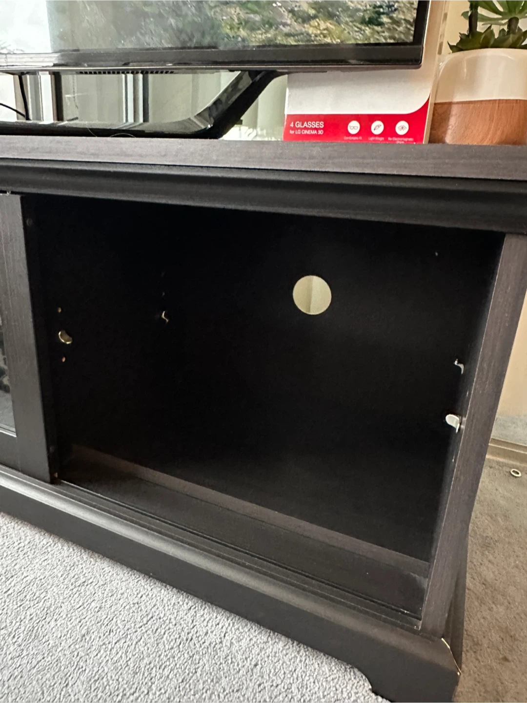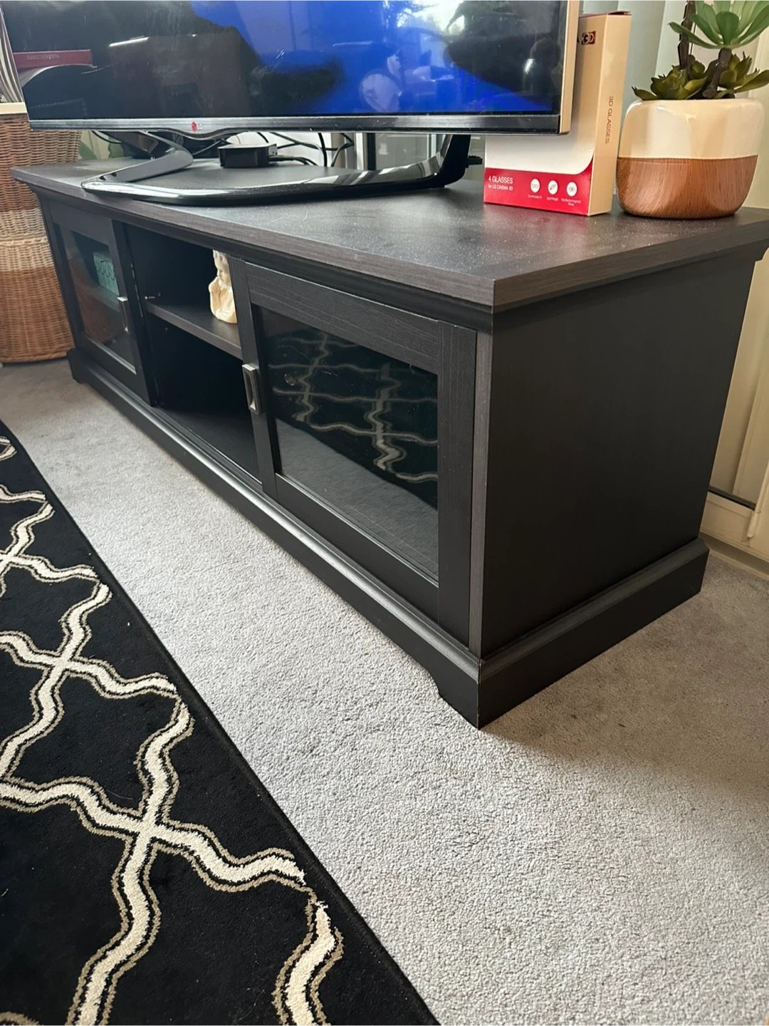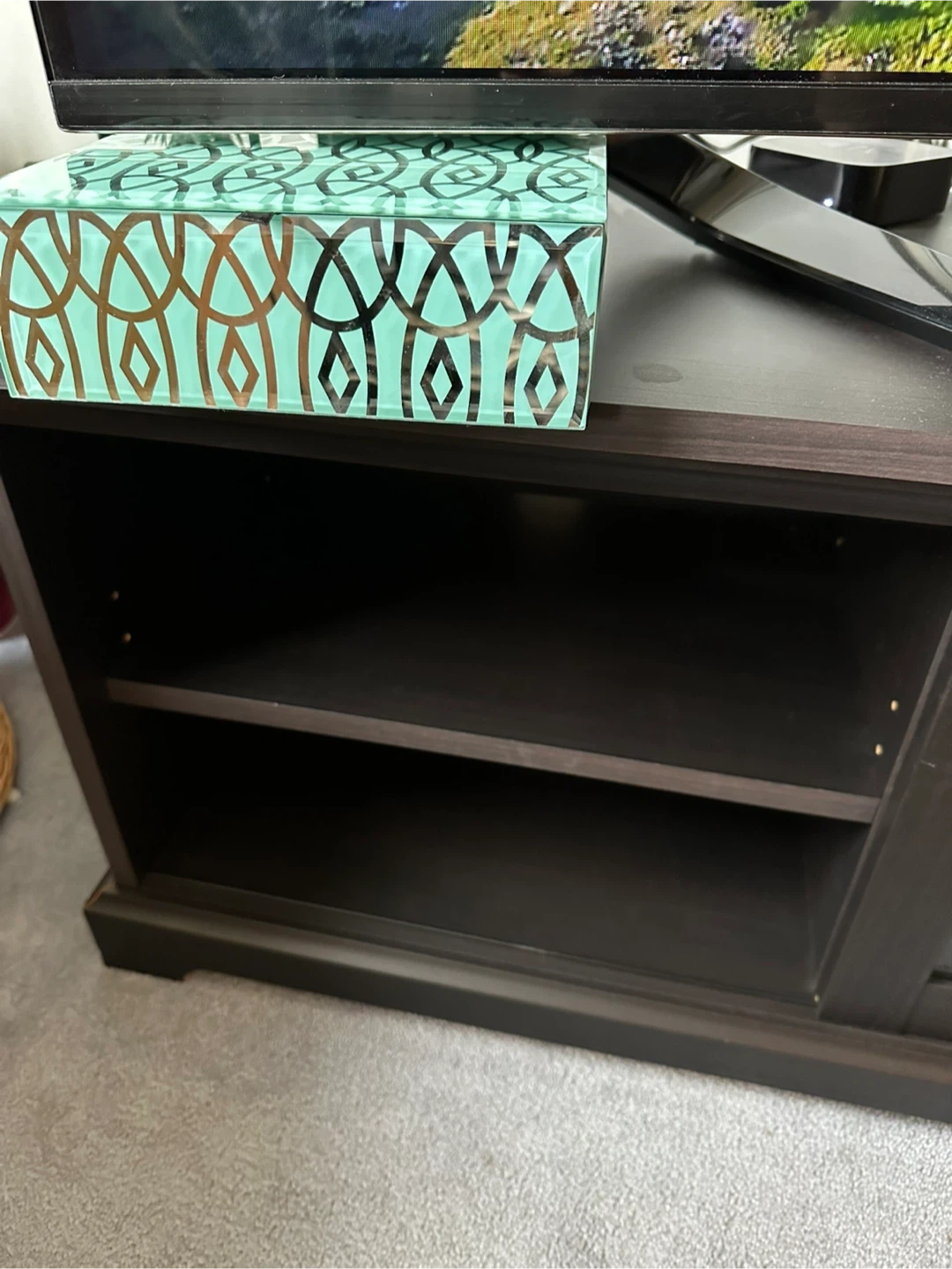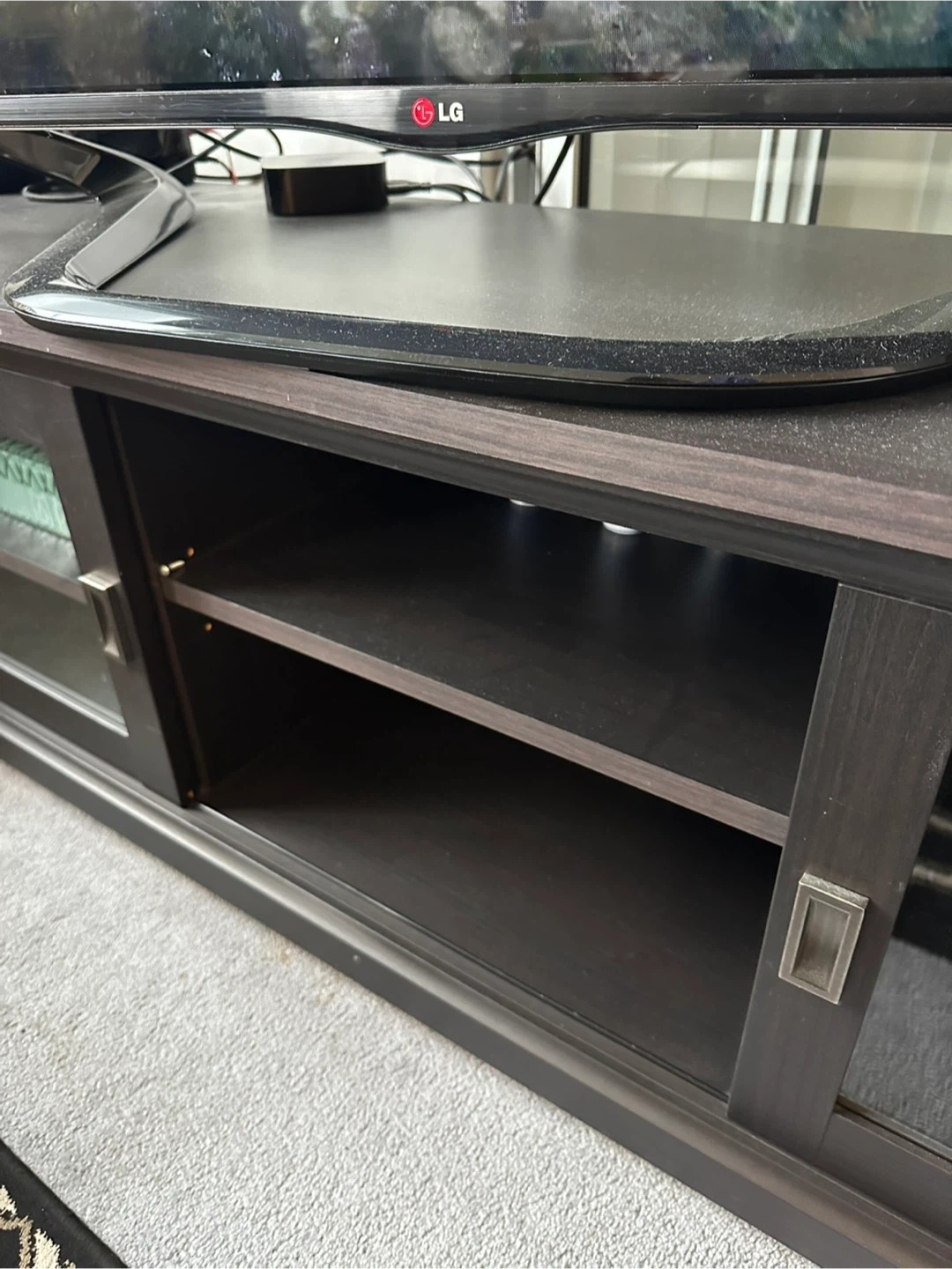 26Selling a dark brown TV stand! It has a sleek design with glass doors, perfect for storing your media devices or displaying decorative items. It's in good shape and ready to find a new home in your living room!