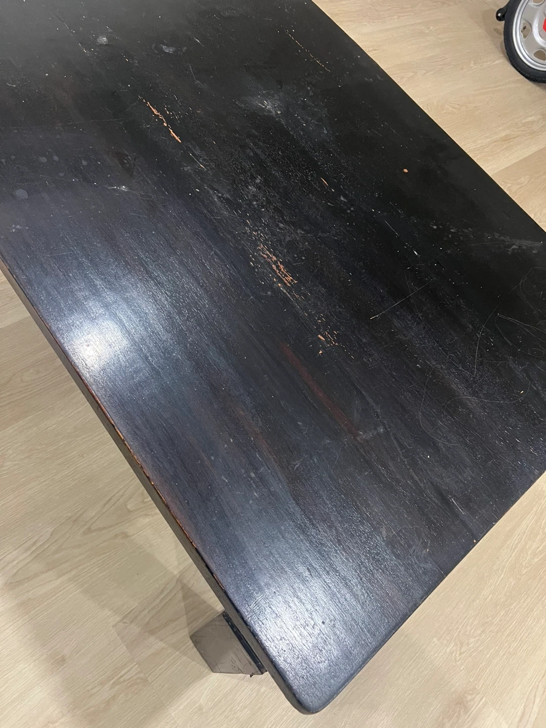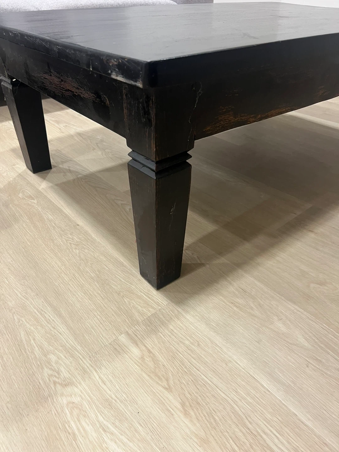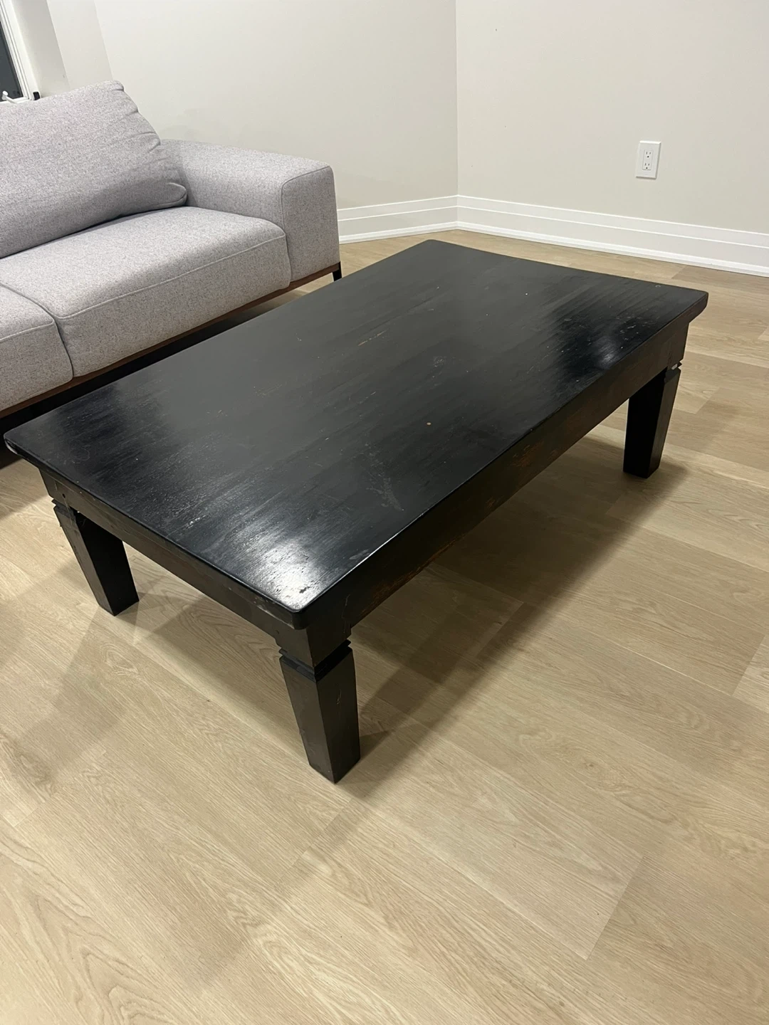 60BLACK stressed “antique- looking” colour - or you can paint over it easily with any colour you prefer The colour was like this when we bought it. Solid wood, gorgeous coffee table Very sturdy No dents or damage on the wood. W - 30.5 inches L - 49” H - 17”