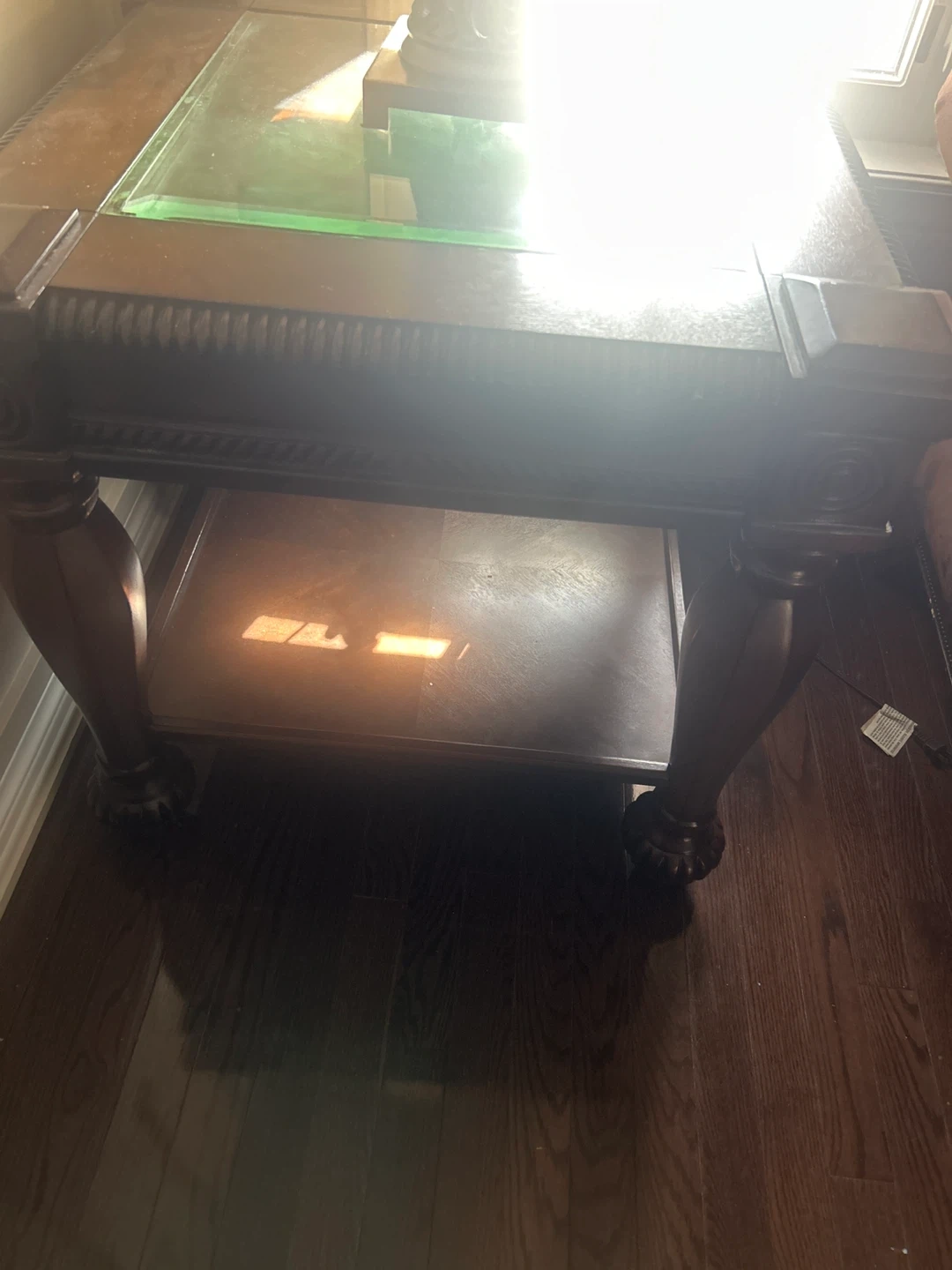 20Selling a dark brown wooden coffee table. It features a glass top and a shelf underneath for extra storage. The legs have a unique carved design. Great for any living room! Comes with three pieces !! Two sides and one coffee !! Ashley store