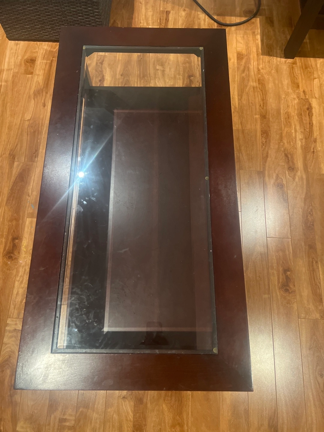 Rectangular coffee table. Dark brown wood frame. Glass top. Looks great in a living room.