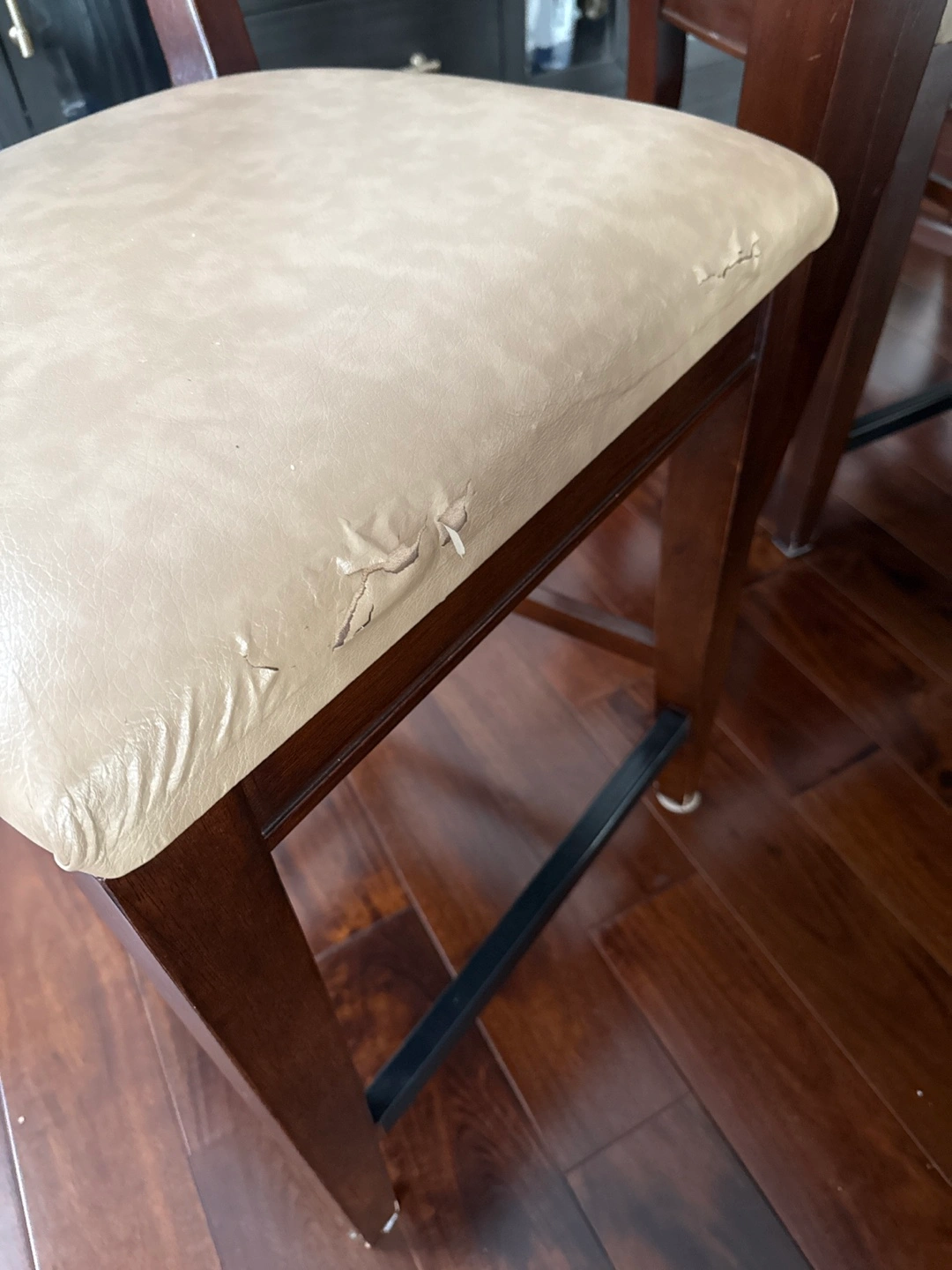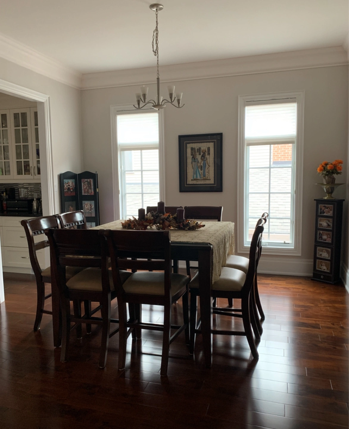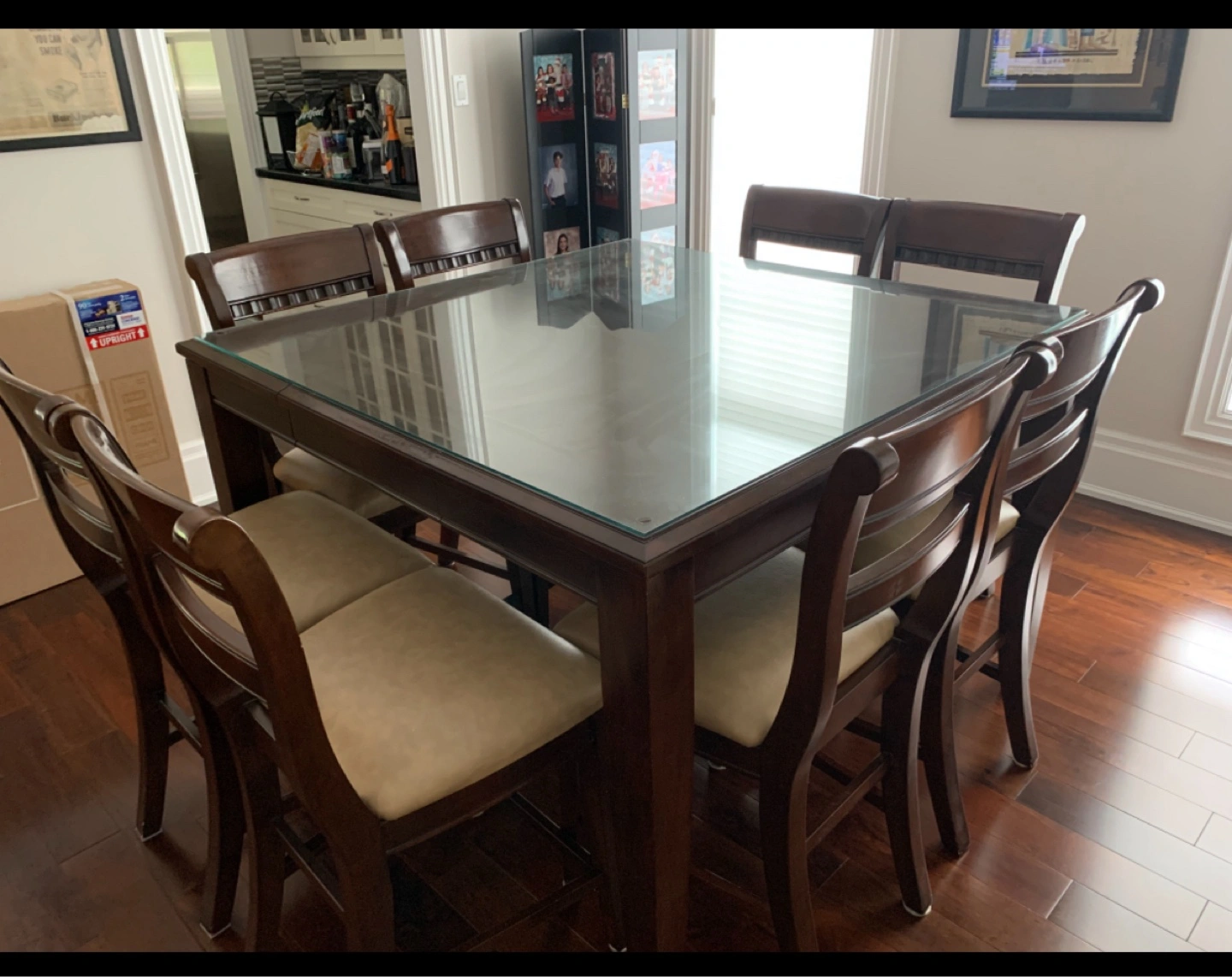 Square dining table, dark brown wood finish. Glass top included. Eight matching chairs, beige cushions. Some cushions may need to be reupholstered (3 of the 8 have some tears)