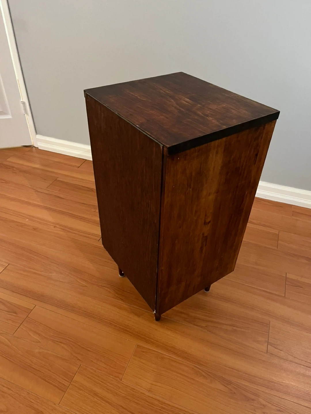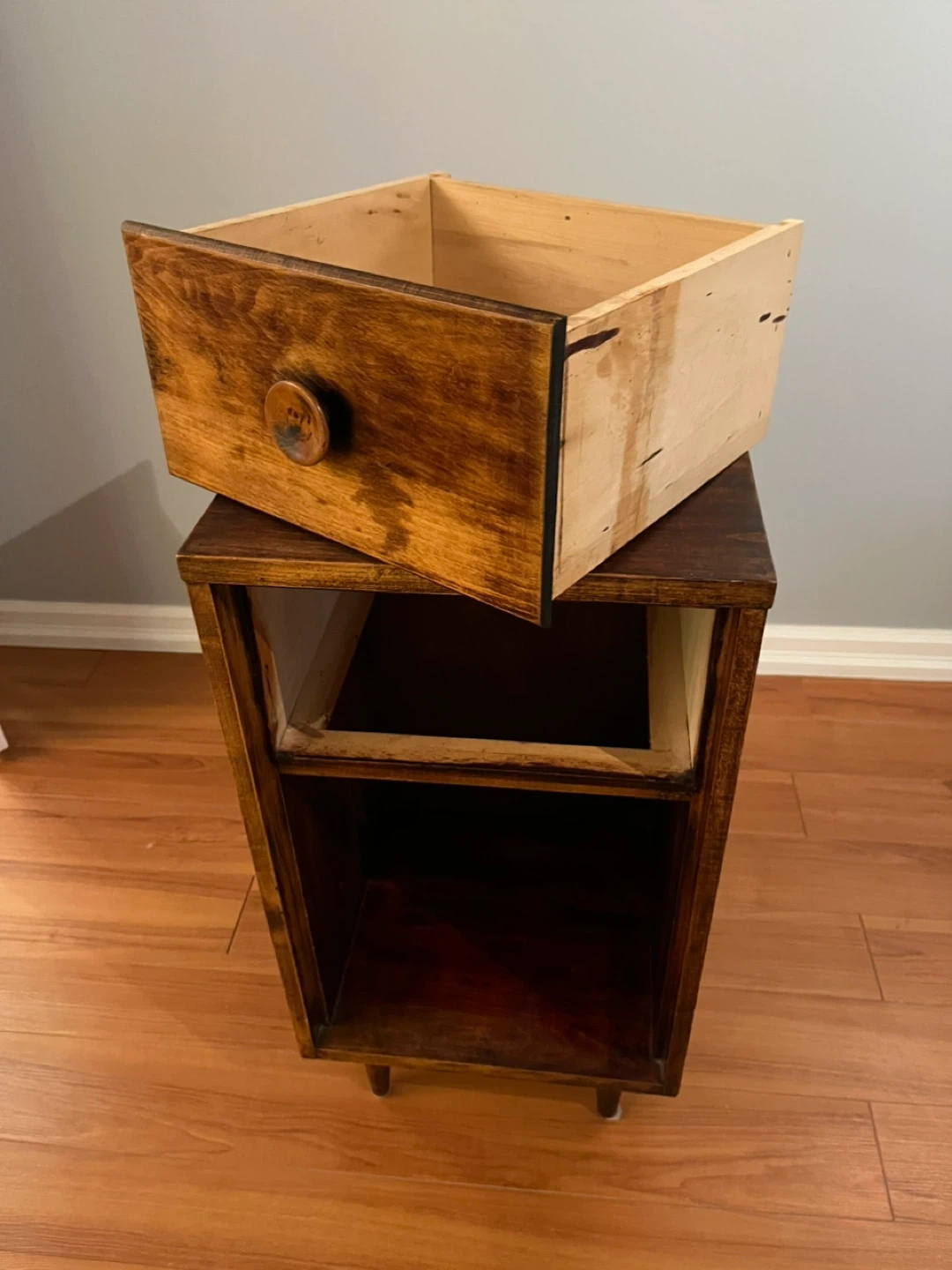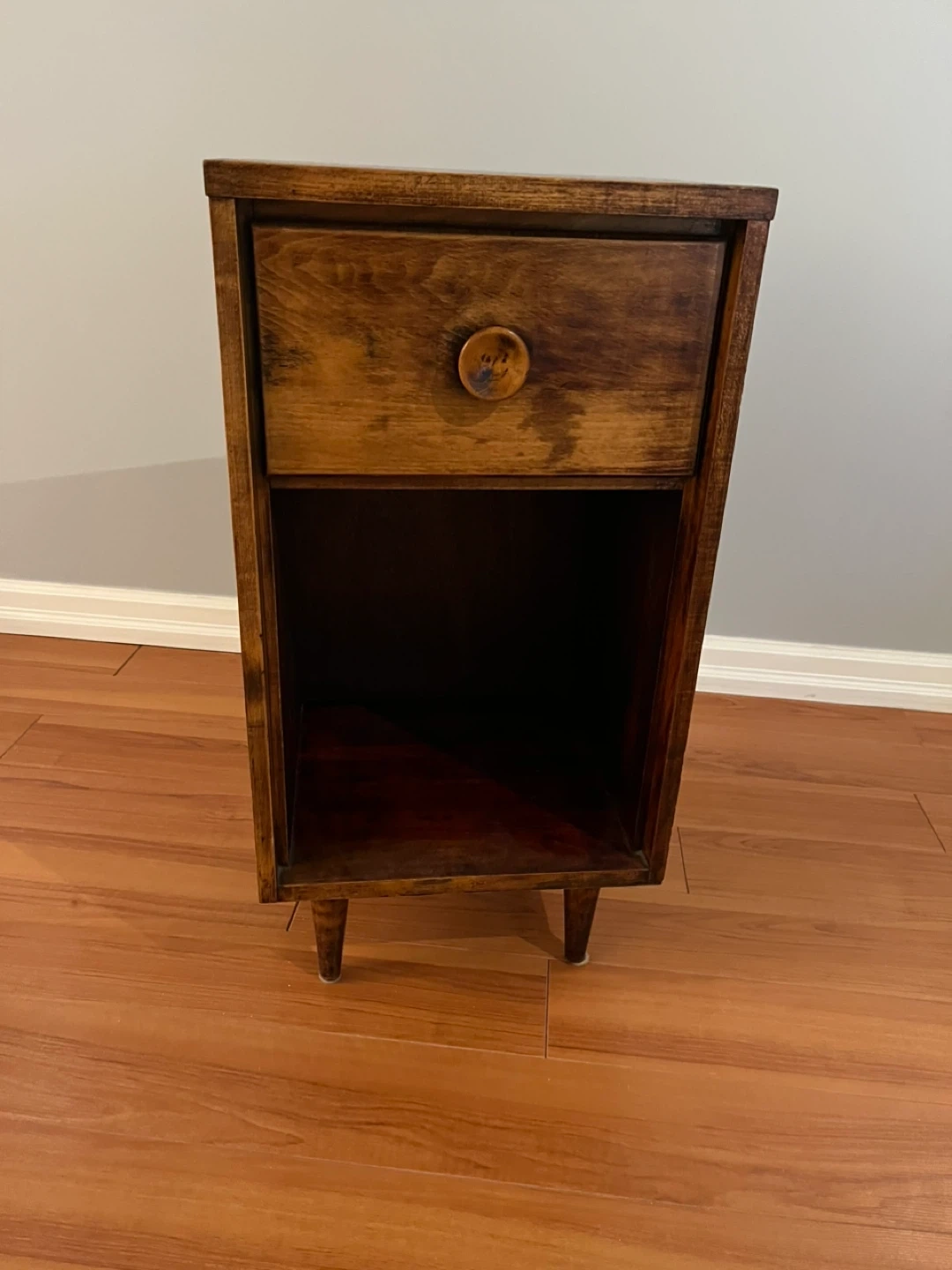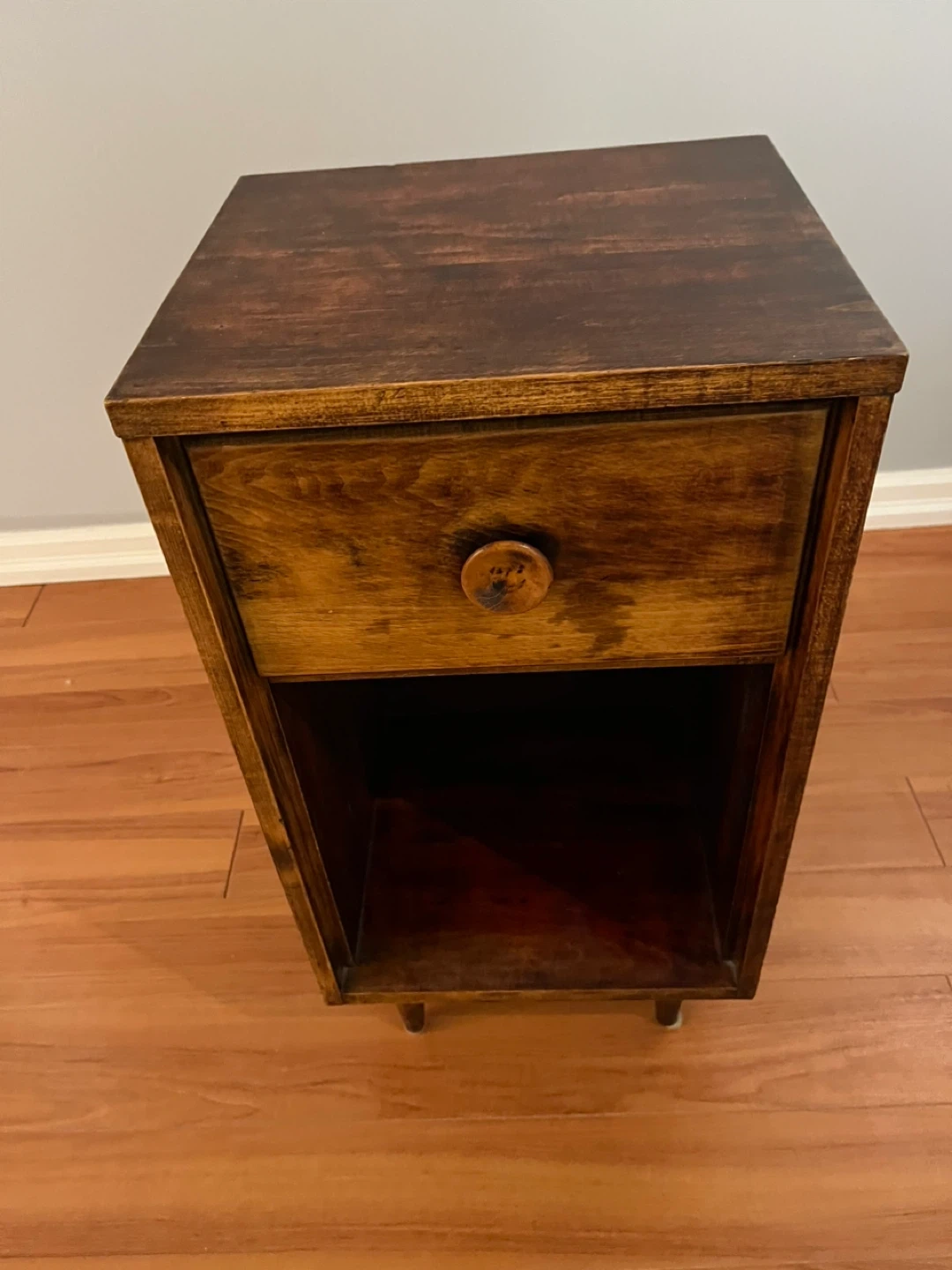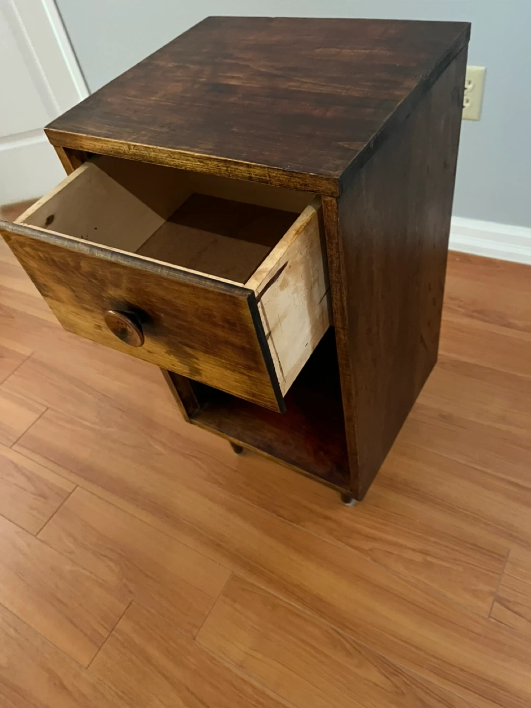 Selling a cute little dark brown wood nightstand! It has a drawer and an open shelf for storage. Perfect for beside the bed or as a small side table in the living room 14.7 x 13 inch Pick up Finch and warden