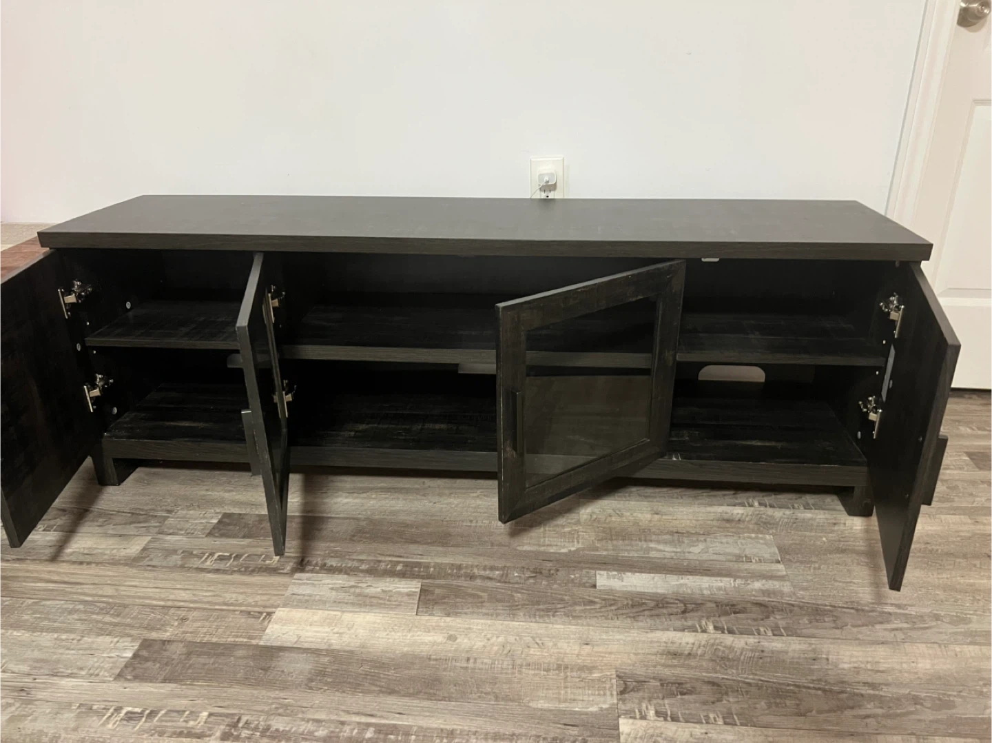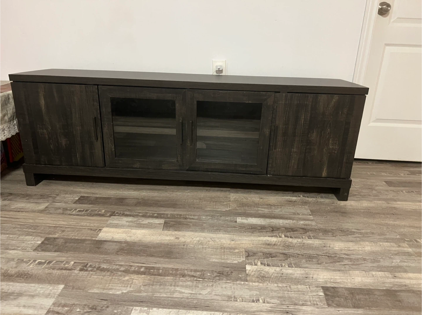 Selling a dark brown TV stand! It has doors with glass panels and plenty of storage space inside. Perfect for your living room or entertainment area. It's in great condition. I bought it 6 month ago selling just because of moving.