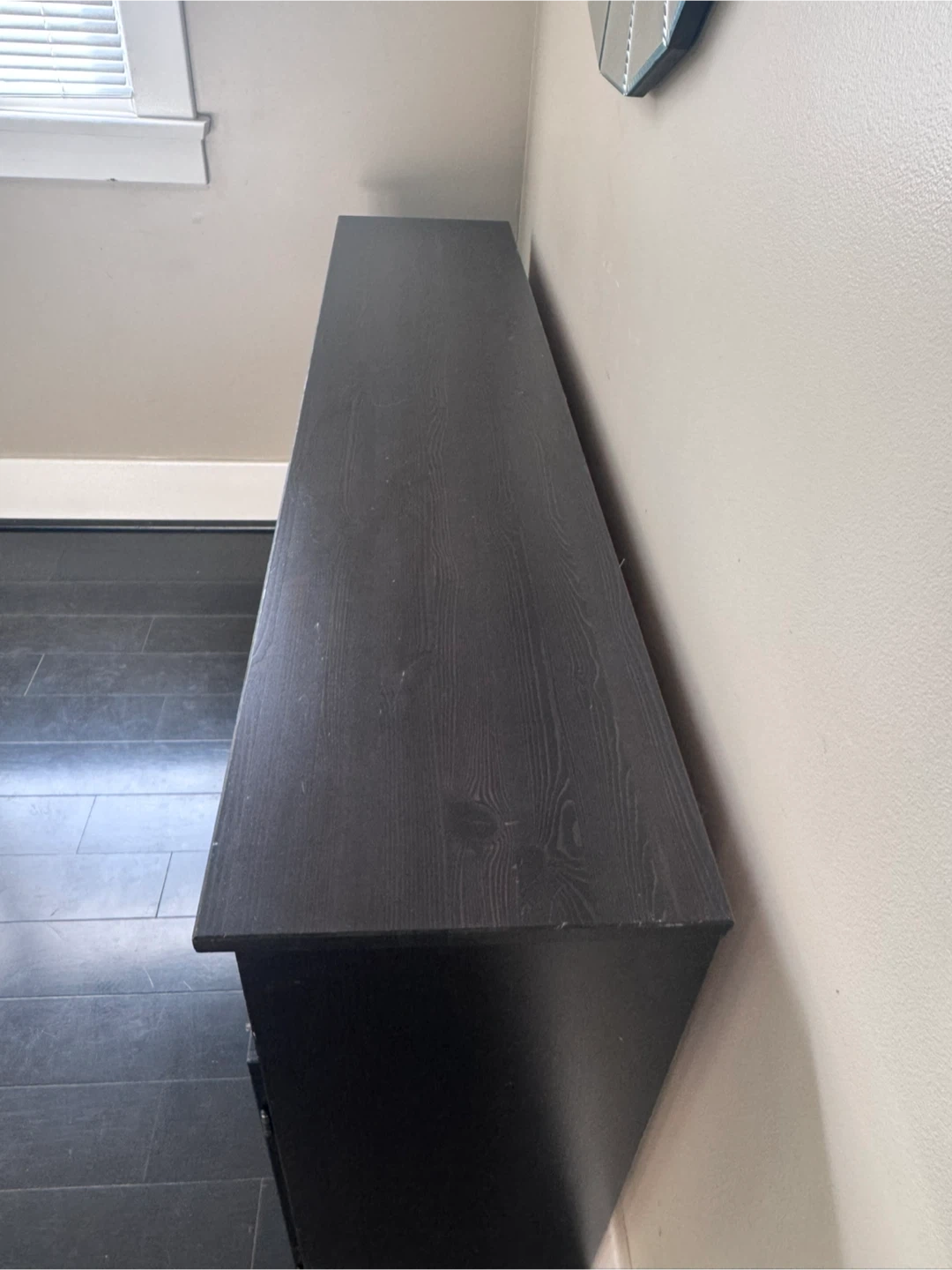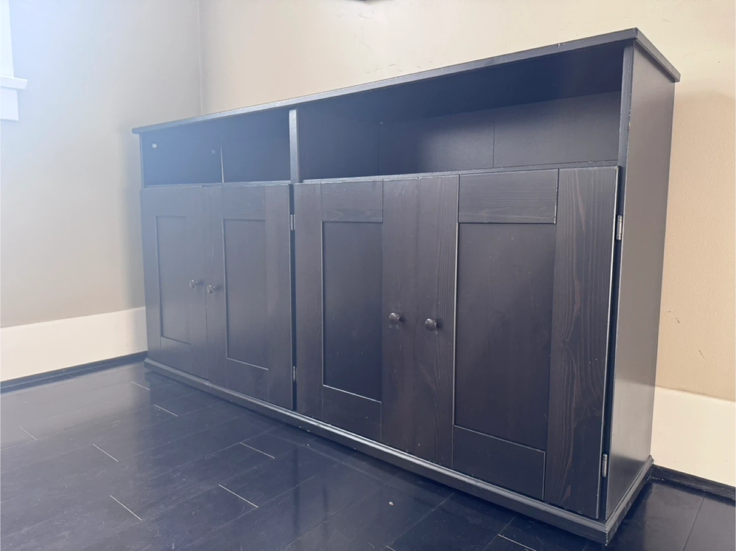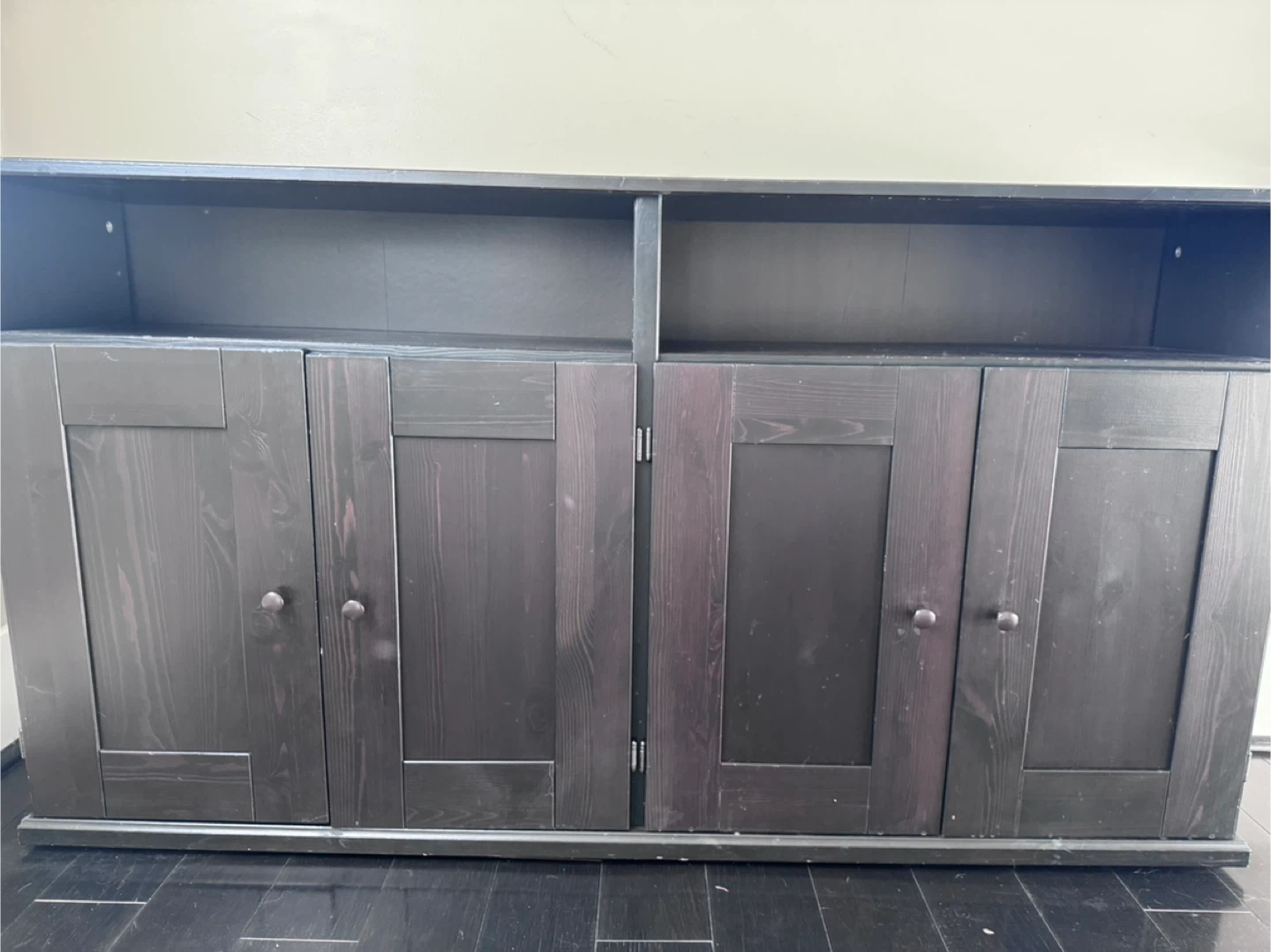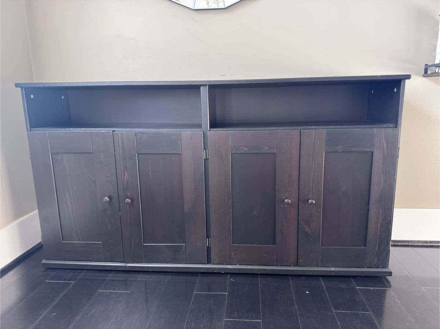 23Dark Wood Sideboard / Storage Cabinet in Great Condition Stylish dark wood sideboard in great condition. It features four doors with spacious storage inside and two open shelves on top — perfect for organizing dishes, books, or decor items. Solid and sturdy, with a clean, modern design that fits well in dining rooms, living rooms, or hallways.