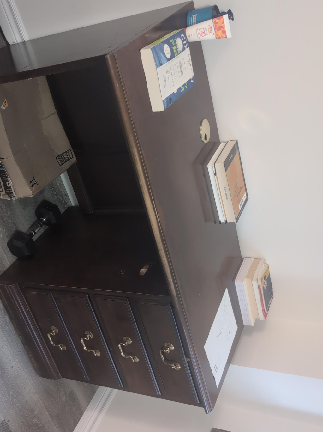 Selling a dark brown wooden desk. It has a classic design with drawers, perfect for a home office or study space. It shows some signs of use but is still sturdy and functional. It has electrical conductivity for PC, TV or Laptop.