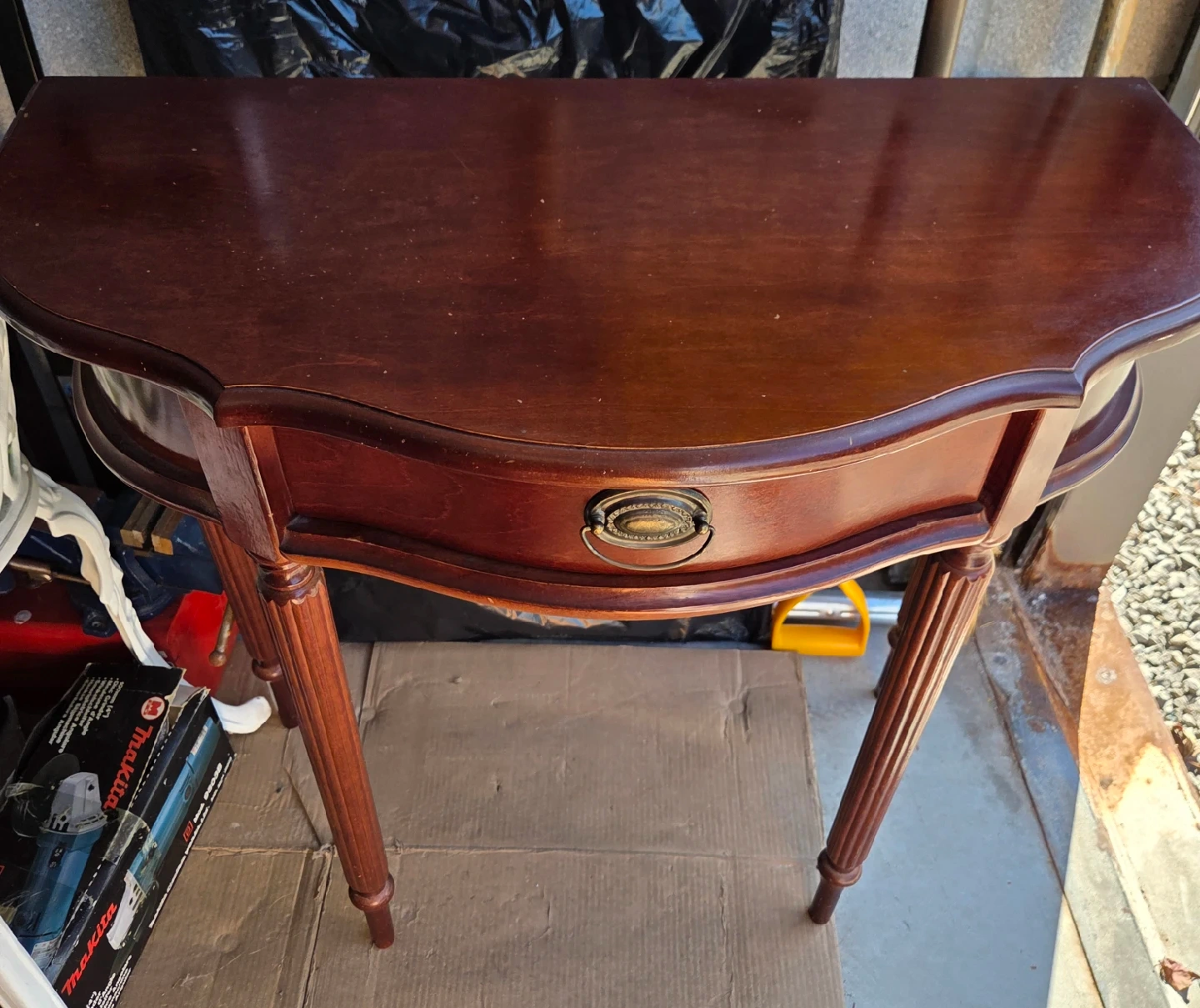 10A lovely dark brown wooden side table, perfect for adding a touch of elegance to any room! It features a convenient drawer for storage and stylish, fluted legs. It is in good condition have downsized