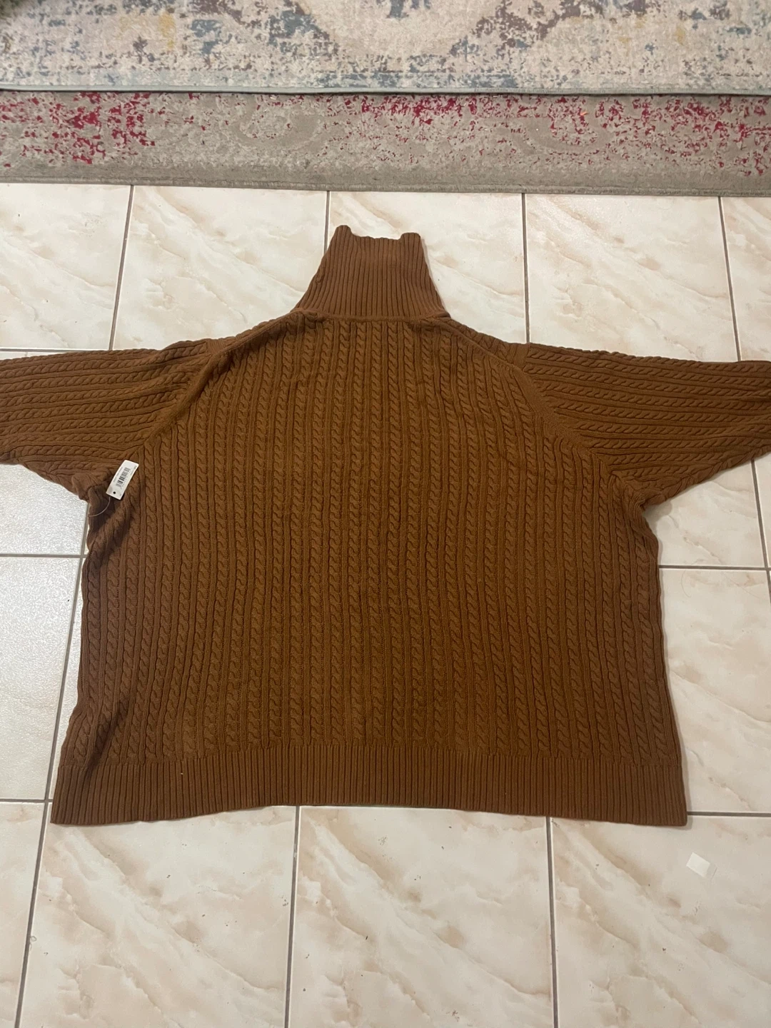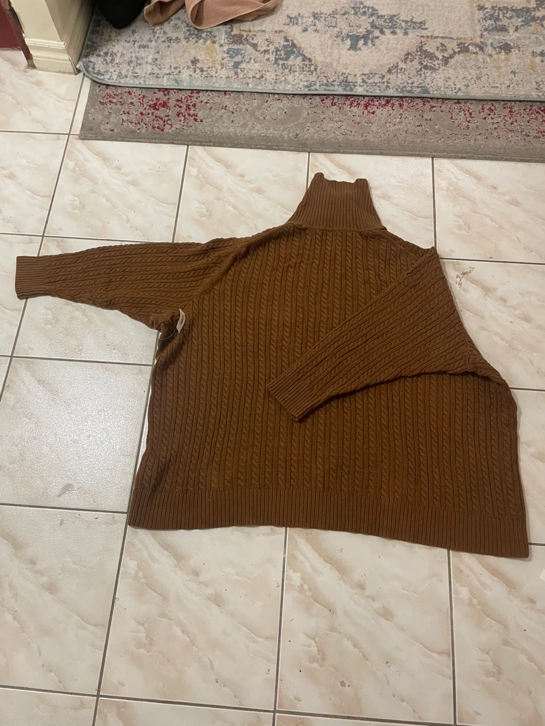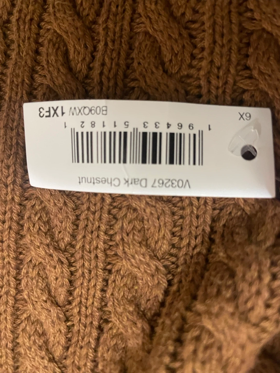 Cozy cable knit turtleneck sweater in a dark chestnut colour. It's a size 6X and in great condition!
