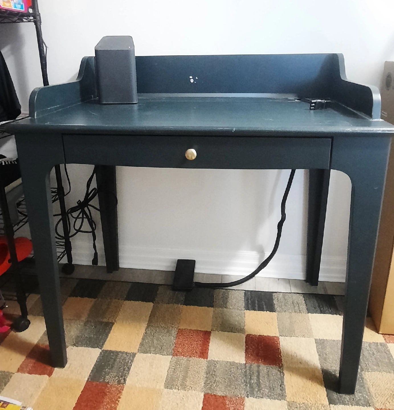 93Selling a cute desk in a dark green colour! It features a drawer and a raised back panel. Perfect for a small space work table. Space for a laptop an screen plus writing. also has the hidden panel on the top to cover wires.