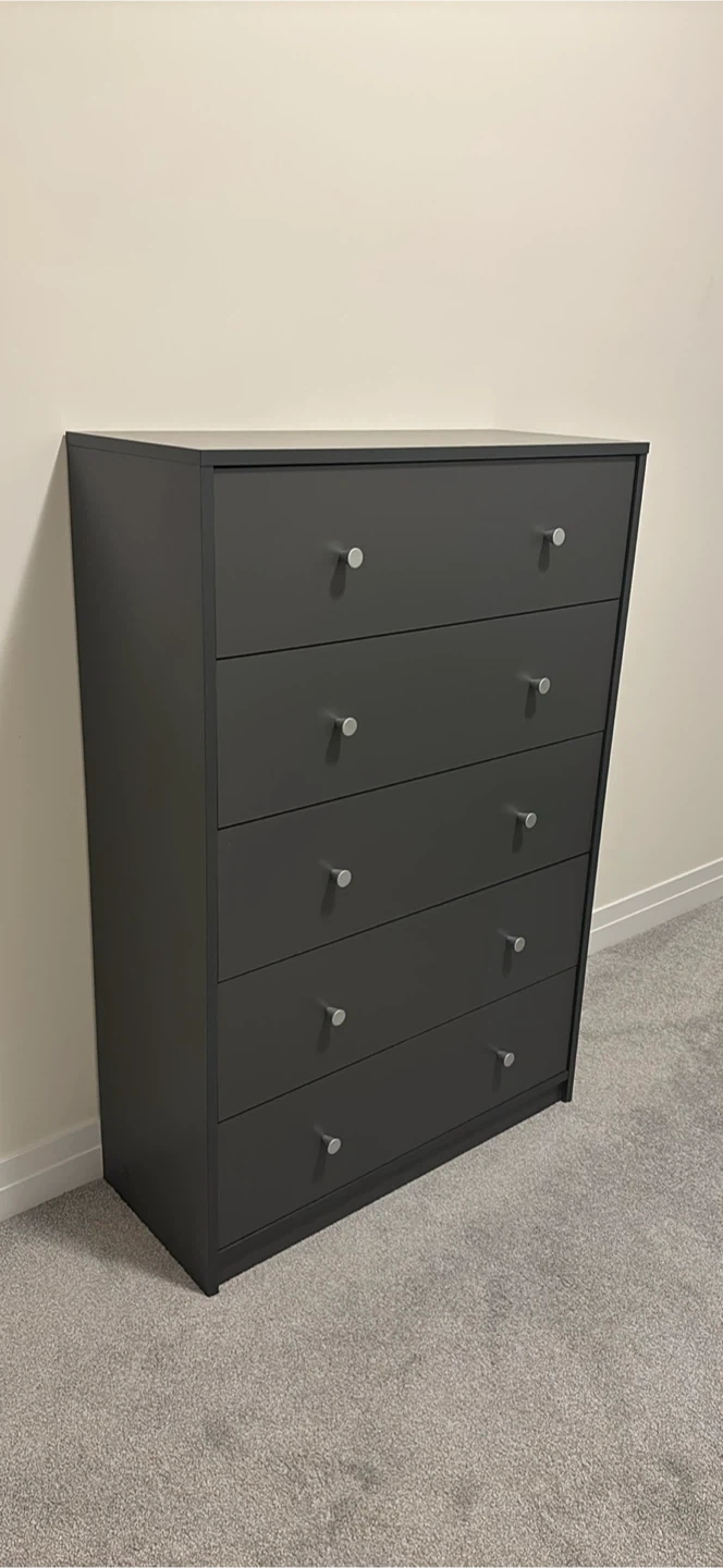 Selling a like-new dark grey 5-drawer dresser! It's in excellent condition and ready for a new home. Dimensions: - Overall Height: 42.56 inches - Width: 28.50 inches - Depth: 11.65 inches