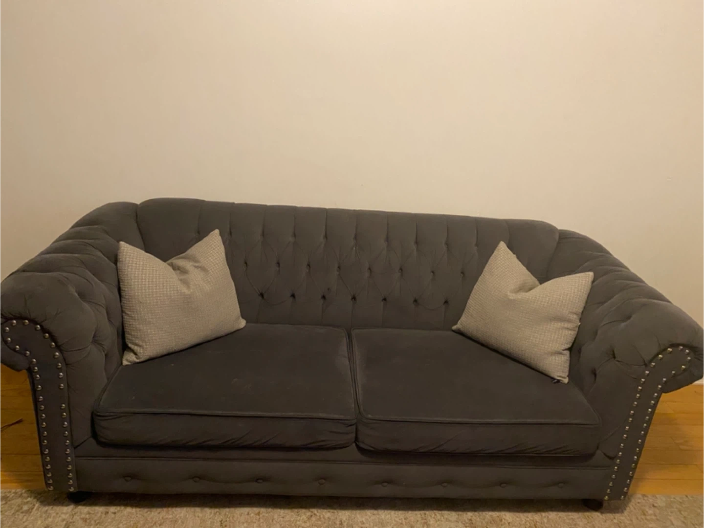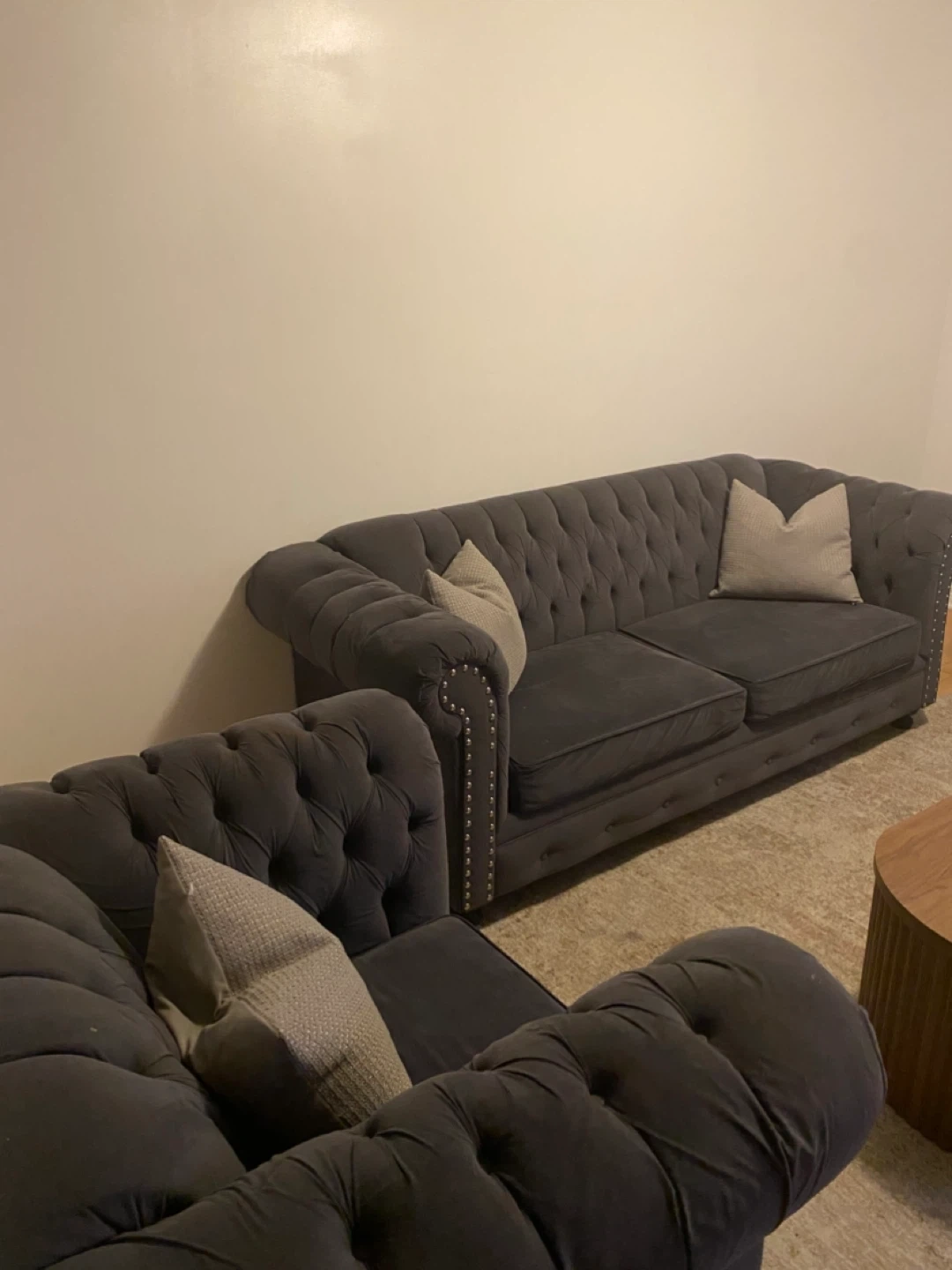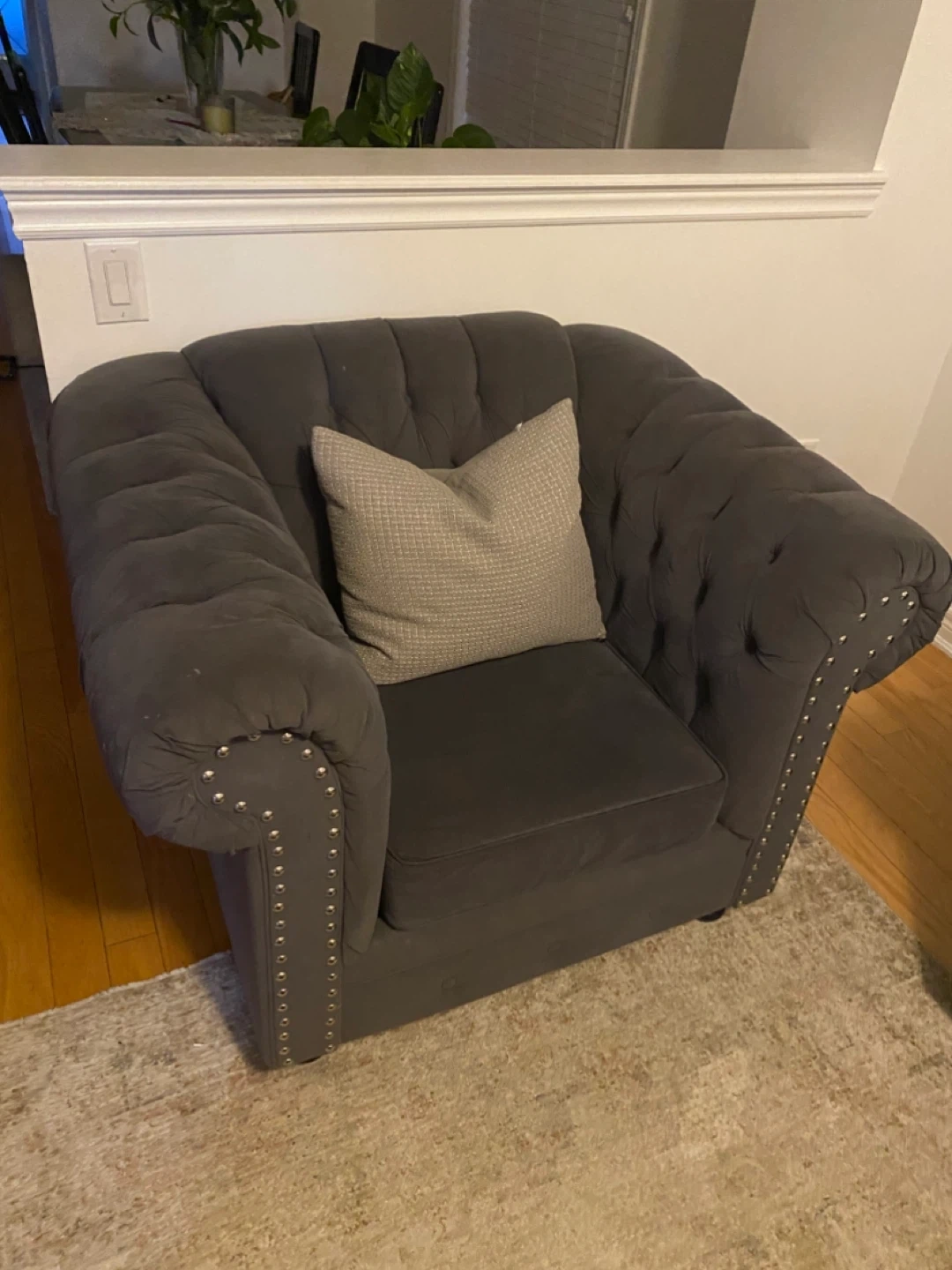 60Selling a dark grey armchair with a classic Chesterfield style! It's in great shape and would look lovely in any living room or study. The armchair features the signature button-tufted design and nailhead trim, adding a touch of elegance to your space