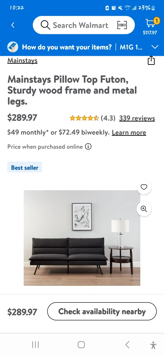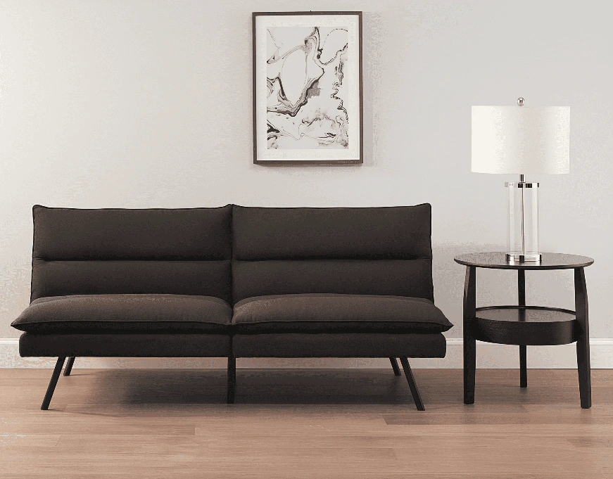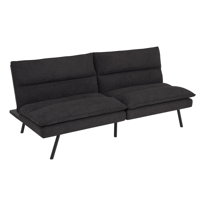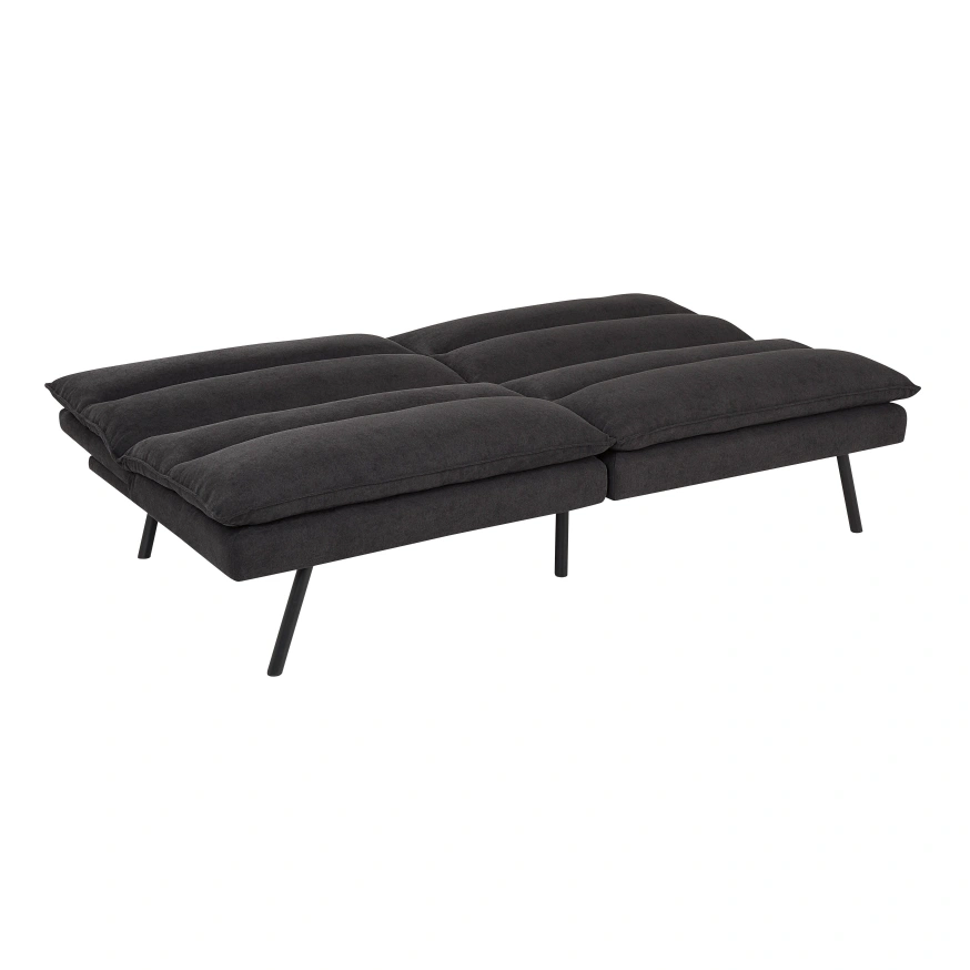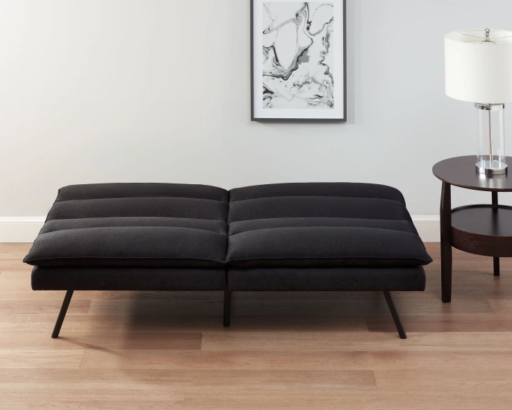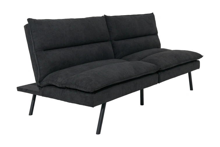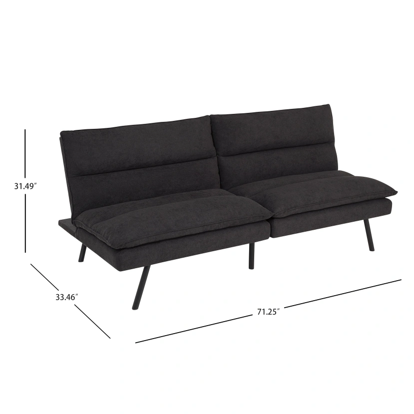 1000+Comfortable futon, dark grey fabric. Sleek, modern design. Black metal legs. Converts to a bed. Great for small spaces.
