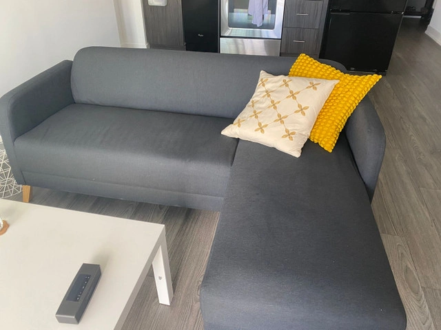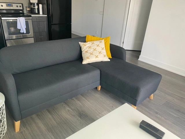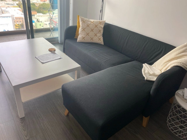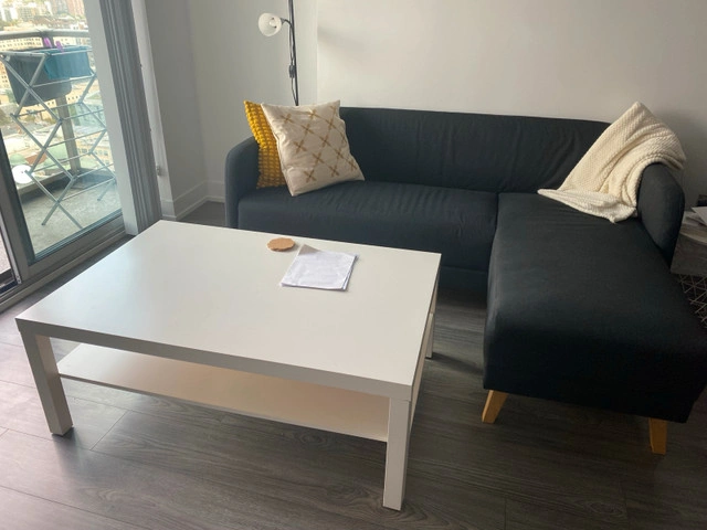 18L-Shaped Couch & Coffee Table for Sale ☕ • Couch: Modern black sectional with chaise, comfy seating, includes pillows + throw. • Table: White coffee table, sturdy with lower storage shelf. Both in great condition, perfect for condos or apartments. Pickup only.