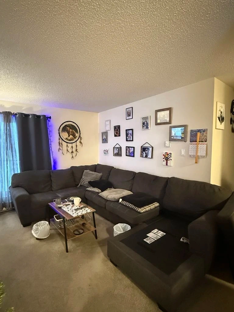 Large dark grey sectional couch, includes a chaise lounge. Comes with several pillows. Good condition, but some wear and tear on the fabric.