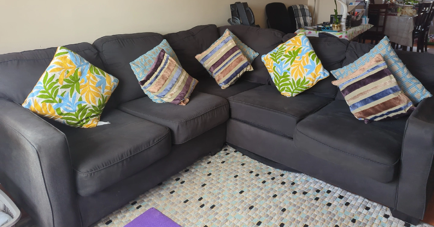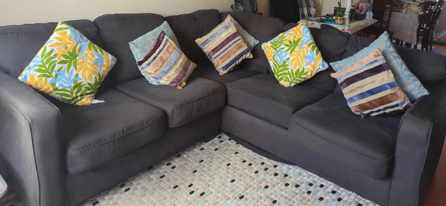 Selling a comfy dark grey sectional L shaped couch. It's in good condition and perfect for a living room or entertainment area except one of the arm chair is slightly broken but everything else works perfectly. The cushions pictured are for display only. Any good offers will not be rejected.