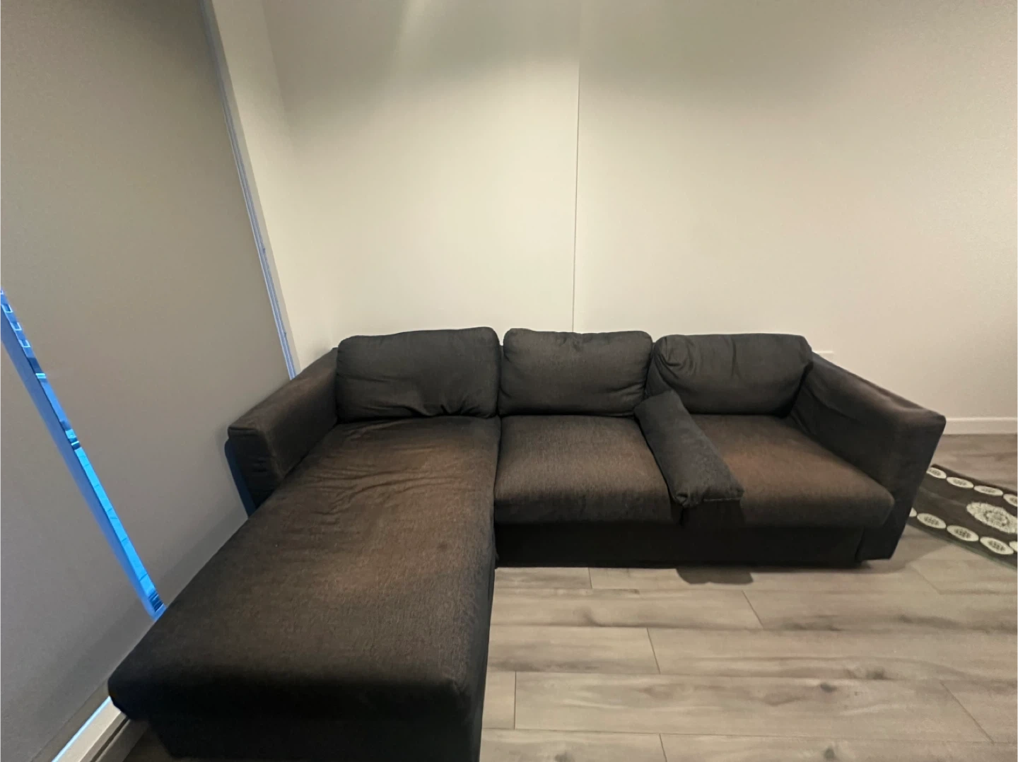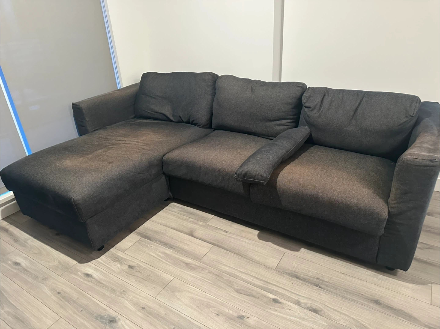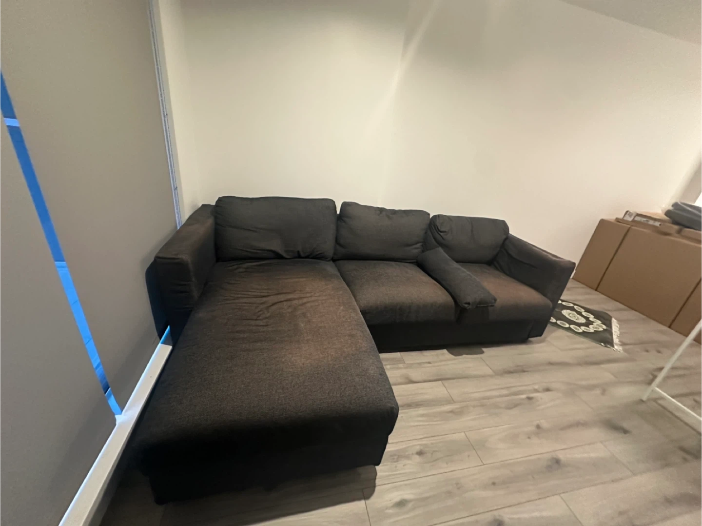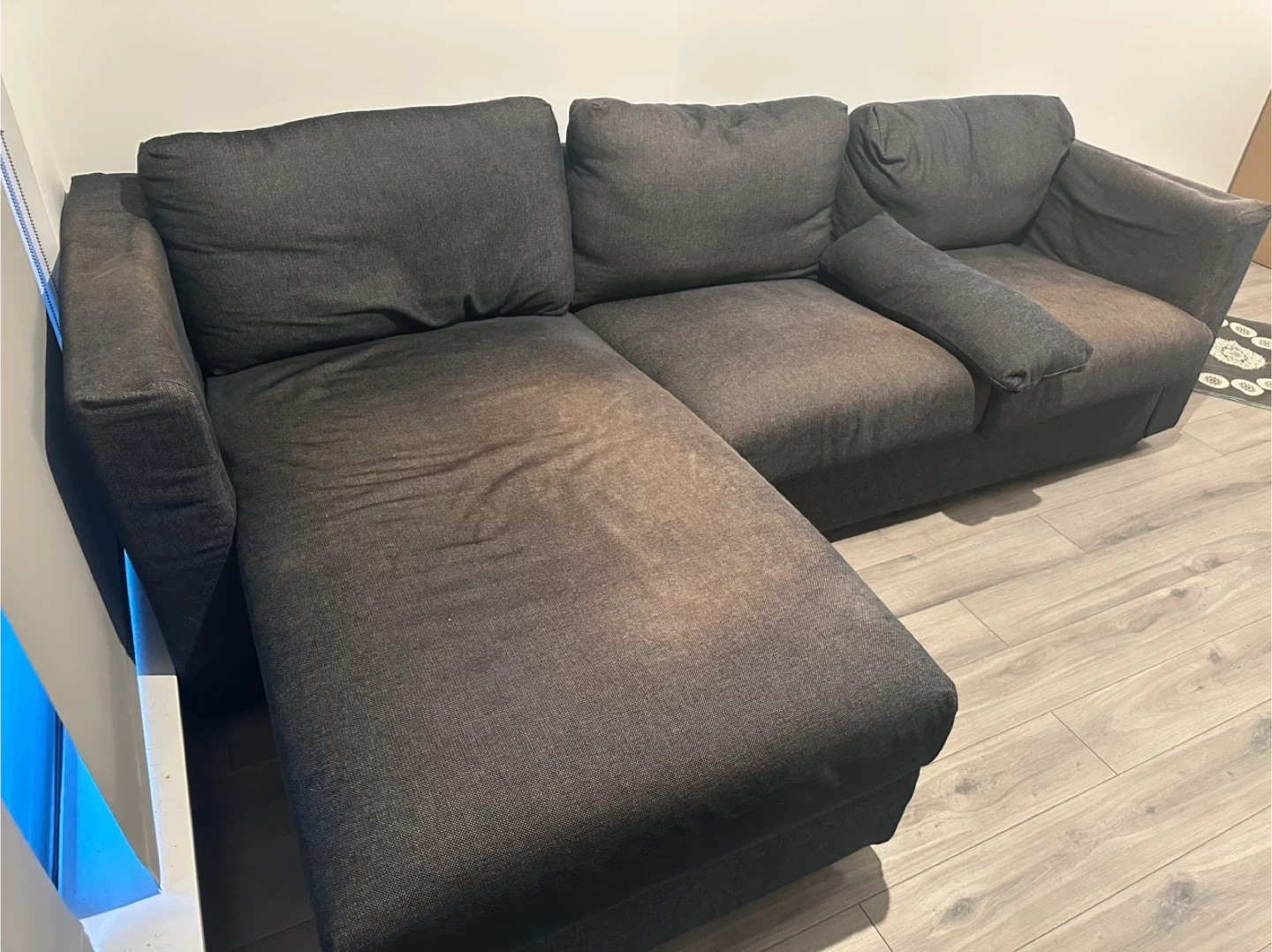 Selling a dark grey sectional sofa. It's in good condition and would be a great addition to any living room! It's a comfortable and stylish piece of furniture that's perfect for relaxing or entertaining guests. Both arm rests are broken.