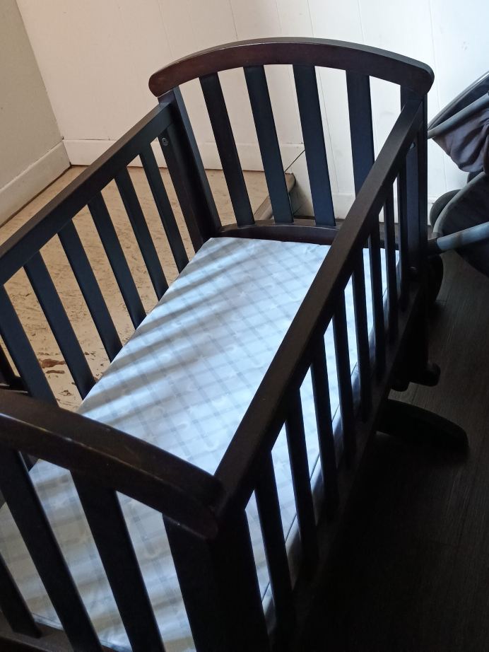 Selling a baby crib with a dark wood finish. It's in good condition and ready for a new home! The crib features a classic design with vertical slats and a sturdy frame. Perfect for creating a cozy and safe sleeping space for your little one