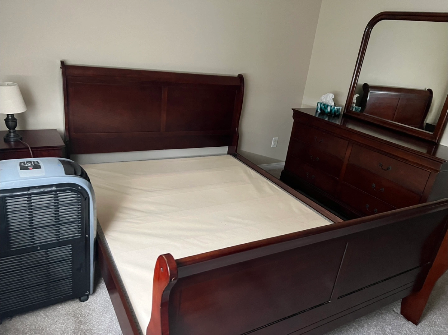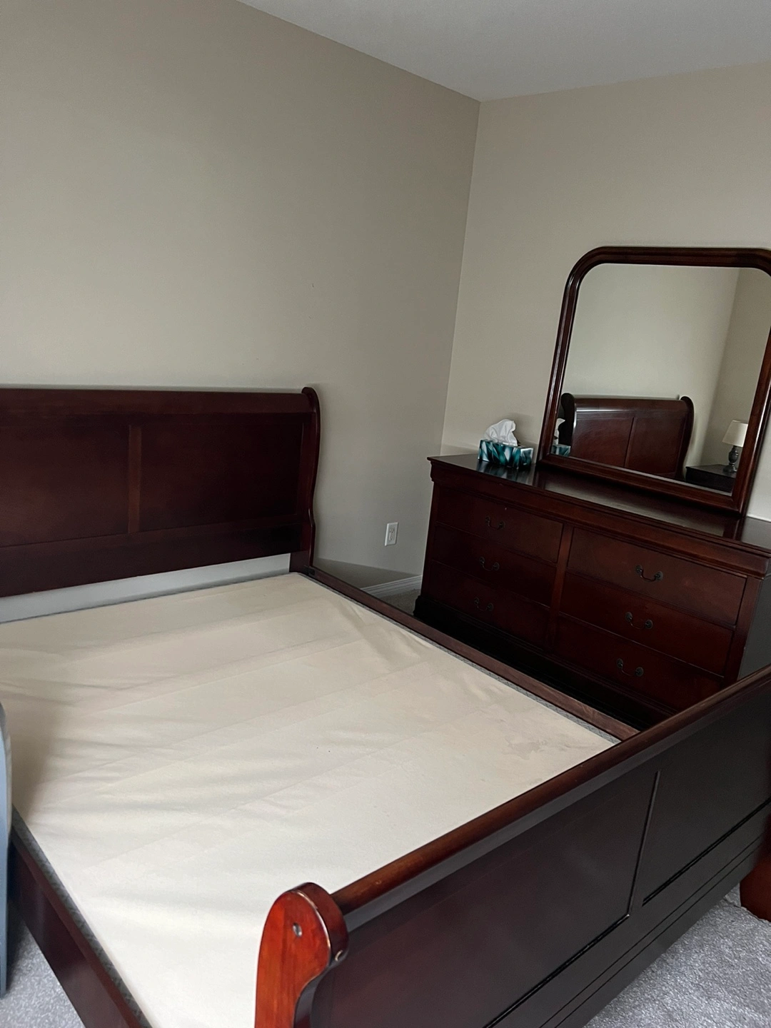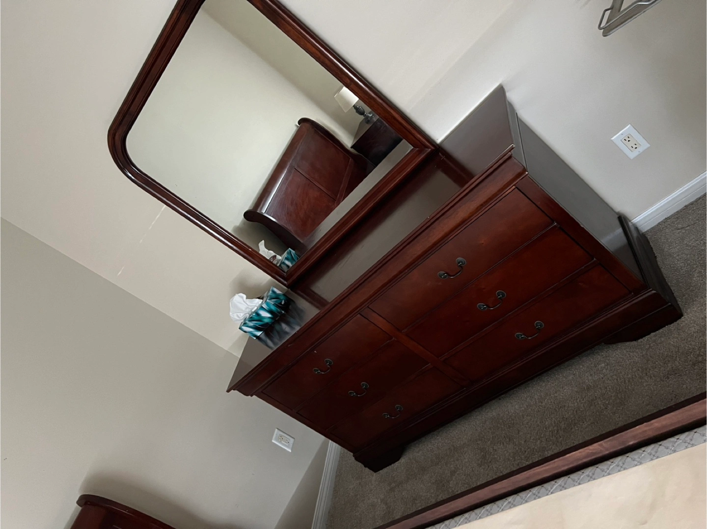10Selling a beautiful dark wood bedroom set! Includes a bed frame, dresser, and a mirror. The set is in good condition and would look great in any bedroom. It has a classic design with a rich, dark finish.