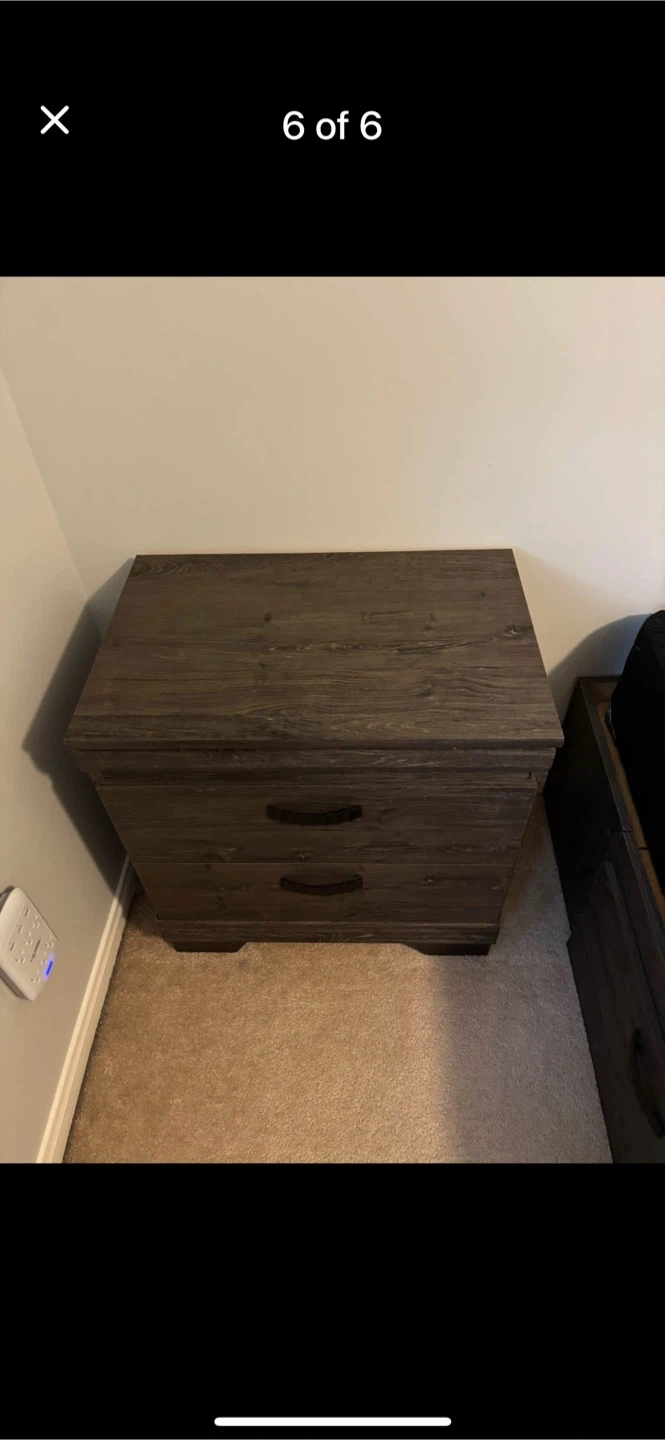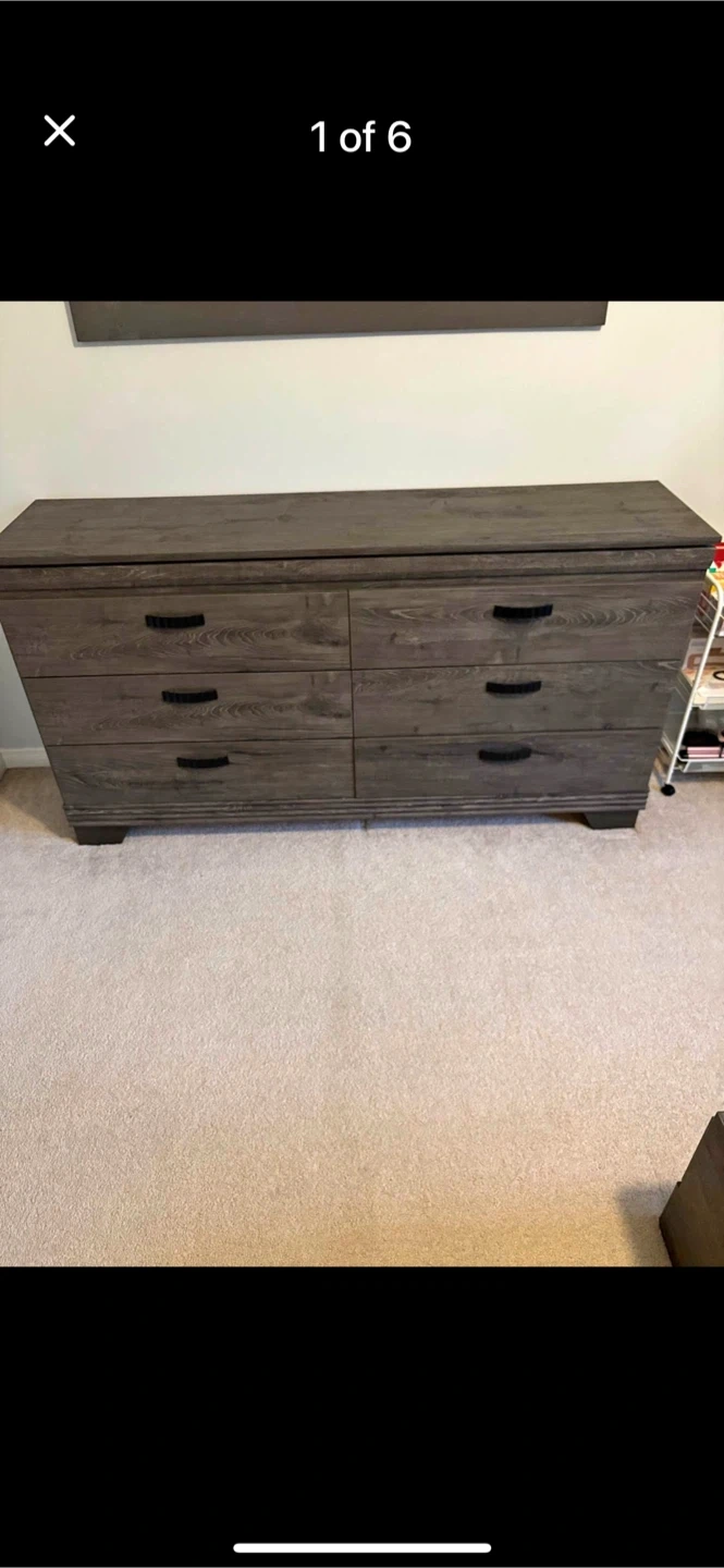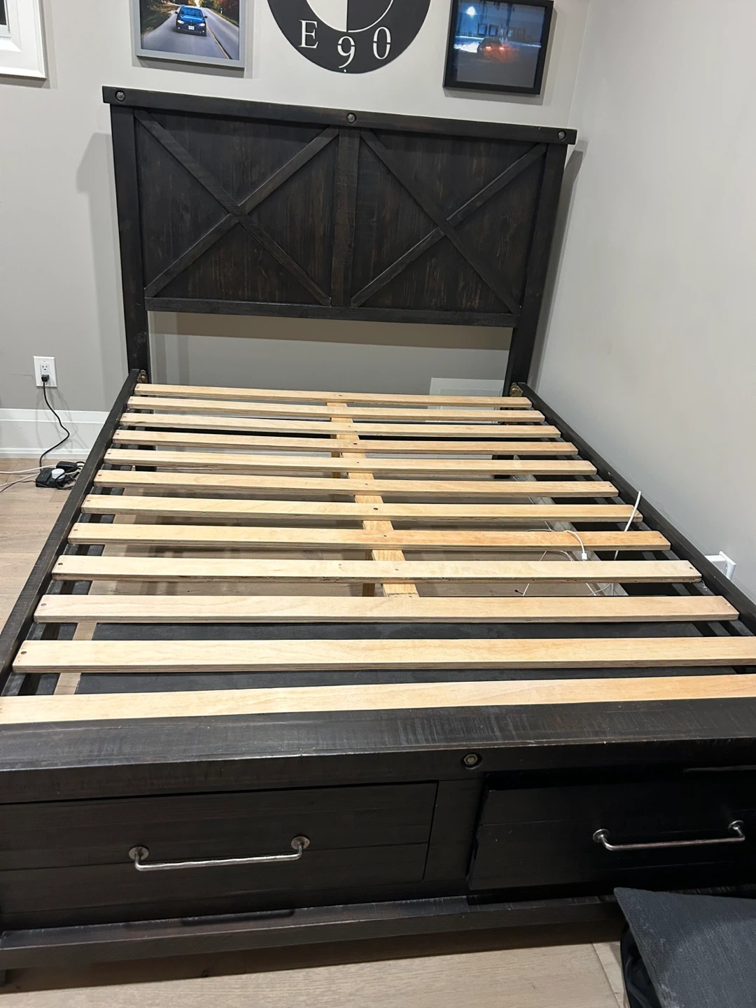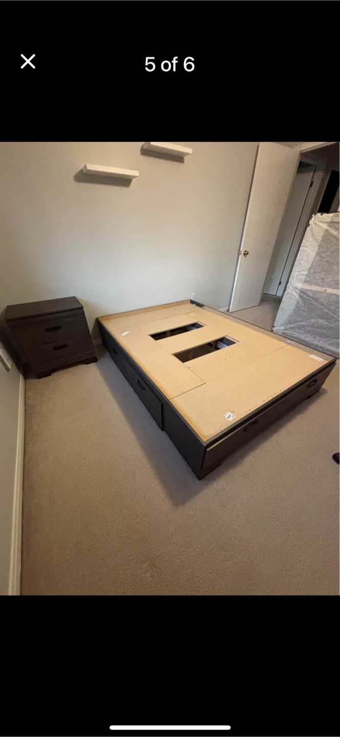 5Selling a bedroom set that includes a double size bed frame with drawers, a dresser with six drawers, and a nightstand. Perfect for adding a touch of warmth to your bedroom!