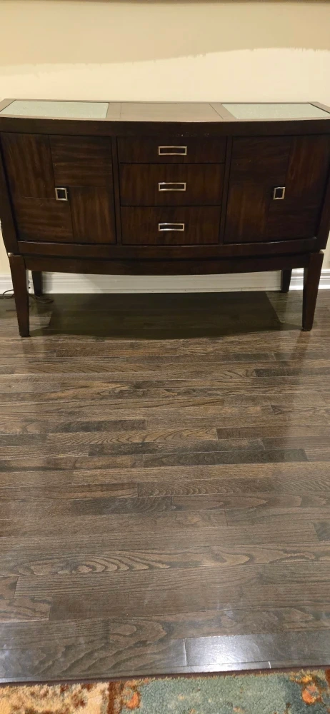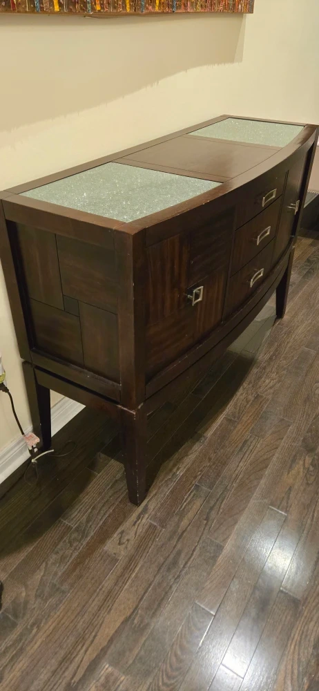 60Selling a lovely dark wood buffet, perfect for adding storage and style to your dining or living area. It features a unique glass top and ample space inside for dishes, linens, or other items. It's in great shape and ready for a new home!