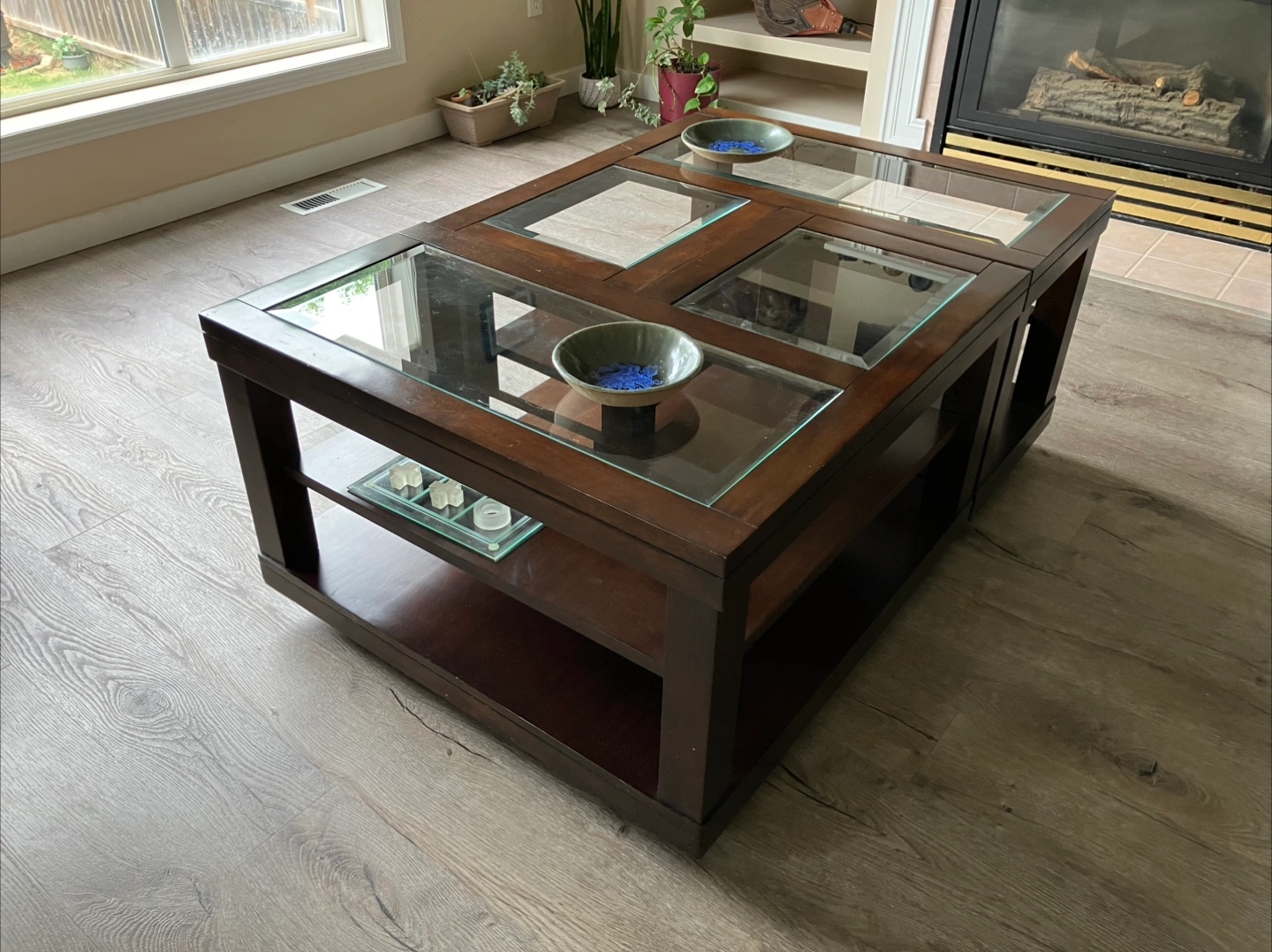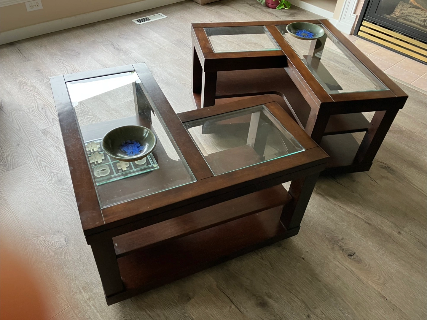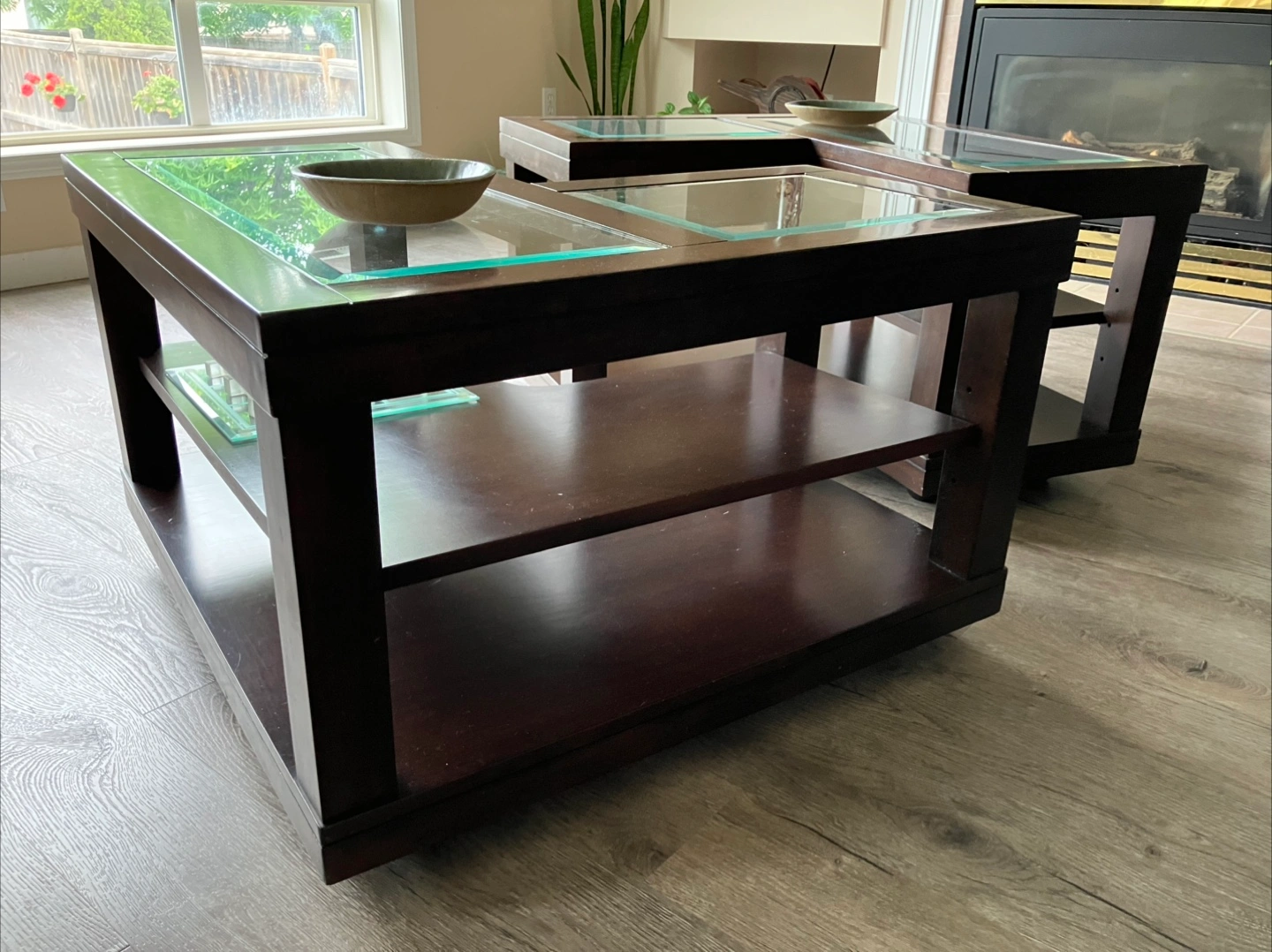 174Lovely coffee table set. Features dark wooden frames and glass top inserts. Two tables that fit together, with shelving for storage. A perfect place to relax with a book and a cup of tea.