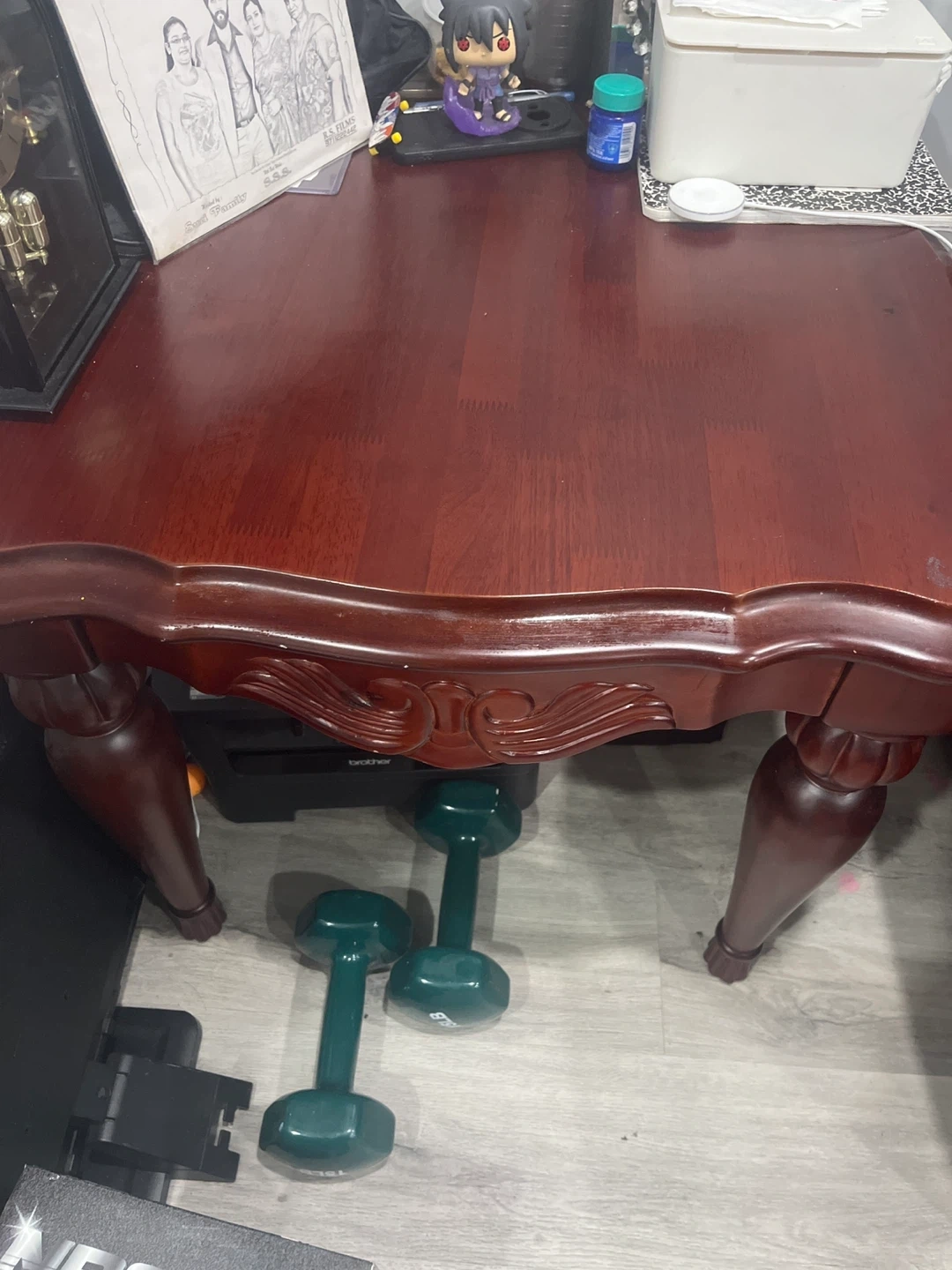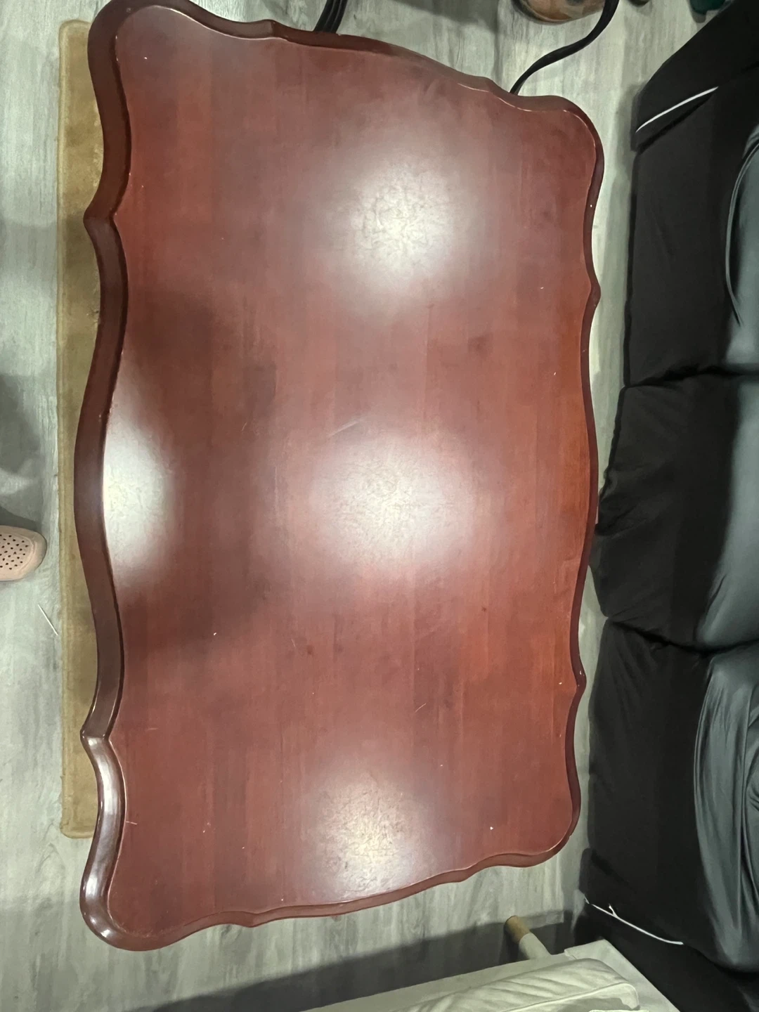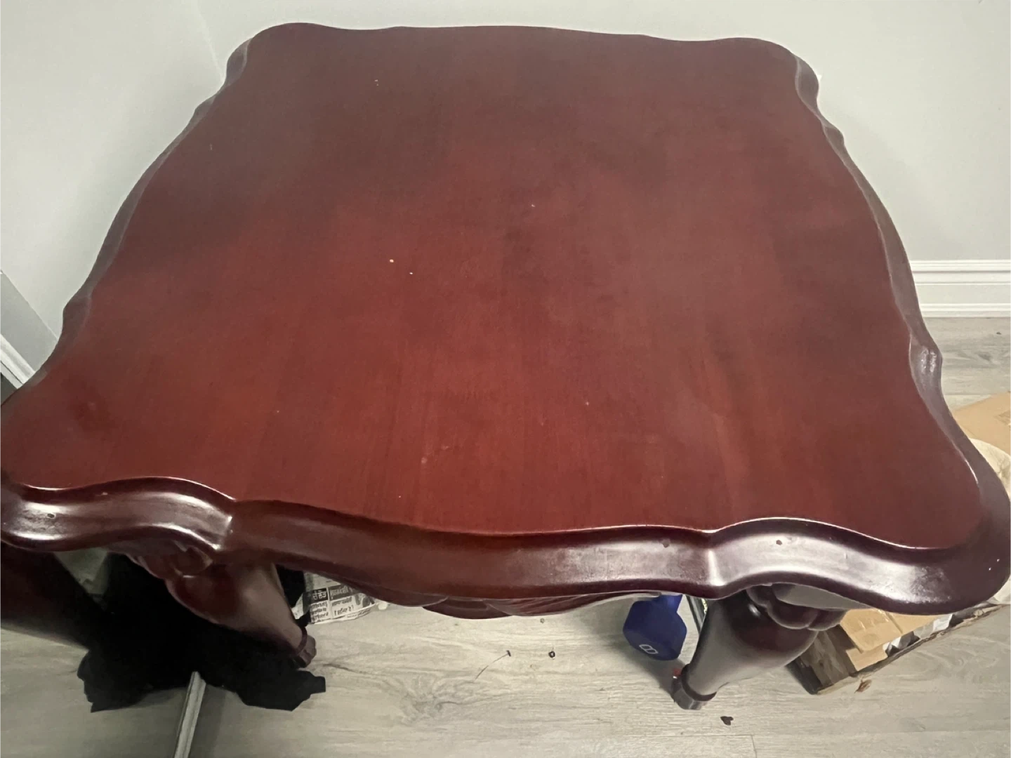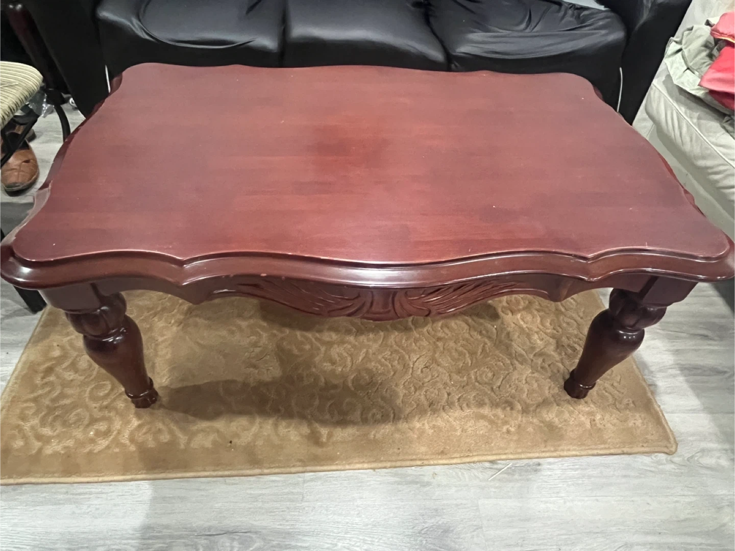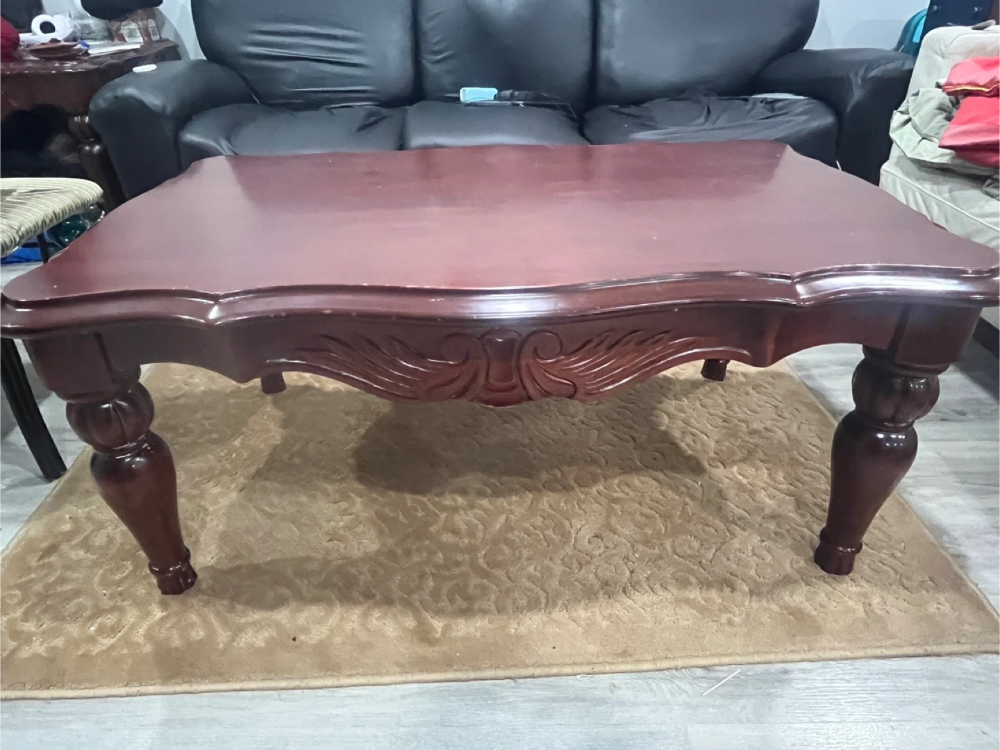 Selling 3 dark wood coffee tables,1 big and 2 small.It has a unique design with carved detailing on the legs and edges. It's in good condition and would look great in any living room! Big table for $25 Small tables$15 each