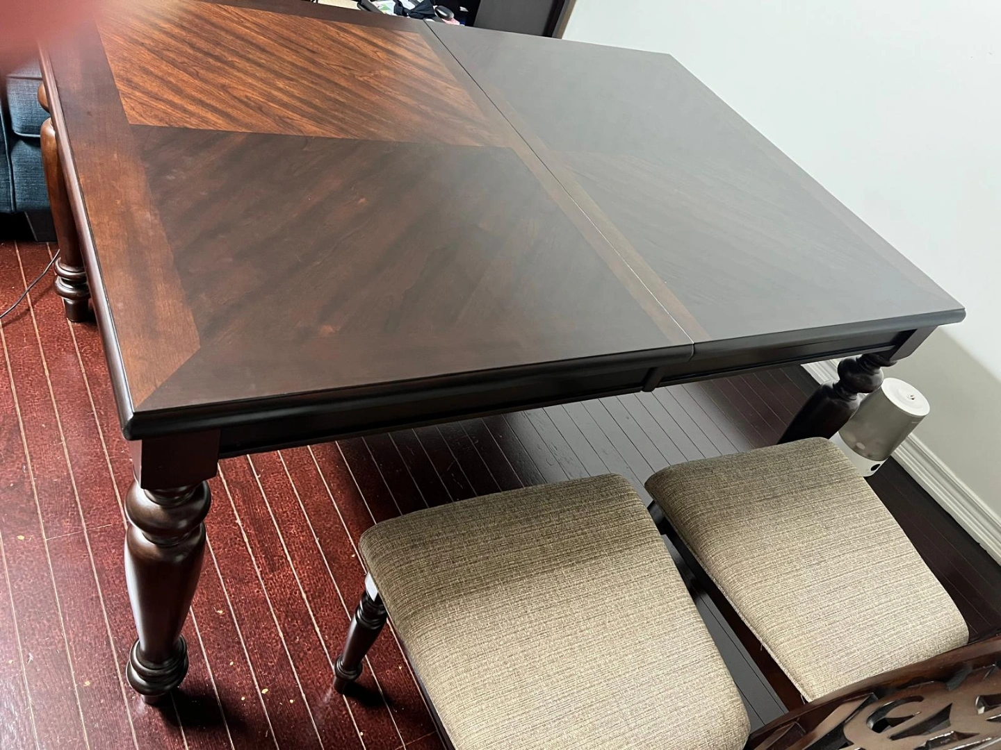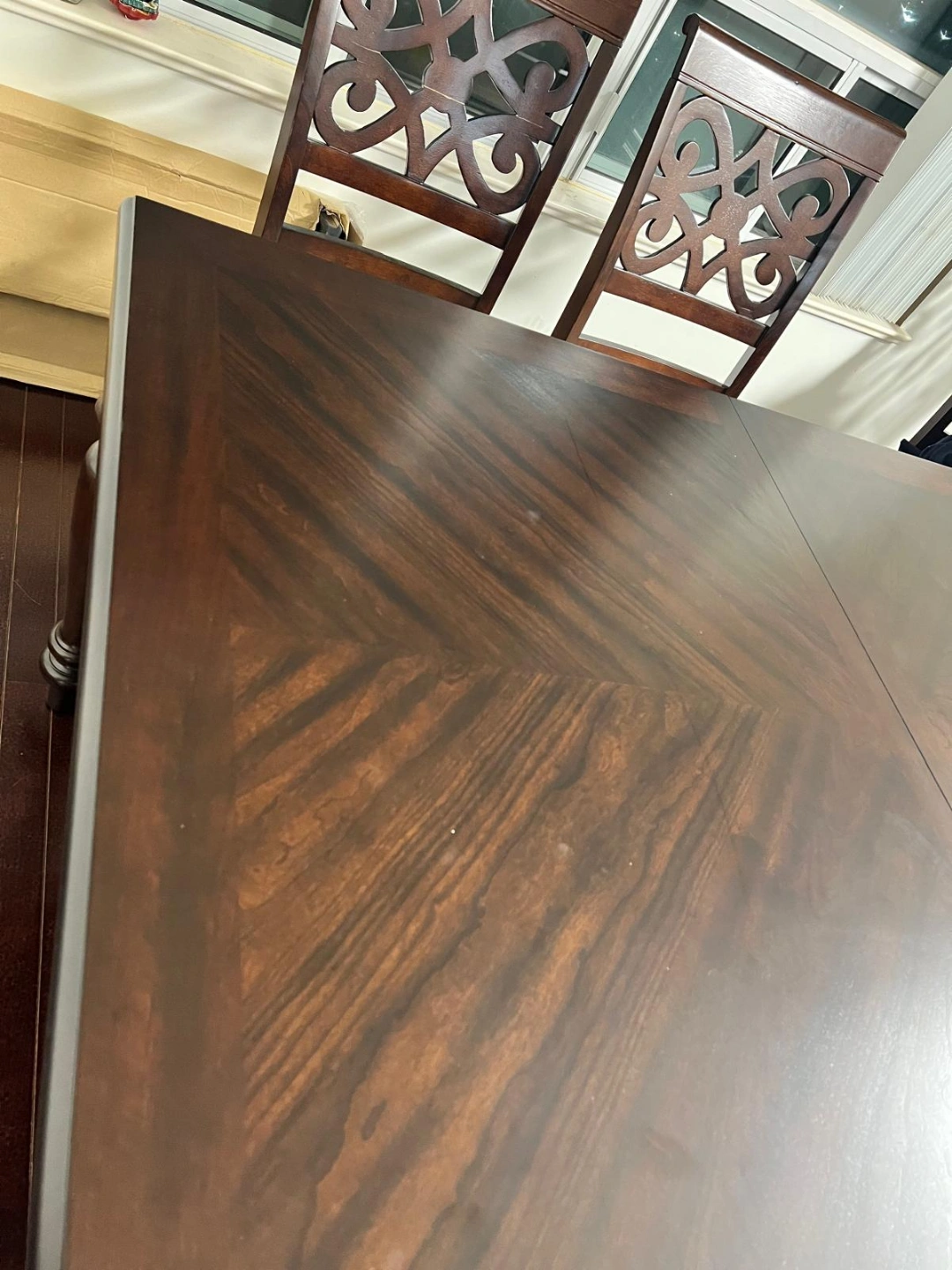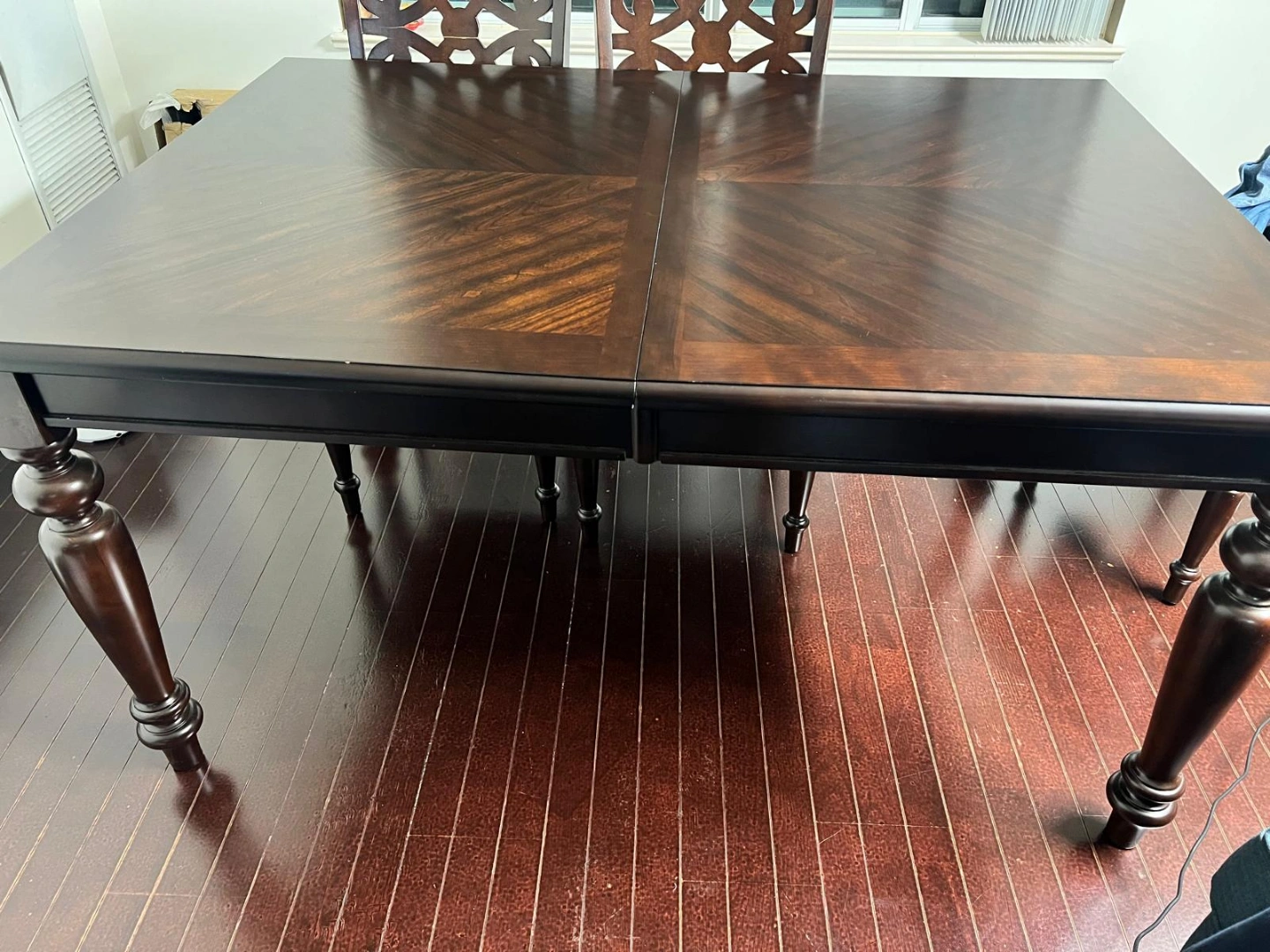 A dark wood dining table. Includes a dark wood pattern on the tabletop. A classic piece that can be used to make any meal a more enjoyable experience. Height - 1.50m Width - 1.04m with separate extension leaf.