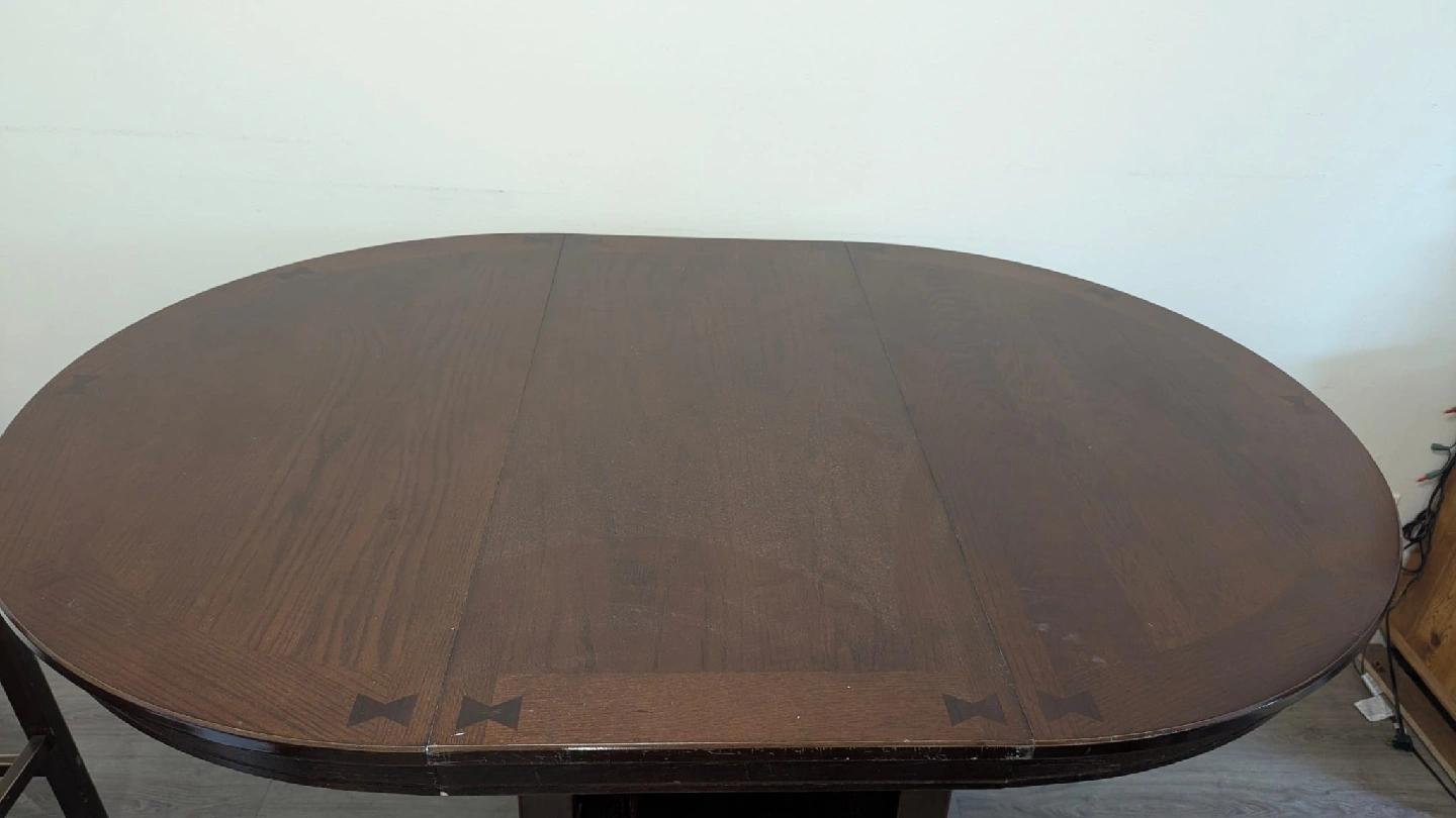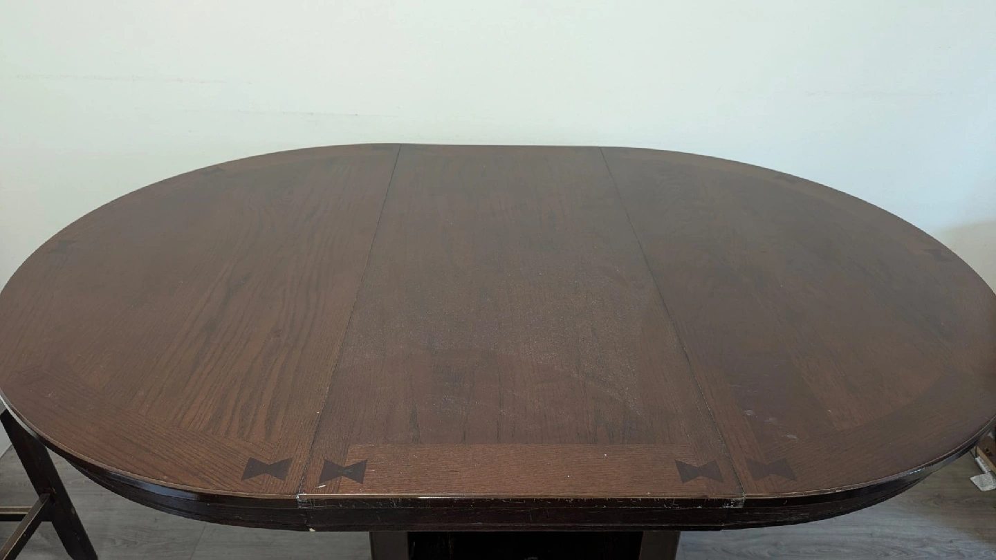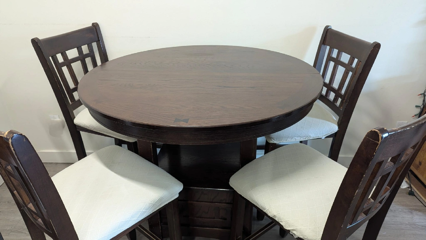 Dark wood dining table with four matching chairs. The table has a unique design with a circular shape that can be extended with an additional leaf. Perfect for a dining area with limited space. First come First serve!