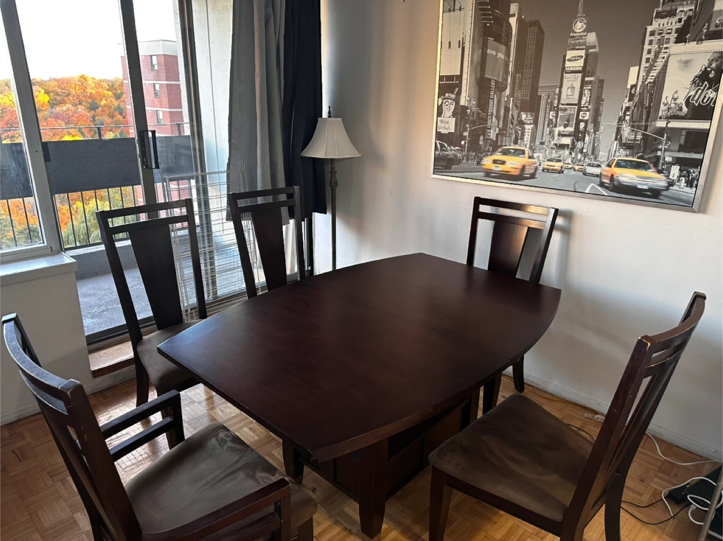 9Selling a dark wood dining table with five matching chairs. It's a great set for a family or anyone who enjoys having guests over for dinner. The table is in good condition and has a classic, timeless look that would fit well in any dining room. The chairs are sturdy and comfortable. A perfect addition to your home!