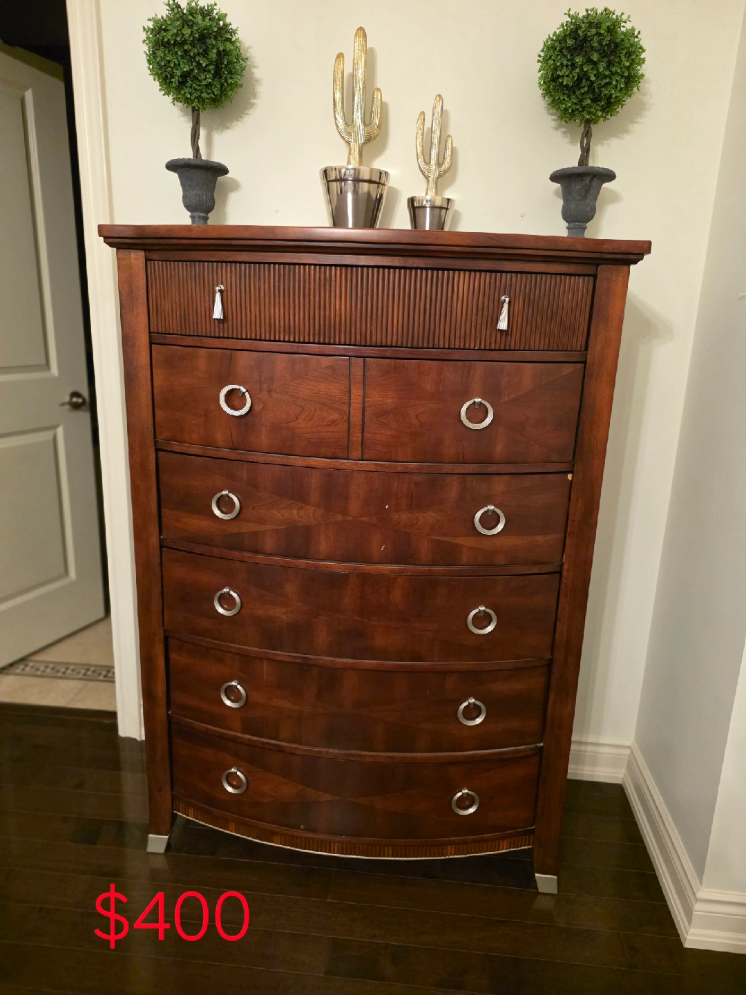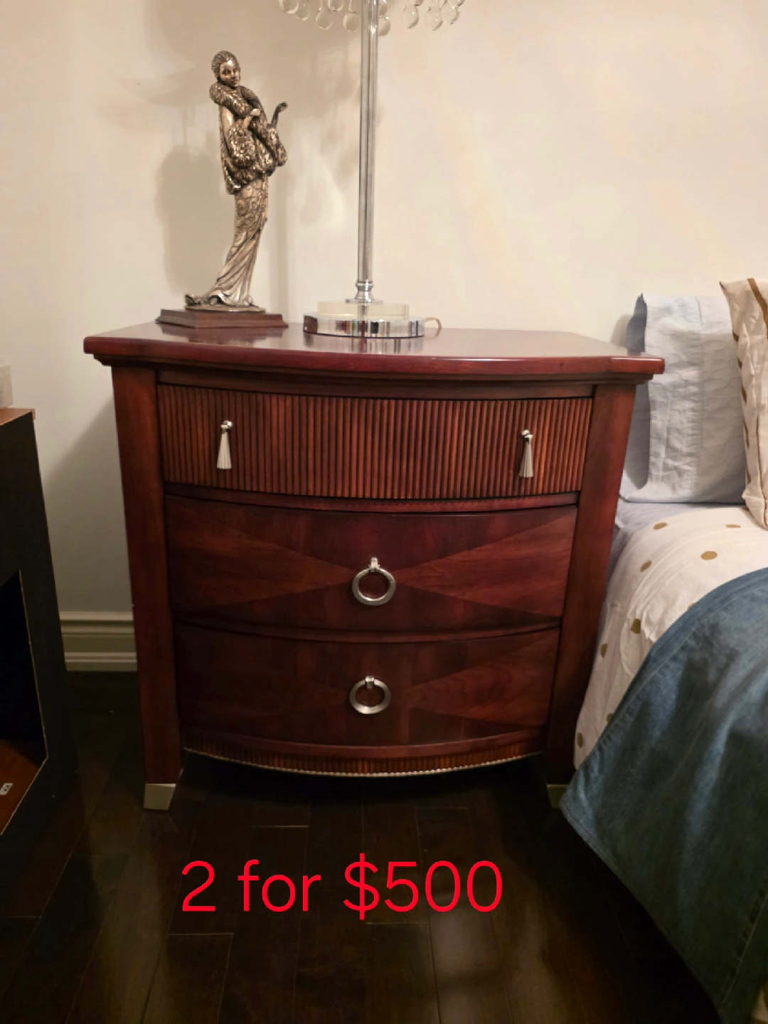 82Selling a beautiful dark wood dresser and nightstand set. The dresser has six drawers and the nightstand has three. They are in great condition and would be a lovely addition to any bedroom! prices are on the picture.