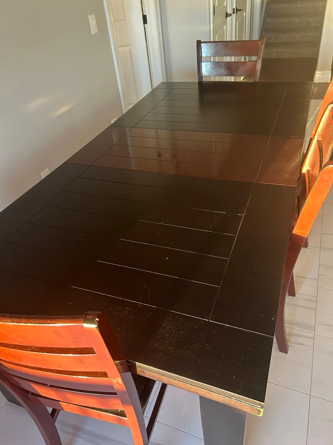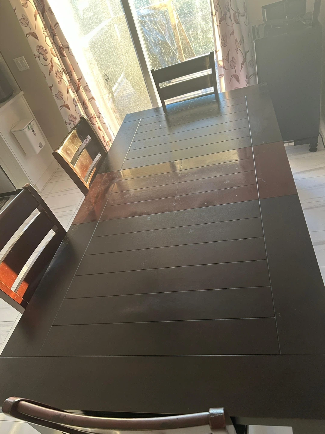 5Selling a dark wood dresser and dining table set. The dresser features multiple drawers with silver hardware. The dining table is a large rectangular table with a dark wood finish, perfect for family gatherings or dinner parties. Both pieces are in good condition and ready for a new home!