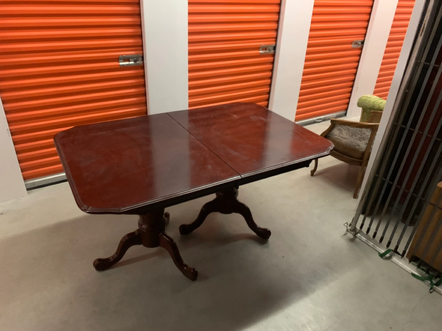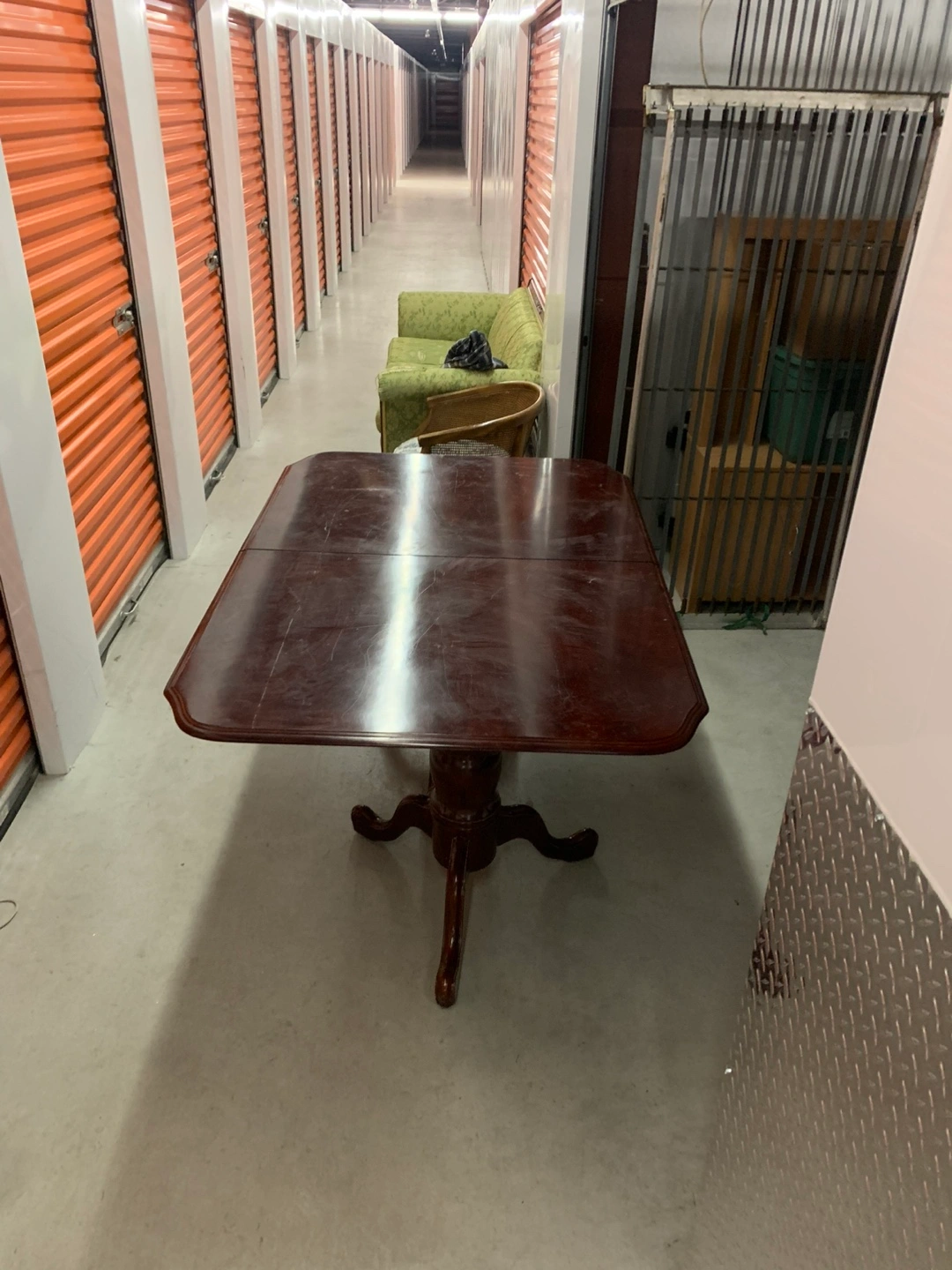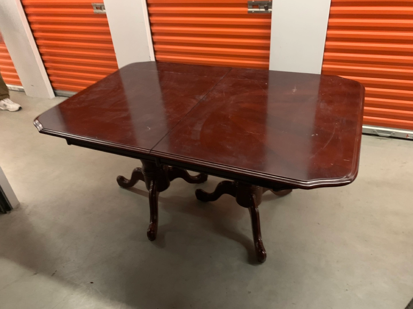 Solid dark wood dining table. Extendable leaves. Pedestal base. Good condition. Perfect for small spaces. Has two extra inserts to extend to sit 8 + people also has a couple scratches