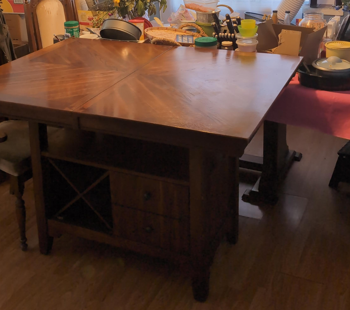 Extendable kitchen island table. Features a wine rack and two drawers. Dark wood finish. Solid wood construction.Feel free to msg me and we can work out a deal!!☺️🤝