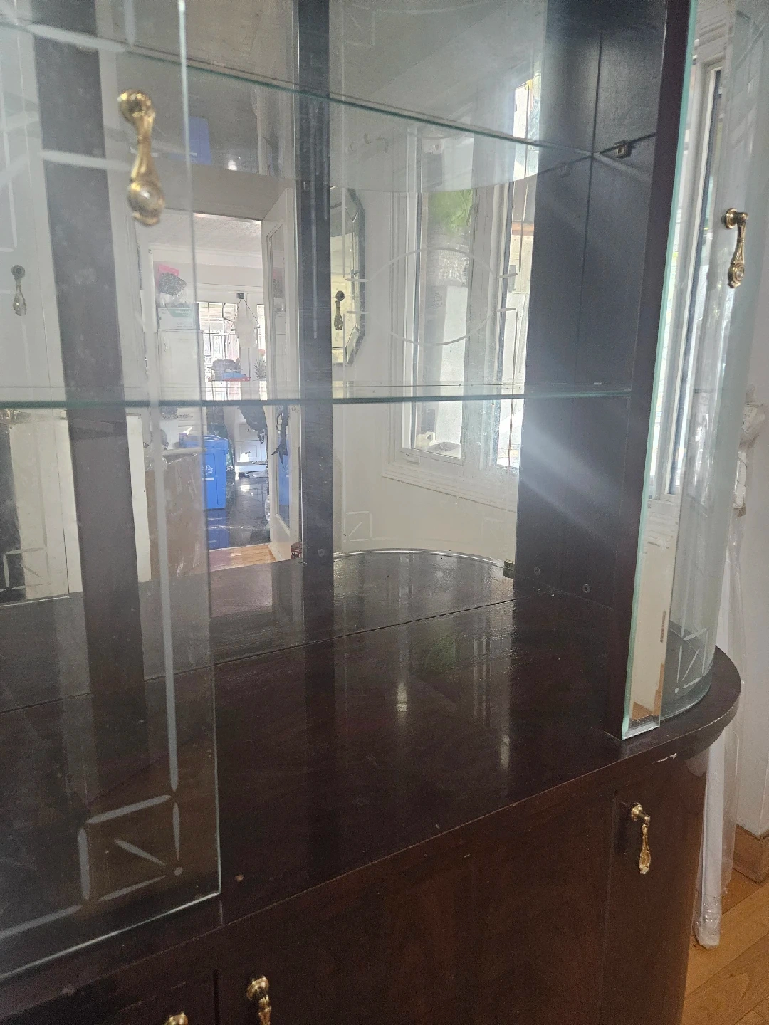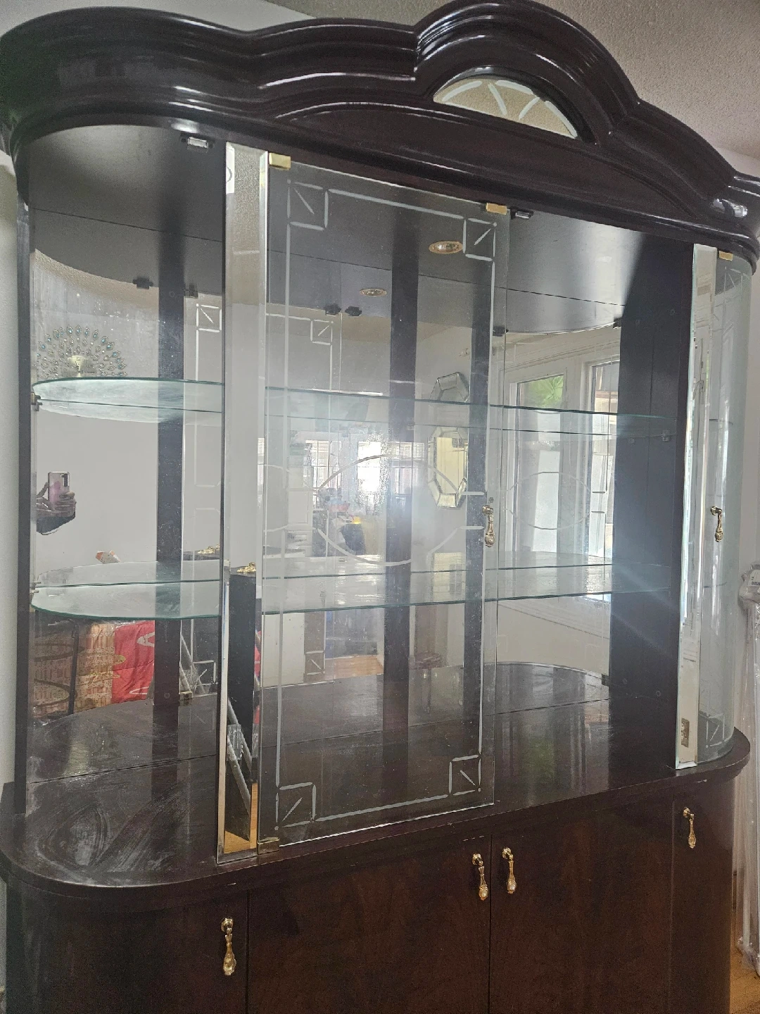 70Selling a lovely dark wood display cabinet with glass shelves and doors. It's perfect for showcasing your favourite items or storing glassware in style! The cabinet features elegant detailing and ample storage space, making it a functional and beautiful addition to any home. 2 glass peice missing.
